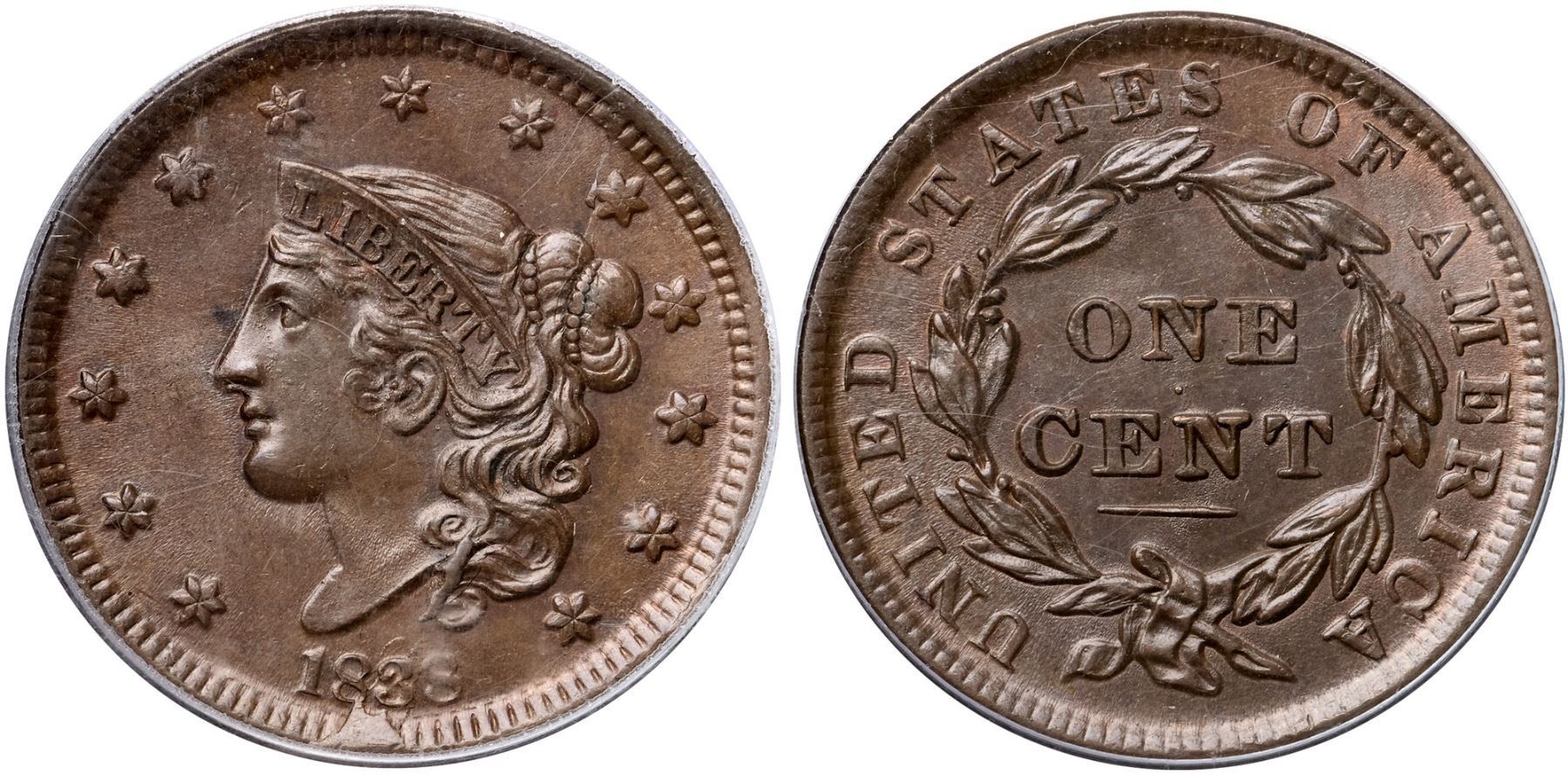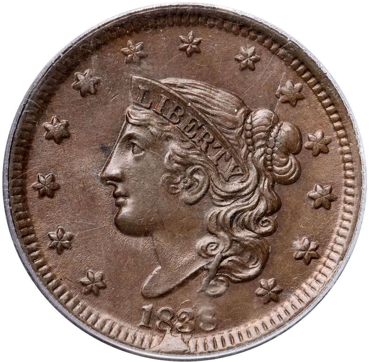 1838 N-4 R2 PCGS graded MS66 BrownLustrous brown and light olive. The surfaces are satiny and the only marks are a small spot of darker toning (not carbon) in the field at the middle of the nose and two tiny ticks right of star 5. LDS, die state g, with a cud break from the rim under the 83 reaching up to the base of the 8 but not quite touching the 3. (In the latest state, this cud touches the 3.) Fine die rust covers much of the portrait, especially on the face, leaving a sandpaper texture. A very nice example of this interesting die state. Called MS62 and tied for CC#6 in the Noyes census, his photo #34489. Our grade is MS62+, close to MS63.Certificate Number: 37189.66/13092970Pedigree: Ex Douglas F. Bird 5/5/1996-R. E. "Ted" Naftzger, Jr.-Naftzger Estate, McCawley & Grellman Auctions/Goldbergs 2/1/2009:414-Terry S. Denman Collection