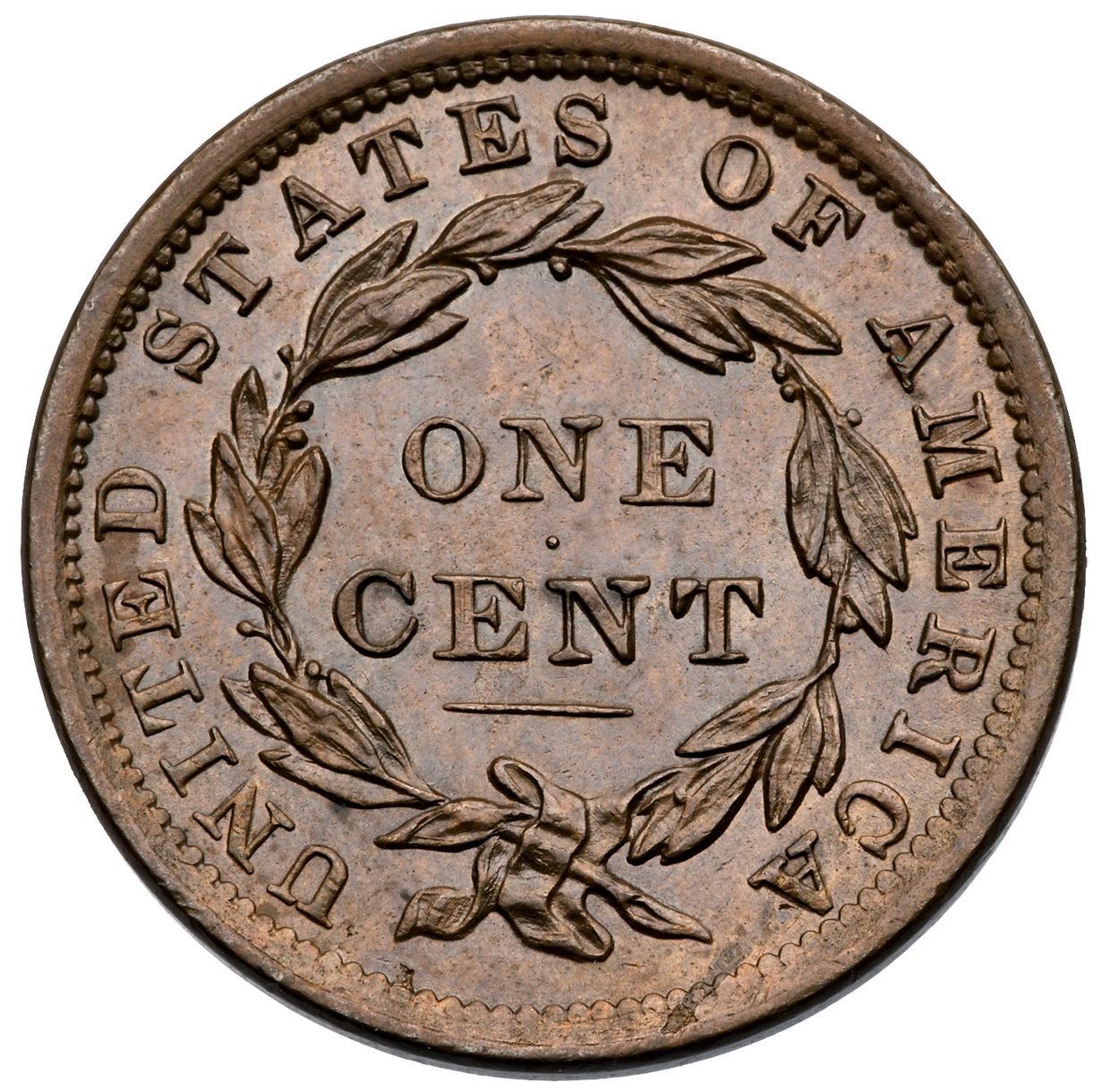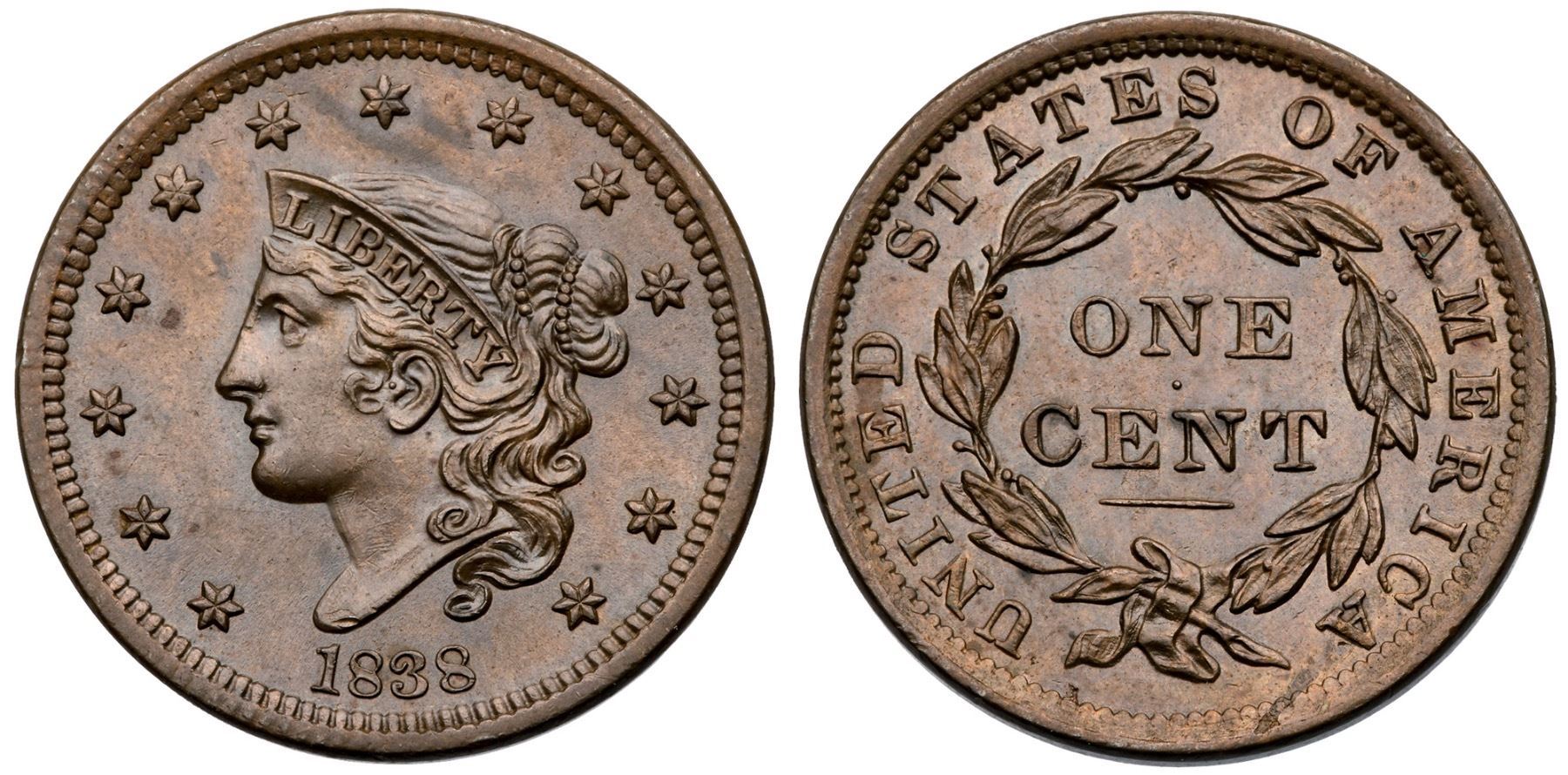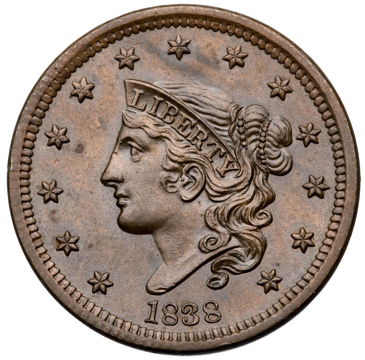 1838 N-9 R3 AU58+Lustrous medium brown and light olive with a couple streaks of slightly darker steel brown at star 7. Sharply struck with very nice eye appeal. Looks mint state but there is a trace of friction on the very highest points of the devices. The only marks are a dull nick on the bust tip and two small planchet flakes in the dentils at the bottom of the reverse (as struck). EDS, state a, with smooth fields and "phantom dentils" on the rim from under the 1 to star 1 and from star 3 to above star 5. Similar "phantom dentils" show on early strikes of the N-6 variety of this year, and what caused them is a mystery. The fields on the obverse are very slightly reflective.Certificate Number: Pedigree: Ex Chris McCawley-Dennis Mendelson, Superior 2/3/1991:555-March Wells, McCawley & Grellman Auctions/Superior 2/7/2000:2046-Terry S. Denman Collection