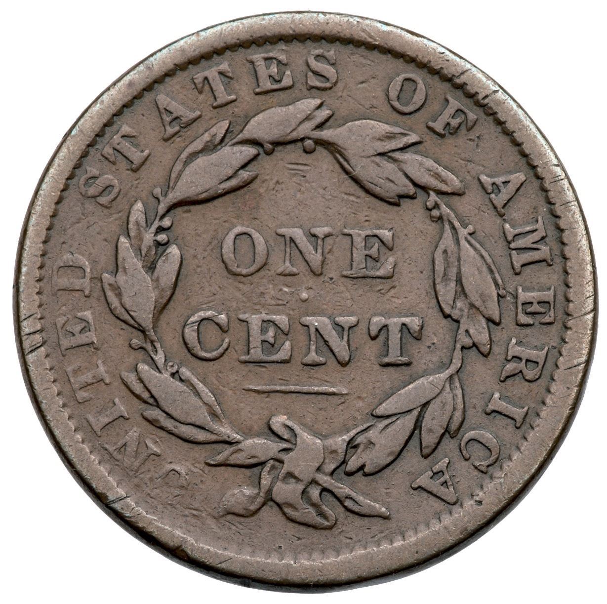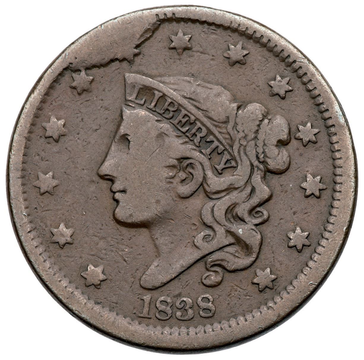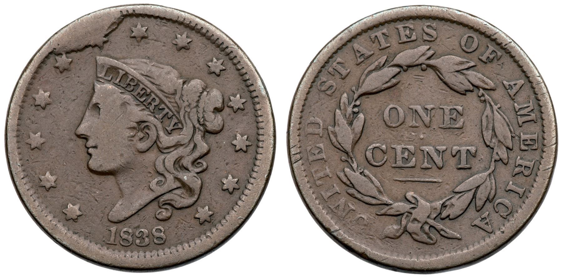 1838 N-14 R7 (as a die state) F12Glossy light chocolate brown and steel. The surfaces are smooth and this cent has nice eye appeal for the grade. The notable marks are some light nicks scattered about both sides including three sharp ones on the rim at the E in UNITED. Extremely rare terminal die state, die state c, with a large cud break at star 6 reaching star 5 and the dentils above star 7. The earlier dentil fusing between stars 7 & 8 is visible. Second finest of this very popular die state. Called F12 and CC#2 behind a slightly finer example of those few known with the large cud break in the Noyes census, his photo #39377.Certificate Number: Pedigree: Ex Denis W. Loring 1976-R. S. "Robbie" Brown, Jr., Superior 9/30/1986:880-Dennis Mendelson, Superior 2/3/1991:568-bought back, then sold privately on 5/27/1991 to March Wells, McCawley & Grellman Auctions/Superior 2/7/2000:2055-Daniel W. Holmes, Jr., McCawley & Grellman Auctions/Goldbergs 5/30/2010:535-Chris McCawley 4/19/2012-Terry S. Denman Collection