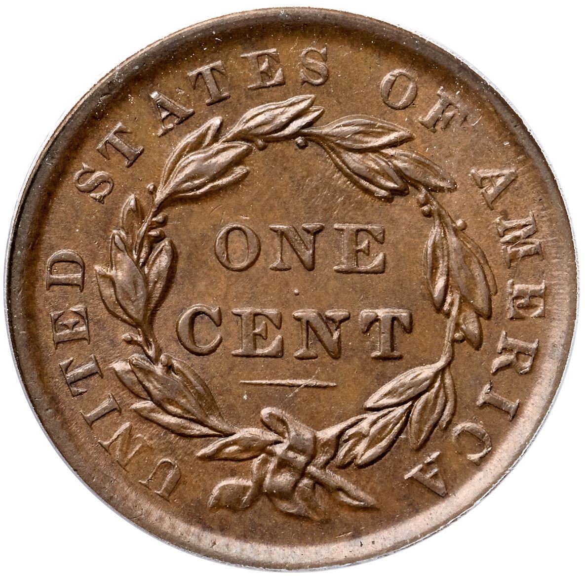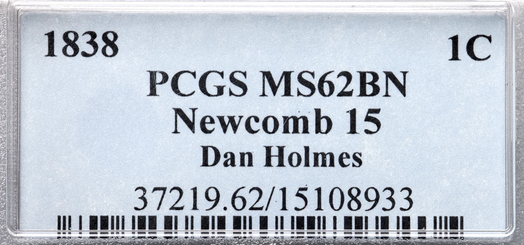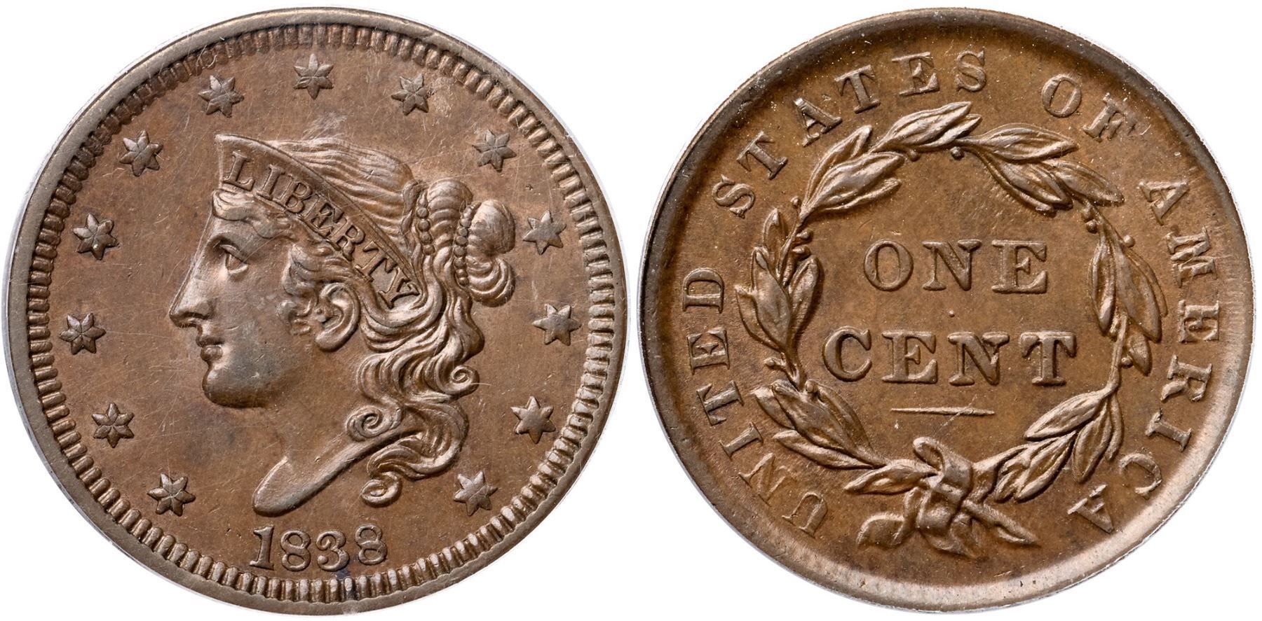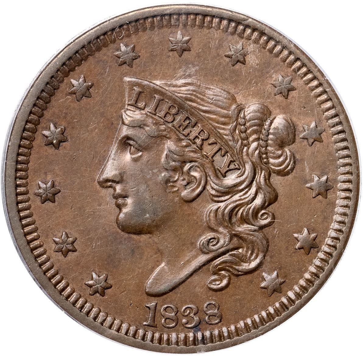 1838 N-15 R5- PCGS graded MS62 BrownVery attractive frosty medium brown with slightly darker steel brown toning on the highpoints. Frosty mint luster covers the protected areas on both sides and this cent has really nice eye appeal. The only notable marks are a small spot of reddish olive toning at the dentils under the 3, a tiny nick on the rim at star 8, and a light nick slanting through the M & E in AMERICA. MDS, the only die state for the variety. The obverse die is new and sharp while the reverse die is heavily worn from use in the earlier N-11 marriage. Called AU55 and CC#1 in the Bland census. Noyes says EF45 and CC#2, his photo #25835. Our grade is AU50+. This is the discovery coin for the die variety, first identified by Walter Breen in 1959, and it is the Wright plate coin as well.Certificate Number: 37219.62/15108933Pedigree: Ex Walter Breen 1959-Robert Bashlow 8/24/1959-Floyd T. Starr, Stack’s 6/13/1984:373 (as AU55)-Wesley A. Rasmussen, Heritage Auctions 1/13/2005:3709 (as AU55)-Daniel W. Holmes, Jr., McCawley & Grellman Auctions/Goldbergs 5/30/2010:536-Chris McCawley-Terry S. Denman Collection