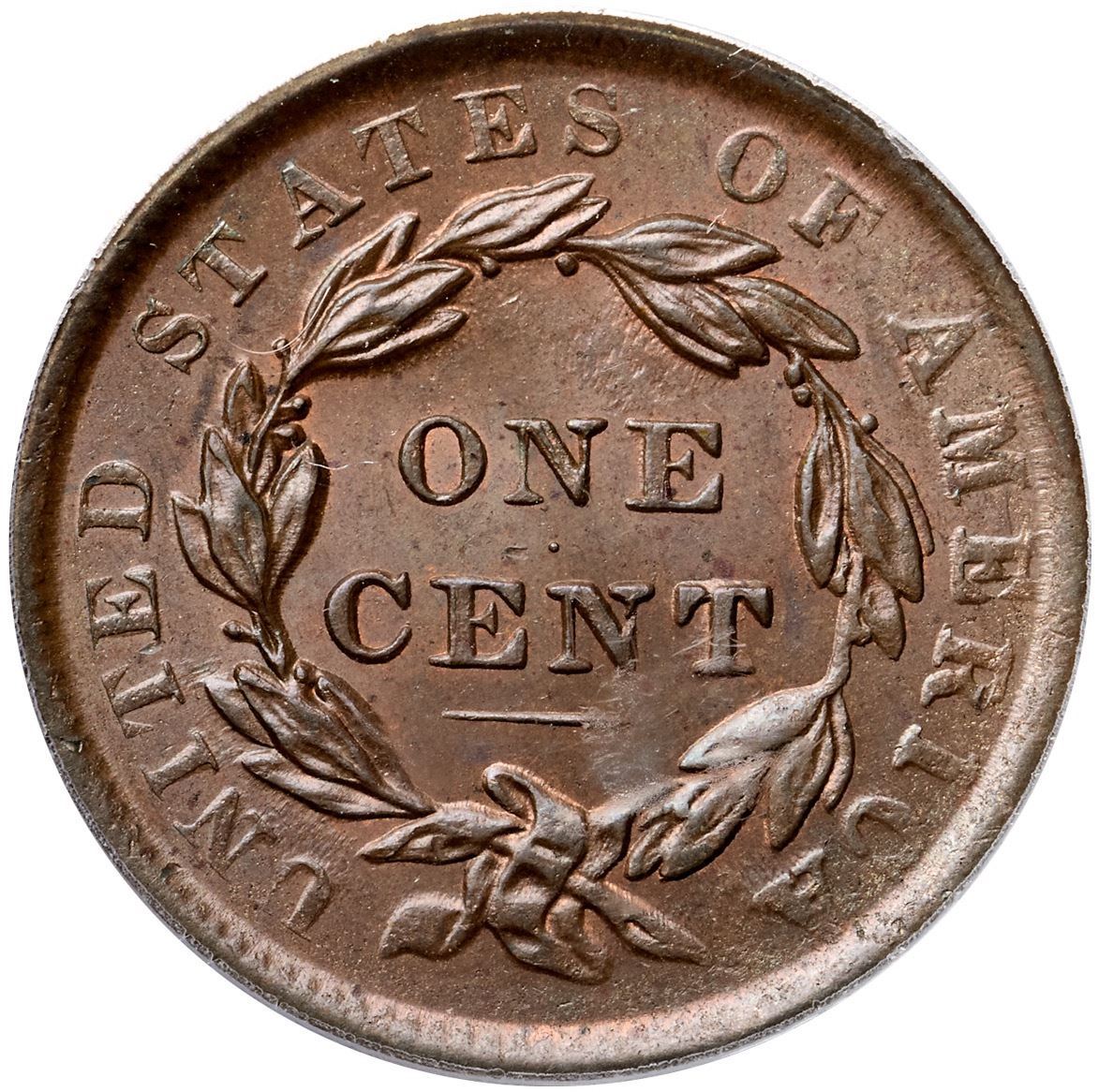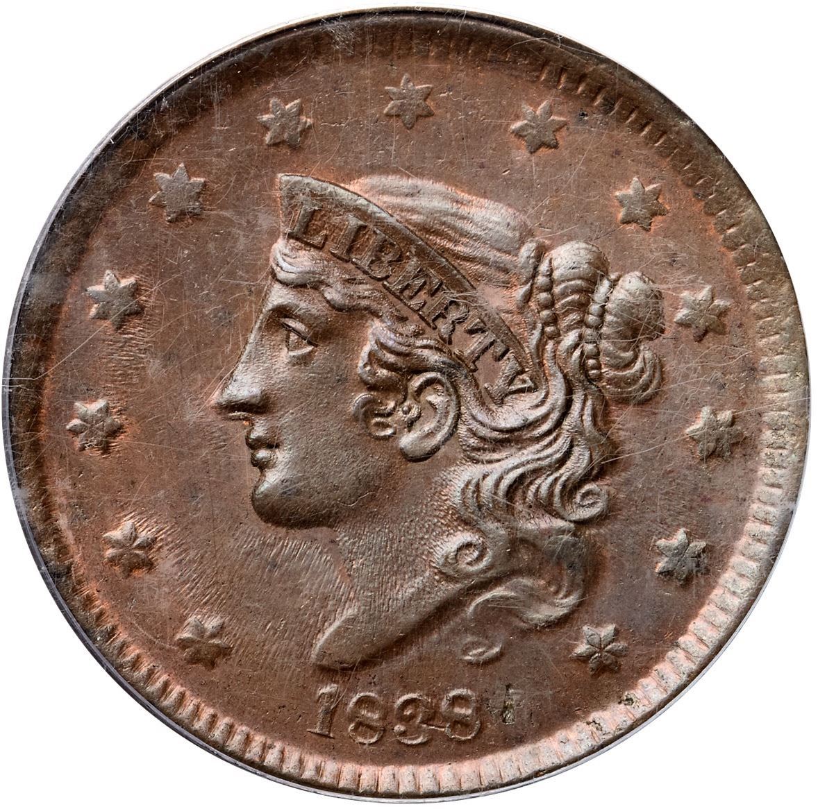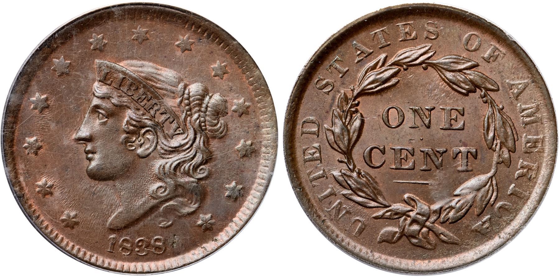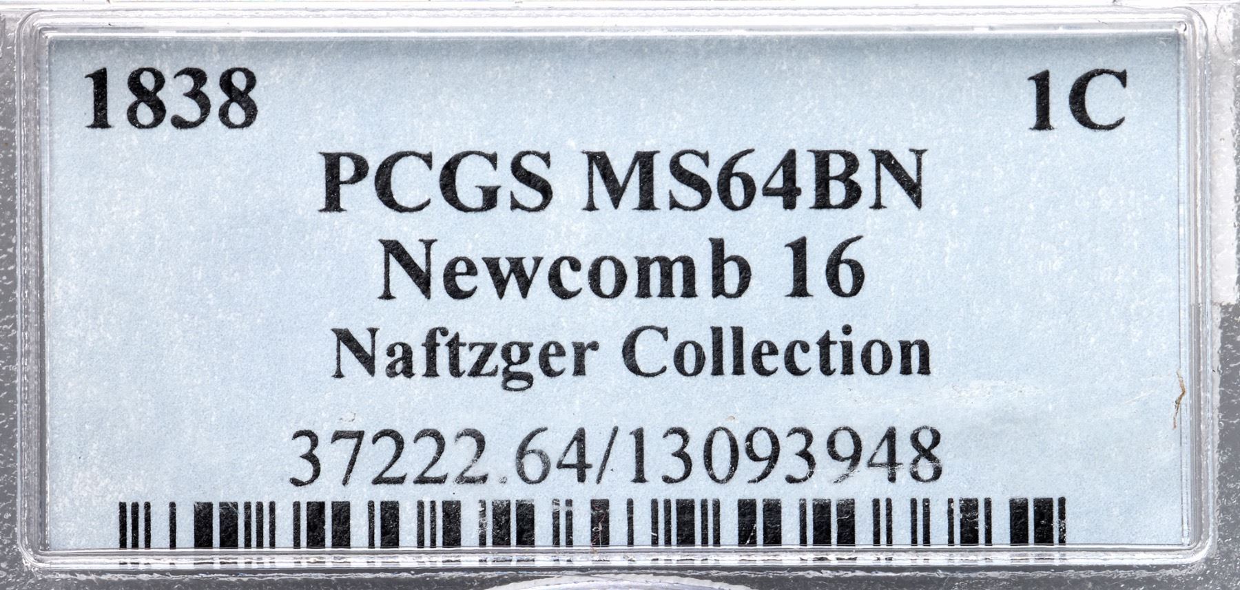 1838 N-16 R5- PCGS graded MS64 BrownLustrous steel brown and light chocolate with slightly faded mint color in the protected areas. A small planchet chip just right of the date, another thin one connecting the lower parts of the 3 & 8, and two tiny flakes in the dentils under star 13 (all as struck) are the only notable defects. Satiny mint frost covers this cent and the eye appeal is excellent. The usual die state with both dies excessively worn and lapped to reduce roughness prior to use in this short-lived marriage. Some of the die roughness remains but most of the field on both sides is smooth. The inside of the ear is flat and slightly reflective thanks to the excessive die polishing. Called MS60 and tied for CC#1 in the Bland census. Noyes says MS60 net AU55 and CC#4, his photo #20537. Our grade is MS60+. (The holder is scuffed.)Certificate Number: 37222.64/13093948Pedigree: Ex Stack's 5/1938:599 (misattributed as N-8)-Philip Van Cleave, Kagin's 1/30/1986:5378-R. E. "Ted" Naftzger, Jr.-Naftzger Estate, McCawley & Grellman Auctions/Goldbergs 2/1/2009:436-Chris McCawley-Terry S. Denman Collection