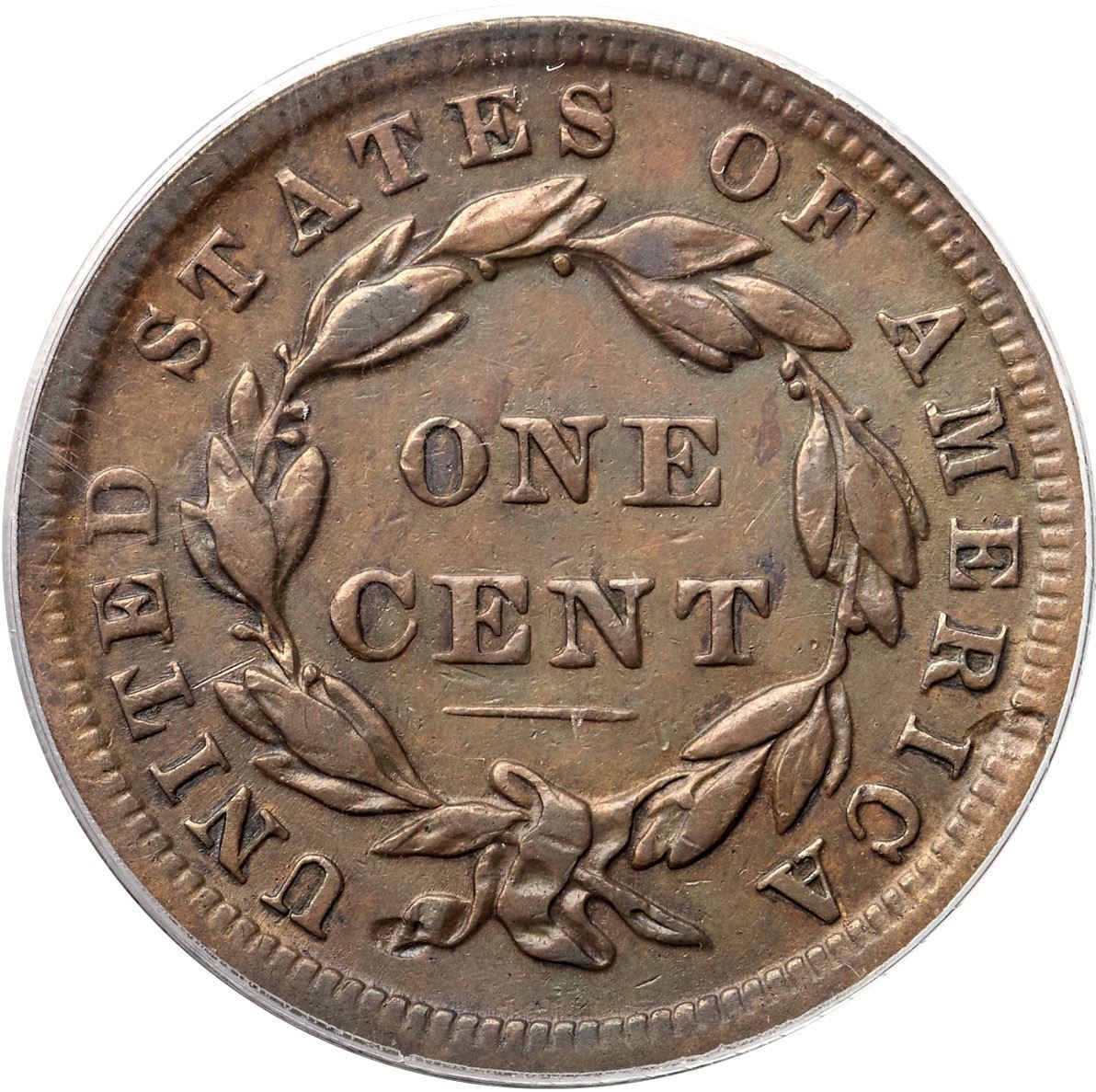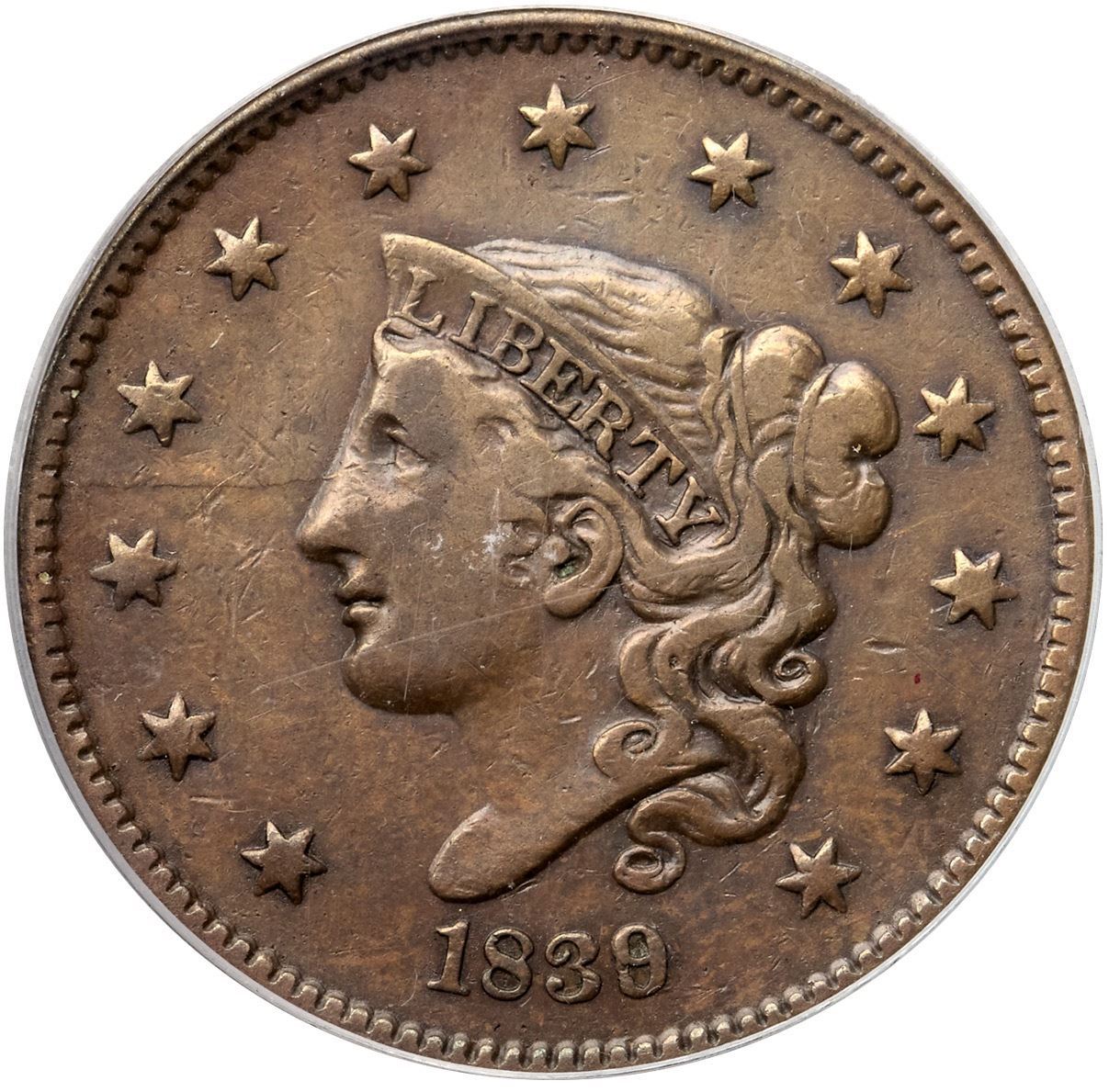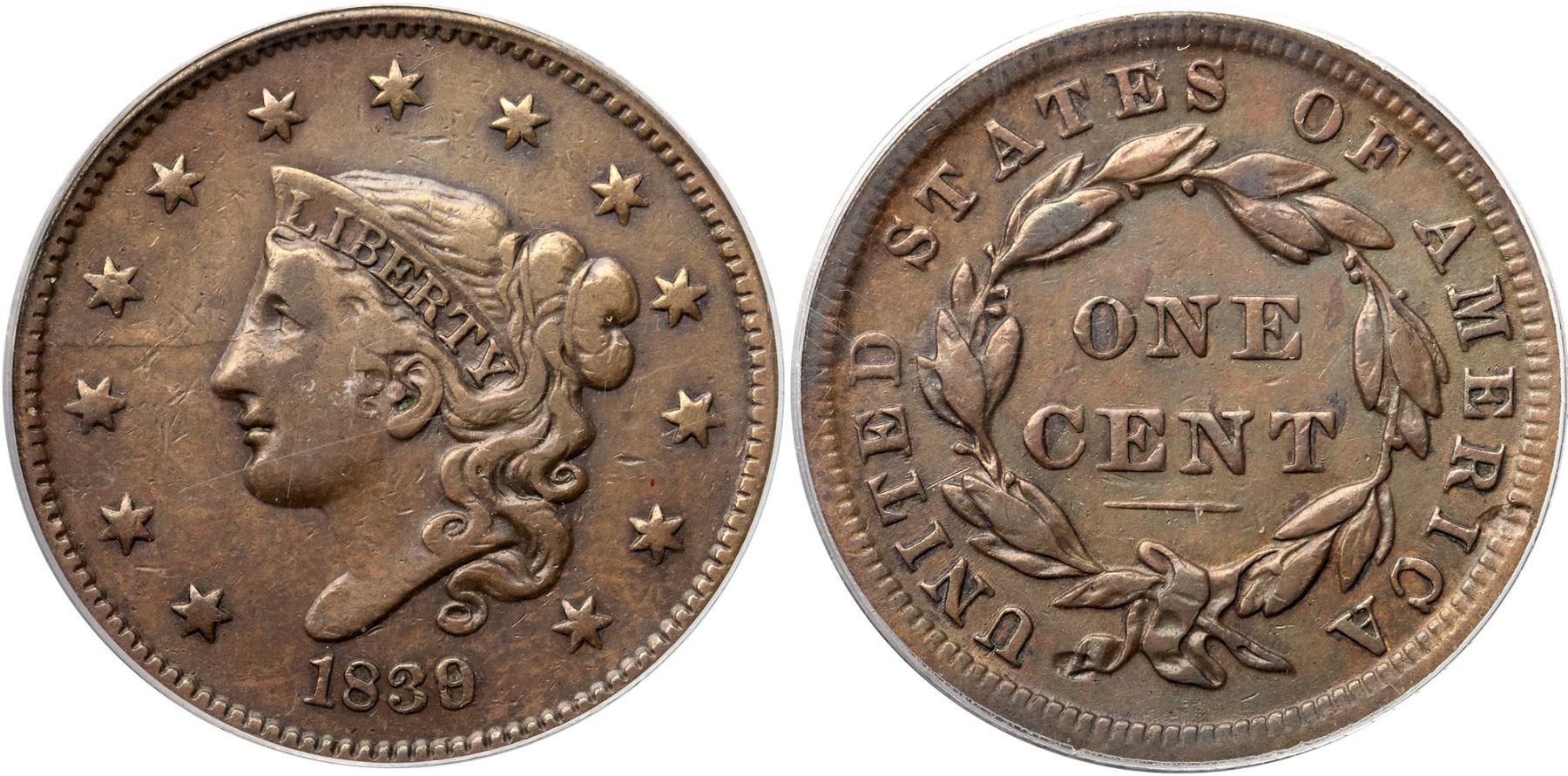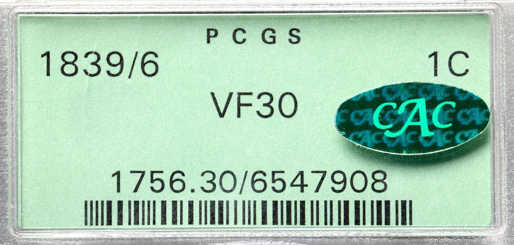1839/6 N-1 R3+ Overdate 9 over 6, PCGS graded VF30, CAC ApprovedGlossy light steel brown blending to medium olive in protected areas with medium steel brown on the highpoints. Smooth with minor contact marks including some small nicks in the field before the face and a light nick under the right side of star7. The best identifying marks are a planchet flake in the dentils at the left top of the I in AMERICA and another on the end of the wreath ribbon (both as struck). MDS, die state b late. A die crack from the dentils over star 3 to the nose is clear, but there is no crack on the other side of the portrait. The overdate feature is clear. Our grade is VF20. A very nice mid-grade example of this popular "Redbook" overdate. Housed in an older generation holder (OGH). (The holder is lightly scuffed.)Certificate Number: 1756.30/6547908Pedigree: Acquired at the 2012 ANA-Terry S. Denman Collection