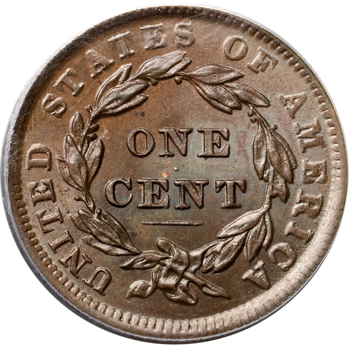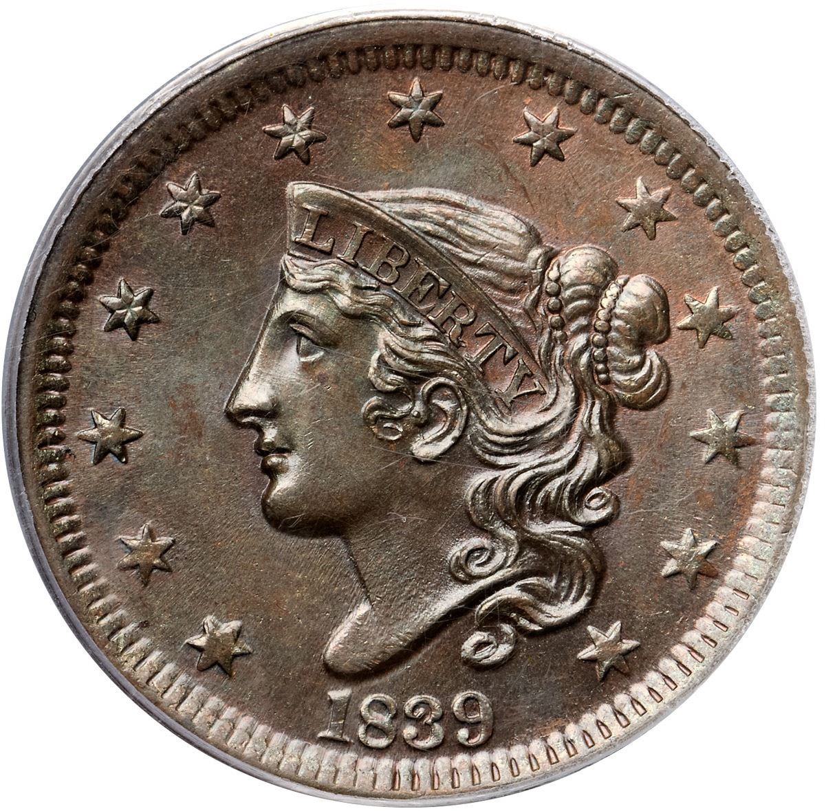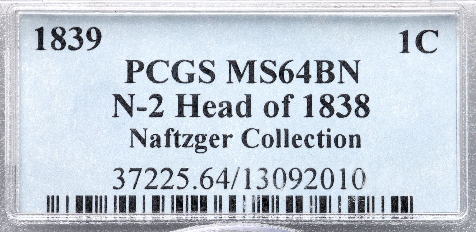 1839 N-2 R2 Head of 1838, PCGS graded MS64 BrownHighly lustrous light olive and bluish steel with lighter tan faded down from mint color in some of the protected areas, mostly on the obverse. A gem cent except for a thin scuff between stars 7 & 8 and a few microscopic ticks between stars 6 & 7. A tiny speck of bright mint color close over the right top of the E in CENT is a good identifying mark. Satiny and very attractive in spite of the minor marks. E-MDS, die state a. The die lines at RICA and STA are very dull but still visible. Called MS63 Choice and tied for CC#3 in the Noyes census, his photo #28799. Bland says MS63 and CC#5. Our grade is MS63. (The holder is scuffed.)Certificate Number: 37225.64/13092010Pedigree: Ex Captain Andrew C. Zabriskie, Henry Chapman 6/3/1909:844-Henry C. Hines-Dr. William H. Sheldon-C. Douglas Smith-Louis Helfenstein, Lester Merkin 8/14/1964:183 (as MS65)-Frank H. Masters, RARCOA 5/14/1971:257 (as MS65)-Jack Collins-Myles Z. Gerson-Jerry A. Bobbe-R. E. "Ted" Naftzger, Jr.-Naftzger Estate, McCawley & Grellman Auctions/Goldbergs 2/1/2009:442-Thomas D. Reynolds-Terry S. Denman Collection