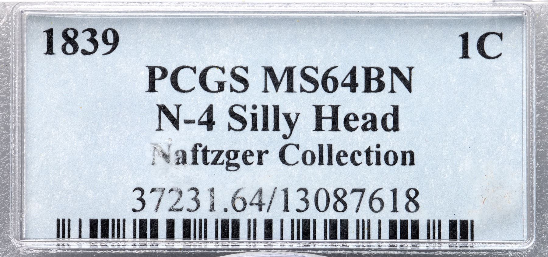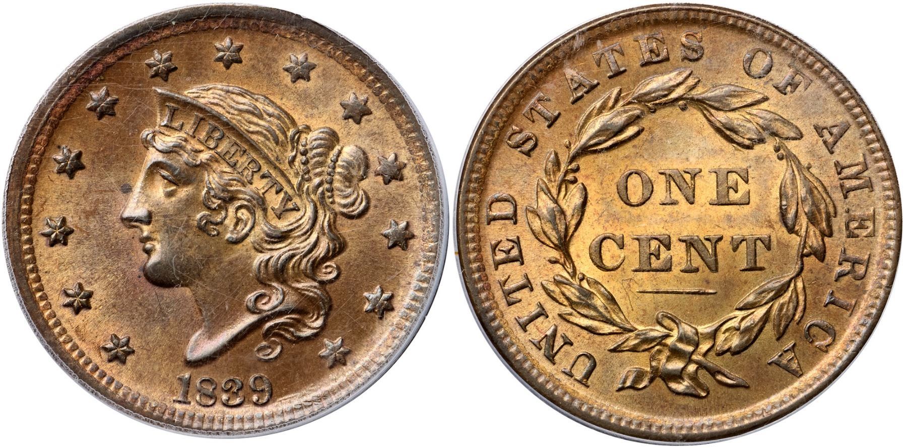 1839 N-4 R1 Silly Head, PCGS graded MS64 BrownLustrous golden light tan with light steel brown on the highpoints. A small spot of darker toning in the field close before the middle of the nose, a speck of similar toning at the upper point of star 4, and a tiny tick over the right side of the eye are the only defects, and only the spot at the nose is visible to the unaided eye. Sharply struck E-MDS with a dull horizontal dash over the dentils tips between the 3 & 9 in the date and a longer one near the dentils right of the 9. This is the Newcomb plate coin for the variety (Plate IX, Obverse 4; Plate X, Reverse A). Called MS65 and tied for CC#3 in the Bland census. Noyes says MS63 and tied for CC#4, his photo #27341. Our grade is MS63+. A spectacular "Silly Head" cent, and it comes with a great provenance. (The holder is lightly scuffed.)Certificate Number: 37231.64/13087618Pedigree: Ex Howard R. Newcomb, J. C. Morgenthau & Co., 5/16/1945:706-Floyd T. Starr, Stack's 6/13/1984:379 (as MS67, color plate)-John J. Nicholas, Superior 2/2/1992:615 (as MS65)-R. E. "Ted" Naftzger, Jr.-Naftzger Estate, McCawley & Grellman Auctions/Goldbergs 2/1/2009:448-Chris McCawley-Terry S. Denman Collection