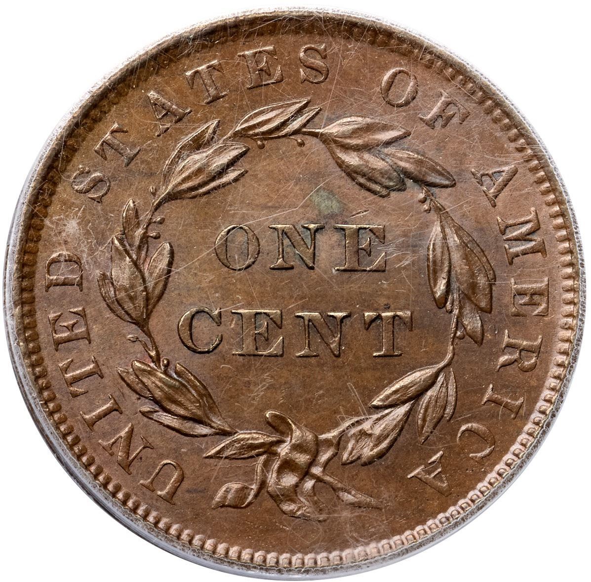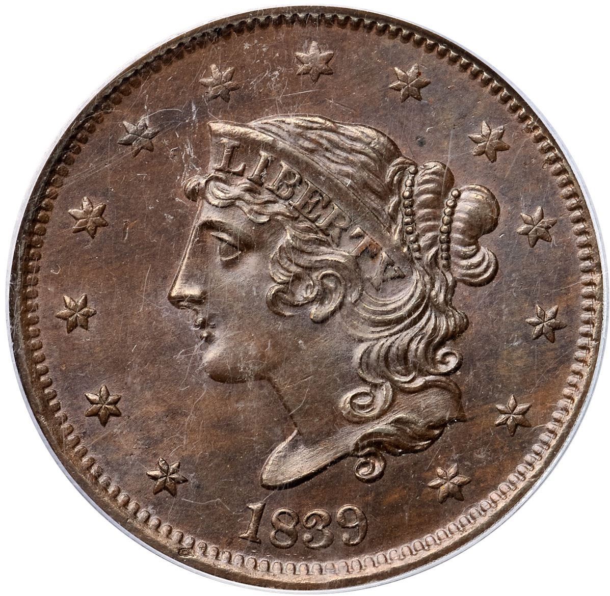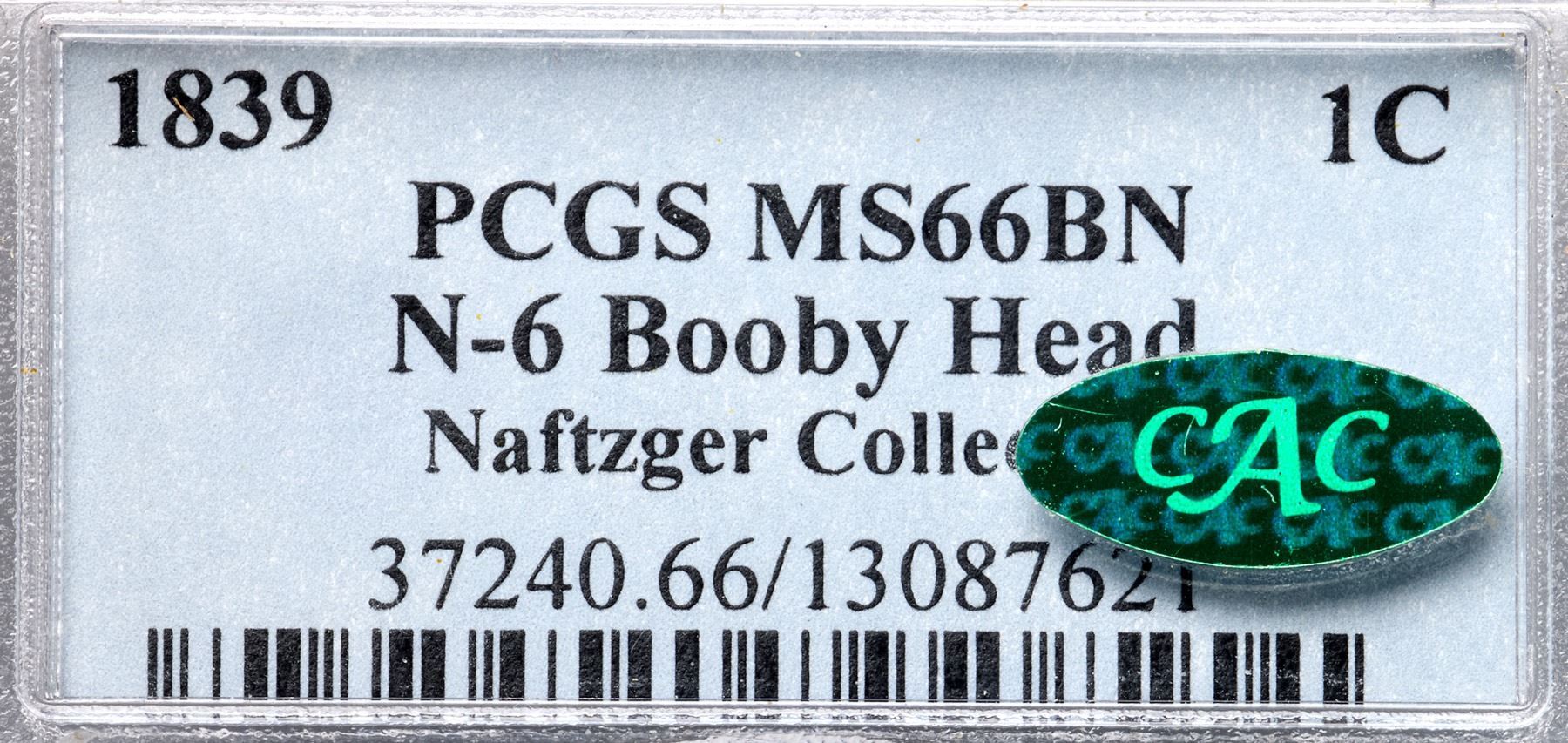 1839 N-6 R2 Booby Head, PCGS graded MS66 Brown, CAC ApprovedThe obverse is lustrous chocolate with bluish steel overtones while the reverse is a lighter shade of frosty chocolate and steel brown. Both sides are very lightly woodgrained, especially the obverse. A small splash of darker steel toning over the junction of the N & E in ONE is the only mark that catches your eye, but there is a tiny spot of carbon in the field over the hair bun and a small planchet chip in the dentils under star 1 (as struck). The surfaces are satiny and this cent has excellent eye appeal. Nicely struck LDS, die state d, with a fine die crack through the D in UNITED to the wreath where it meanders around clockwise until it exits into the bottom of the U in UNITED. Called MS61 and tied for CC#2 in the Noyes census, his photo #21870. Bland says MS60+ and CC#3. Our grade is MS63. (The holder is scuffed and scratched.)Certificate Number: 37240.66/13087621Pedigree: Ex a Seattle coin shop 2/1973-Del Bland 11/1973-C. Douglas Smith 5/16/1974-Jerry A. Bobbe-R. E. "Ted" Naftzger, Jr.-Naftzger Estate, McCawley & Grellman Auctions/Goldbergs 2/1/2009:453-Legend Numismatics-Terry S. Denman Collection
