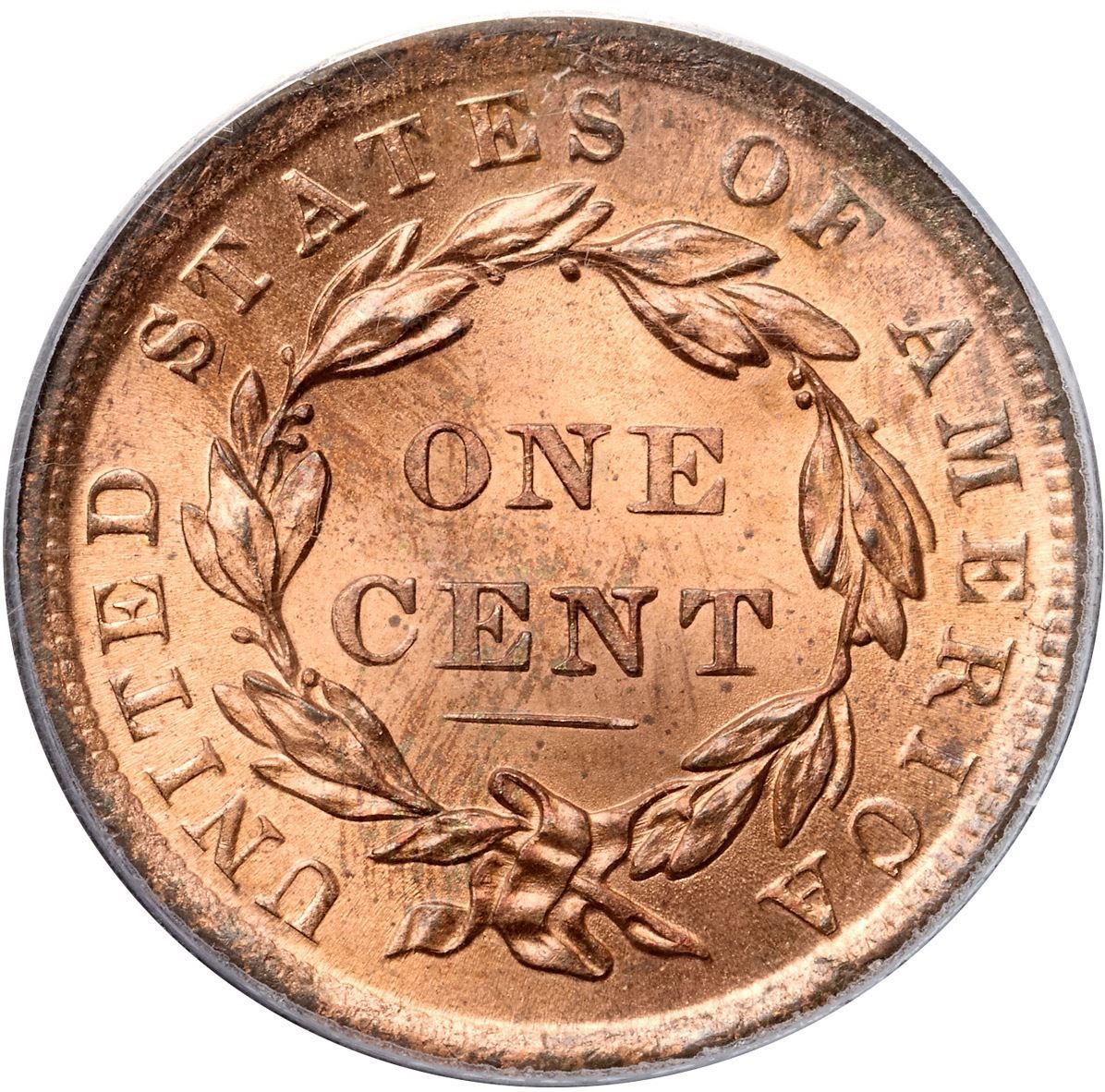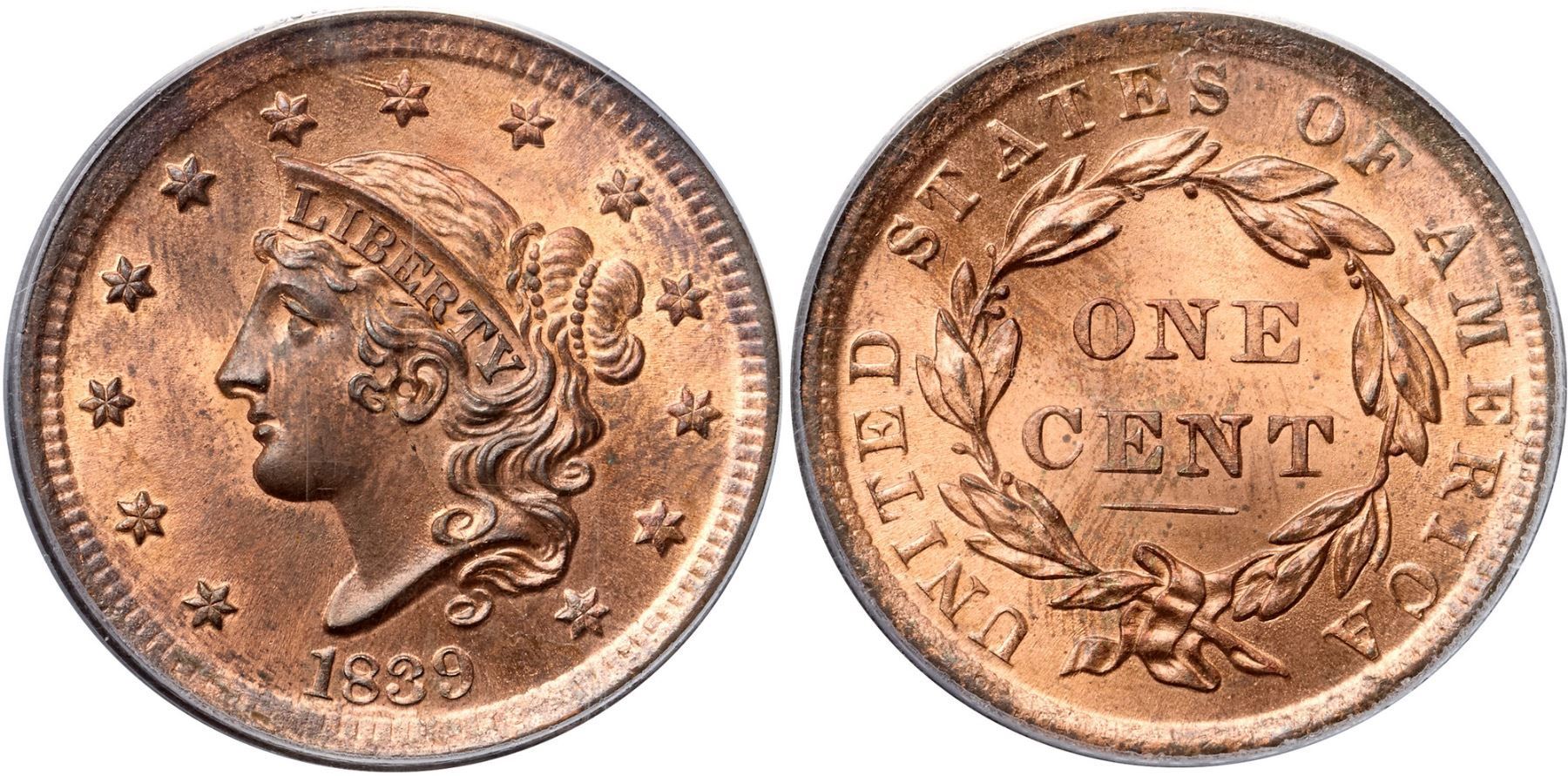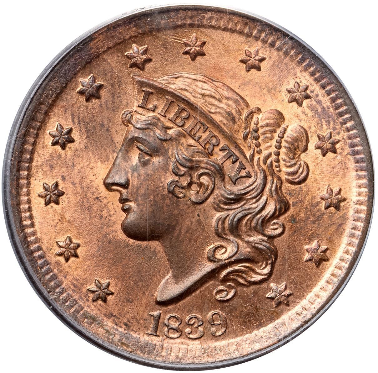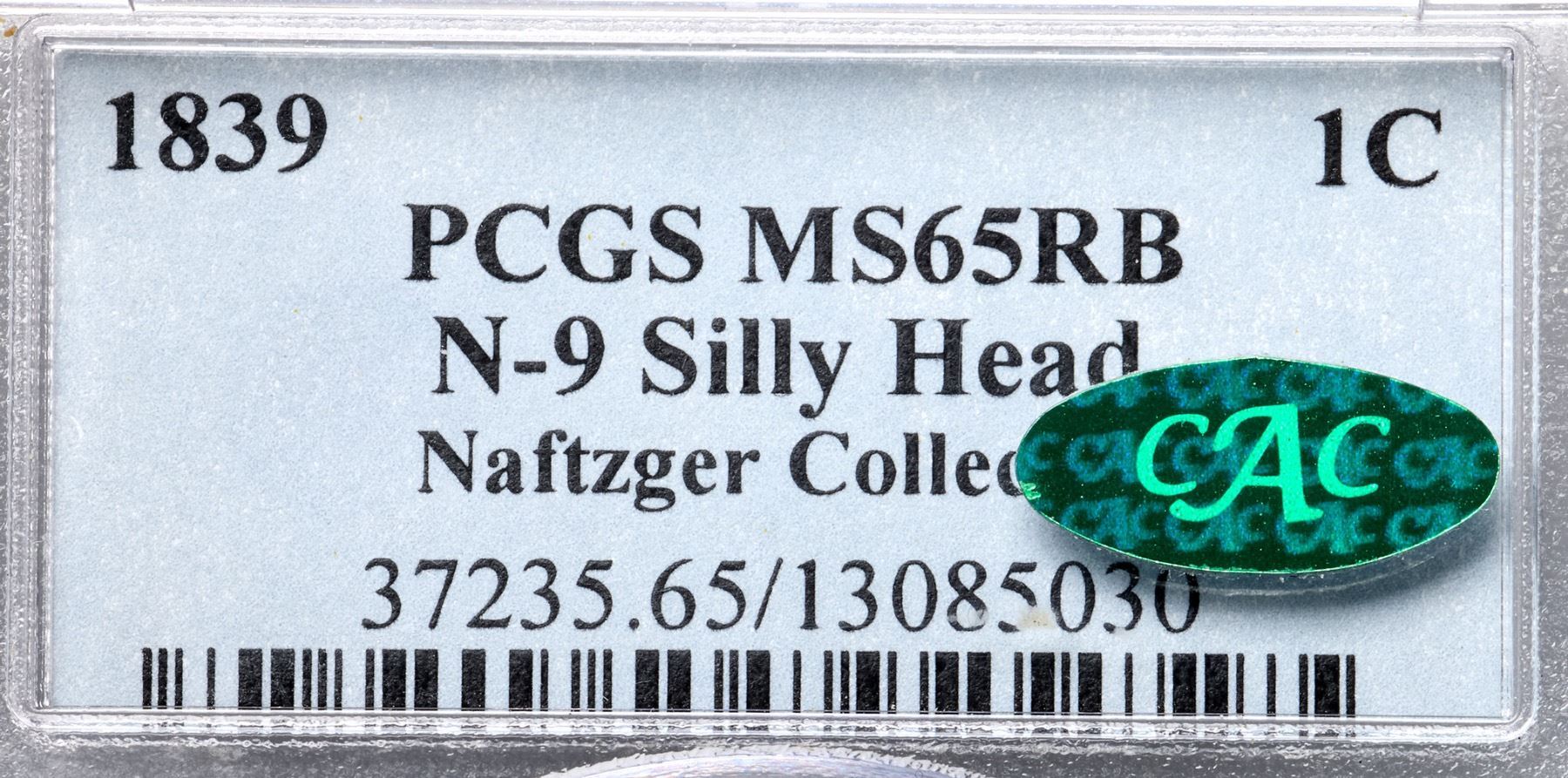1839 N-9 R2 Silly Head, PCGS graded MS65 Red & Brown, CAC ApprovedLustrous bright mint red fading to steel brown on the highpoints, 65% of the original color remaining on the obverse, 80% on the reverse. The only defects are traces of an old fingerprint at stars 4-5 and under CE in CENT. This cent has superb eye appeal in spite of the fingerprints and an 1839 cent with this much bright original mint color is a major rarity. E.-MDS, die state b. A fine die crack meanders from the dentils above star 5 through the portrait to the dentils right of the date. The fields are covered with microscopic radial die flowlines that give this cent great cartwheel luster. Called MS70- and CC#1 in the Bland census. Noyes says MS63 and tied for CC#3, his photo #21075. Our grade is MS66.Certificate Number: 37235.65/13085030Pedigree: Ex William Festus Morgan, J. C. Morgenthau & Co., 6/16/1932:309-Milton A. Holmes, Stack's 10/5/1960:1593 (as "N-4")-C. Douglas Smith-Jerry A. Bobbe 6/14/1982-R. E. "Ted" Naftzger, Jr.-Naftzger Estate, McCawley & Grellman Auctions/Goldbergs 2/1/2009:461-Terry S. Denman Collection