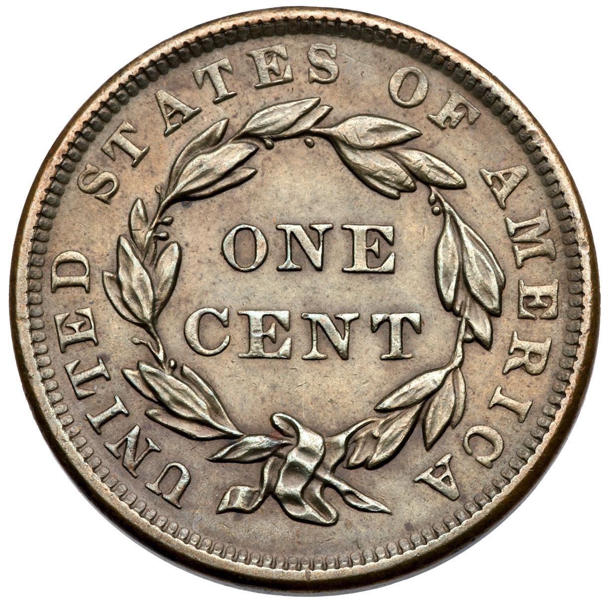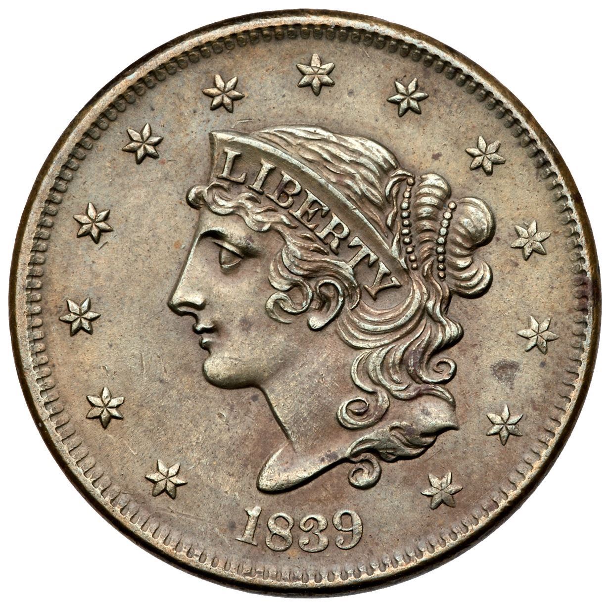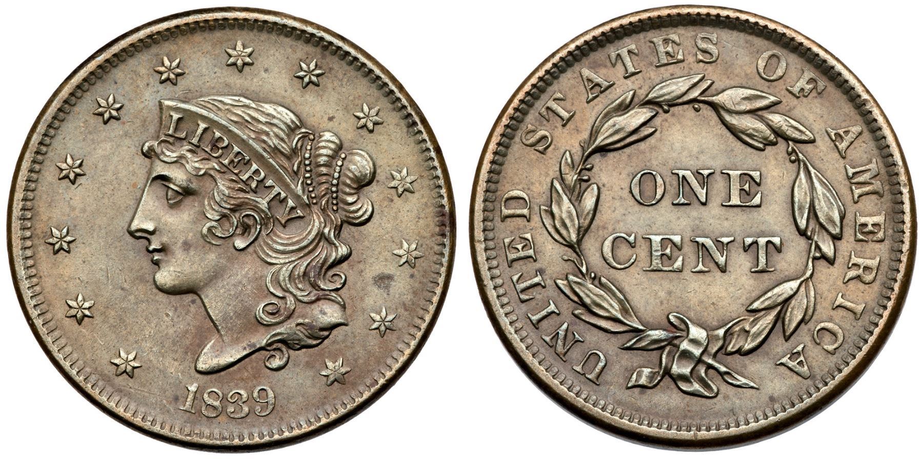 1839 N-11 R1 Booby Head AU50Glossy light greenish olive with light reddish brown in some of the protected areas. Mint frost shows in the fields and protected areas. A sharp cent with just a light touch of friction on the devices. A tiny rim nick at the first A in AMERICA is the only notable sign of contact and there is a very shallow depression over star 12. MDS, die state b. The earlier tiny lumps on the reverse are gone but myriad fine die lines show around ONE CENT.Certificate Number: Pedigree: Ex Chris McCawley 4/14/2012-Terry S. Denman Collection