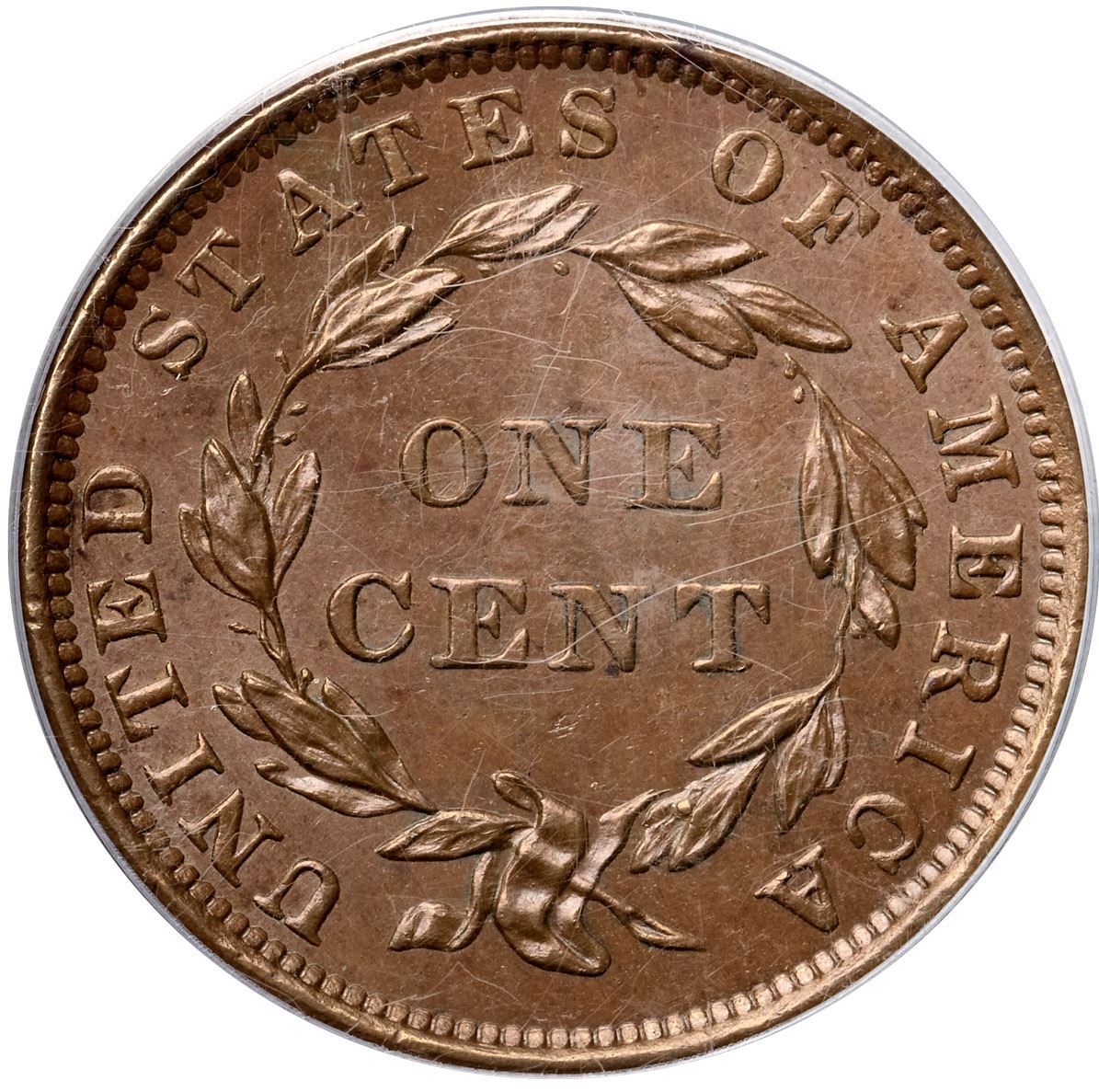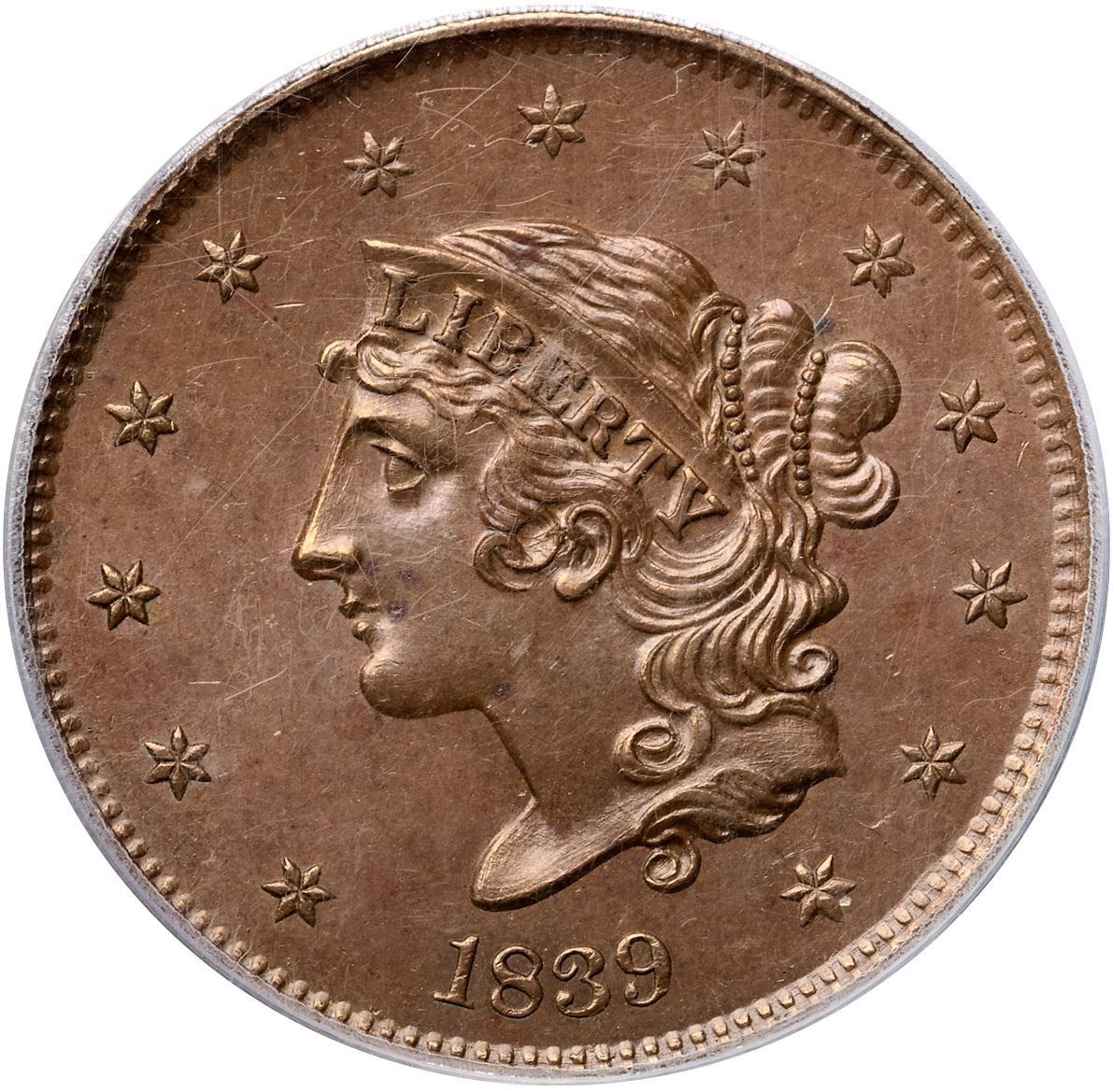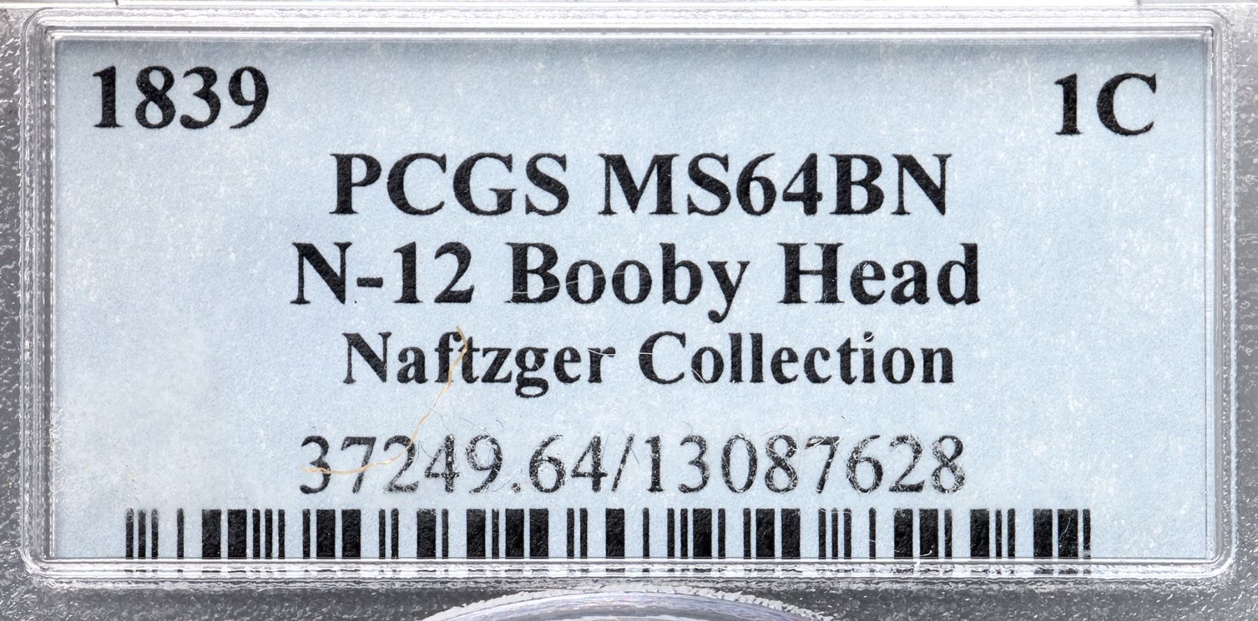 1839 N-12 R4+ Booby Head, PCGS graded MS64 BrownVery attractive frosty uniform light to medium brown. The surfaces are satiny and the eye appeal of this cent is very nice. Sharply struck with trivial marks including a fine hairline scratch from just below star 4 to before the end of the nose with an extension from the chin down to the lower part of the neck. Three tiny specks of reddish chocolate toning are located just right of the mouth with another in the field at the top of the hair bun plus a small splash of darker brown toning at the D in UNITED. Otherwise this cent is absolutely choice. Sharply struck EDS, die state a, with smooth, slightly reflective fields on both sides and no die cracks. Fine die polishing lines show in the fields on both sides, clearest along the front edge of the portrait. An impressive example of this rare die variety. Called MS62 and finest known by 12 points in the Noyes census, his photo #20638. Bland says MS60 and tied for CC#1. Our grade is MS60. (The holder is scratched.)Certificate Number: 37249.64/13087628Pedigree: Ex Peter Mougey, Thomas L. Elder 9/1/1910:213-J. P. Hale Jenkins-Henry C. Hines-Dr. William H. Sheldon-Numismatic Gallery-Floyd T. Starr, Stack's 6/13/1984:387-R. E. "Ted" Naftzger, Jr.-Naftzger Estate, McCawley & Grellman Auctions/Goldbergs 2/1/2009:466-Terry S. Denman Collection