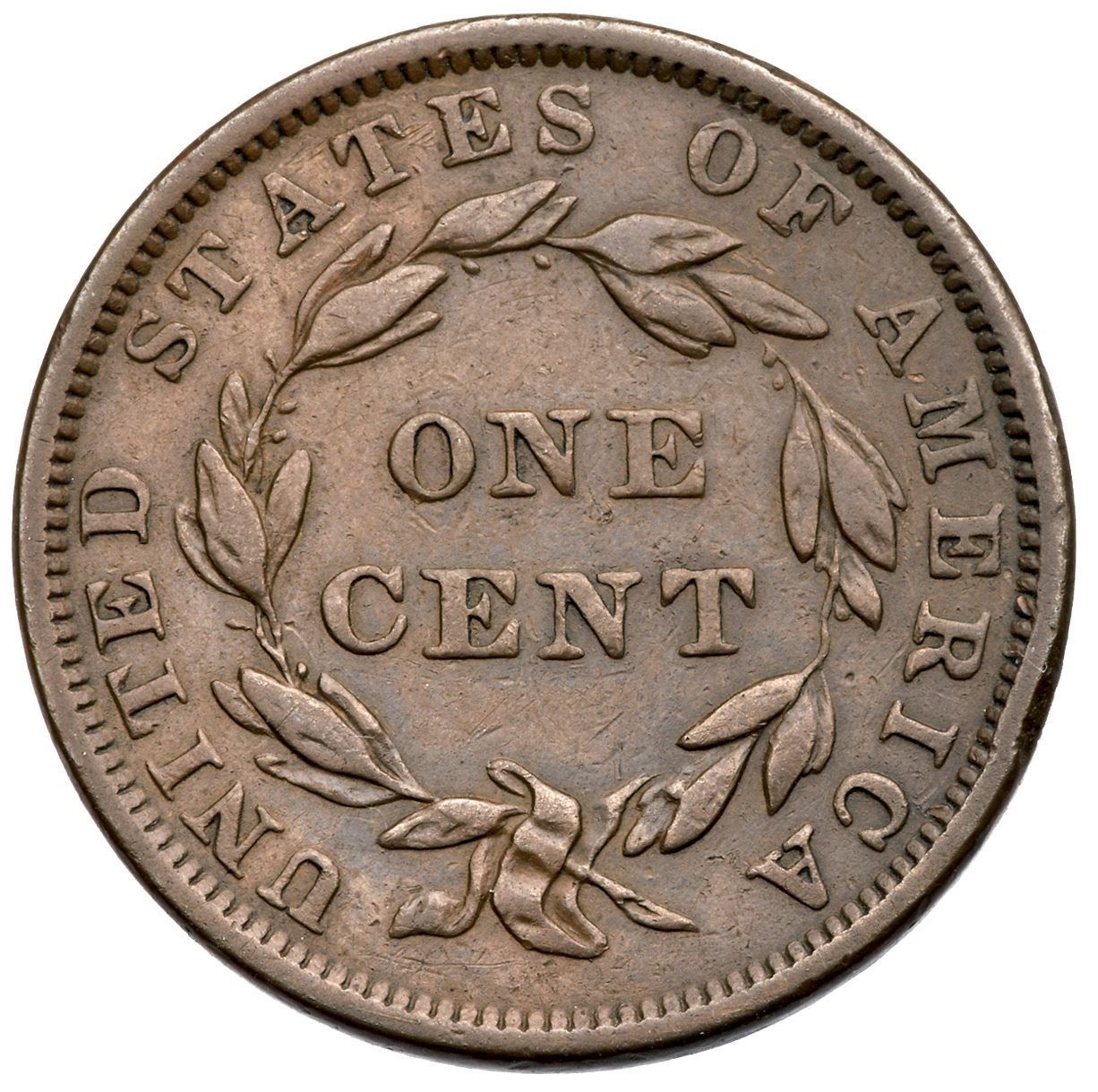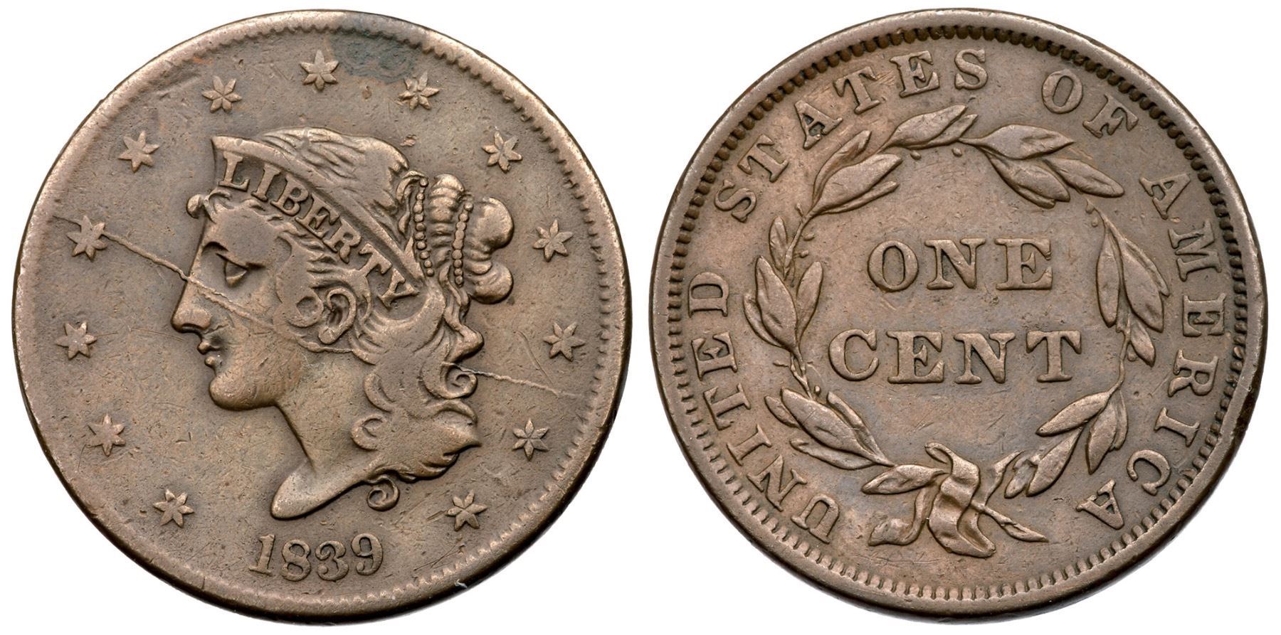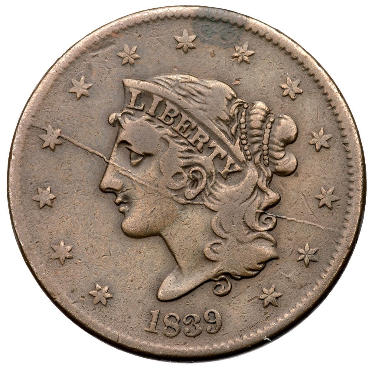 1839 N-12 R4+ Booby Head F15Glossy light olive with a spot of darker olive brown over star 8, and the spot contains traces of microscopic verdigris. The only notable mark is a scratch left of star 11. LDS, die state c, with a bisecting die crack from the rim at star 4 to the rim above star 12. A very nice example of this die state.Certificate Number: Pedigree: Ex Douglas F. Bird 4/28/2011-Terry S. Denman Collection