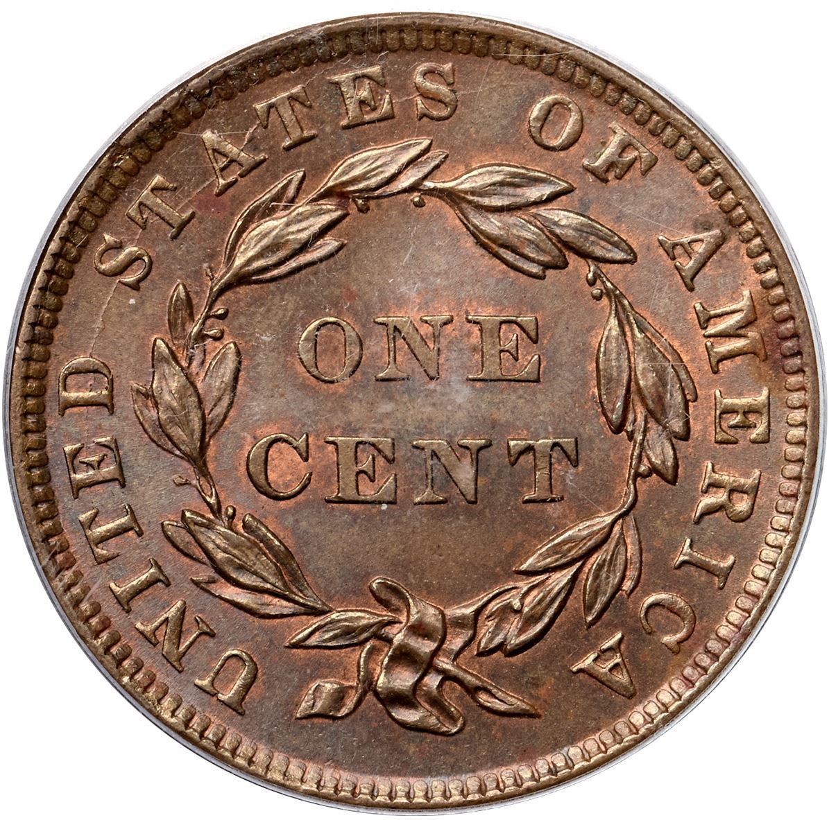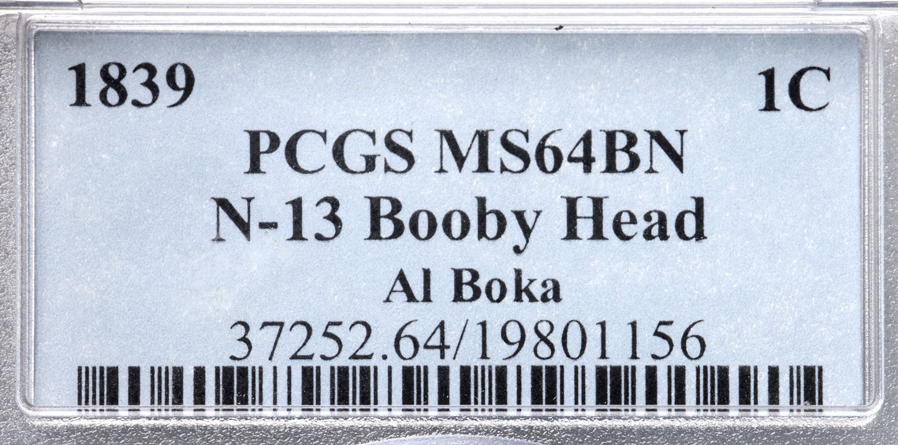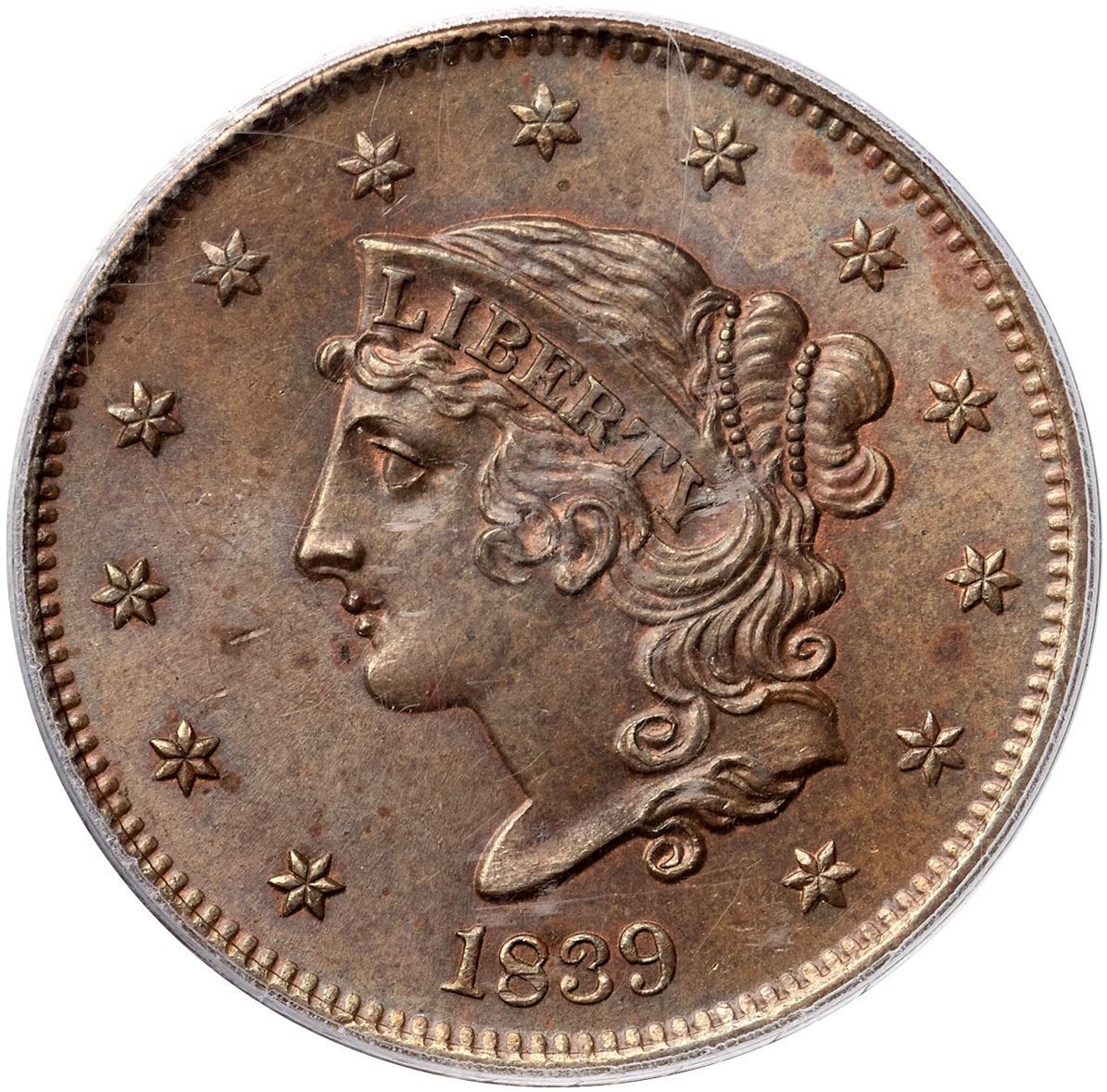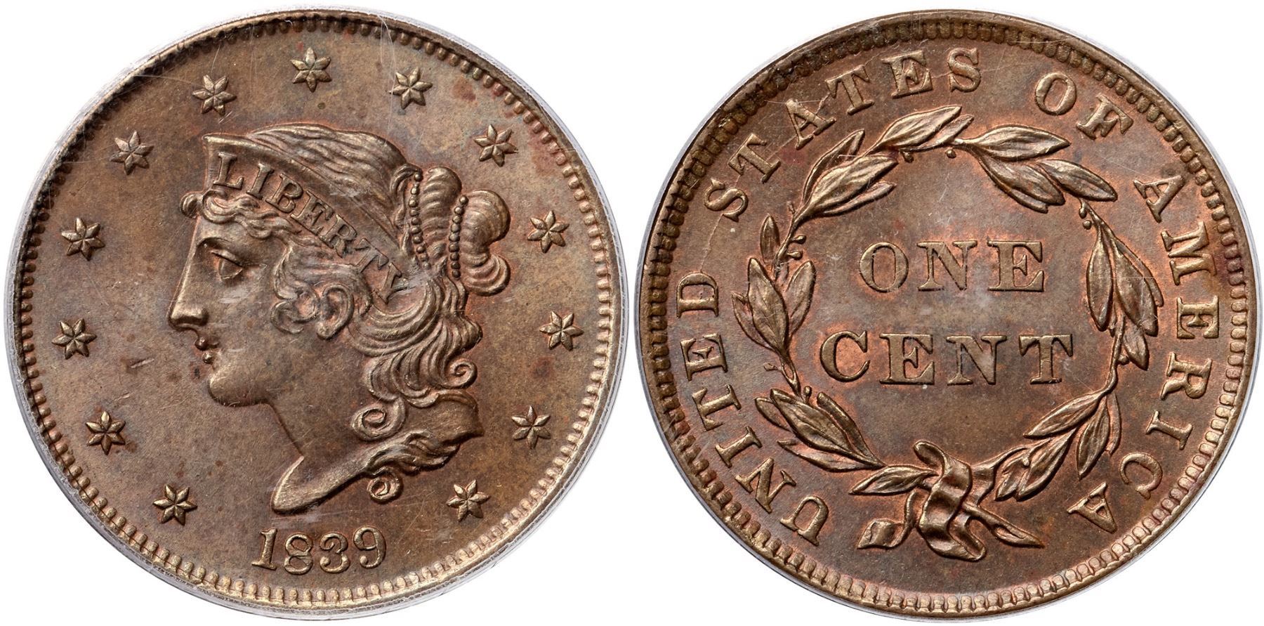 1839 N-13 R2 Booby Head, PCGS graded MS64 BrownFrosty light olive and bluish steel brown with faded mint red in protected areas, mostly on the reverse. Satiny mint luster covers this cent and the eye appeal is quite nice. The notable marks are some small spots of reddish brown toning including one on the bust, another under star 11, one over the M in AMERICA and a smaller one over the C. The spots are not distracting but they do contain traces of microscopic roughness. Sharply struck with full radial lines in all the stars and sharp hair details. MDS, die state b, with fine die cracks on the reverse. Graded MS63 and tied for CC#2 honors in the Noyes census, his photo #27243. Our grade is MS63 net MS62. Another condition census cent with a very nice provenance.Certificate Number: 37252.64/19801156Pedigree: Ex Lee G. Agnew, Numismatic Gallery 12/1952:841-R. E. "Ted" Naftzger, Jr.-C. Douglas Smith-Julian Leidman, Auction Galleries of Oakbrook 9/1982:22-Julian Leidman-John J. Nicholas, Superior 2/2/1992:623-Chris McCawley 1992-Dr. Thomas Turissini 5/25/2006-Jon Alan Boka, Heritage Auctions 9/8/2011:3062-Chris McCawley 4/2012-Terry S. Denman Collection