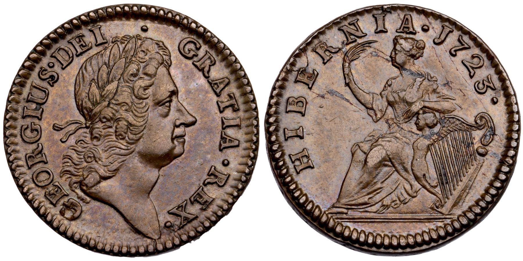 1723 Martin 4.68-Gb.9 R-4 Wood's Hibernia Halfpenny MS62BNAttractive glossy light brown and olive with subtle bluish steel tones. There are a few minor, thin laminations on the reverse in the upper fields. Otherwise attractive and smooth, free of notable marks. Well struck and nicely centered with reflective fields. 117.4 grains.Certificate Number: Pedigree: Ex; Stack's 12/2008:2065 (lot card included) - Bob Kebler Collection