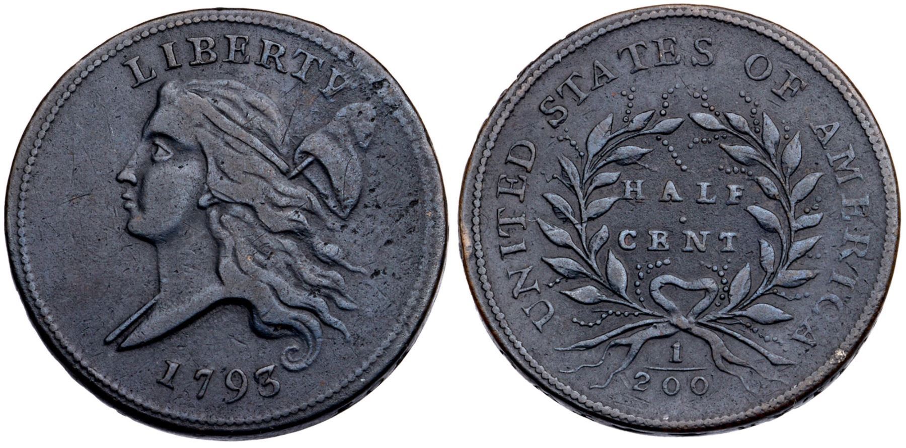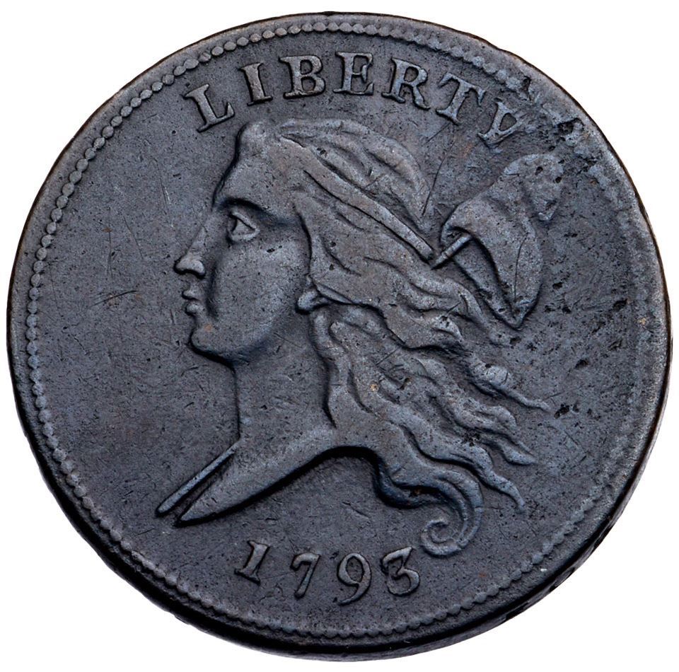 1793 C-4 R-3 VF20VF25 sharpness or slightly better but dark olive and steel with uniform extremely faint granularity covering the planchet. No verdigris, and the only marks are a few very tiny planchet flakes in the field to the right of the base of the cap and on the rim over the Y in LIBERTY, as struck. Satiny frost covers the planchet, and the eye appeal is quite nice in spite of the dark toning. Well struck MDS, Manley State 2.0. The date and the legends are bold.Certificate Number: Pedigree: Ex; Leo Wexler - Goldbergs 9/8/2009 - Bob Kebler Collection