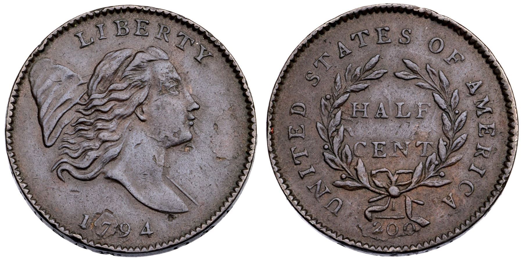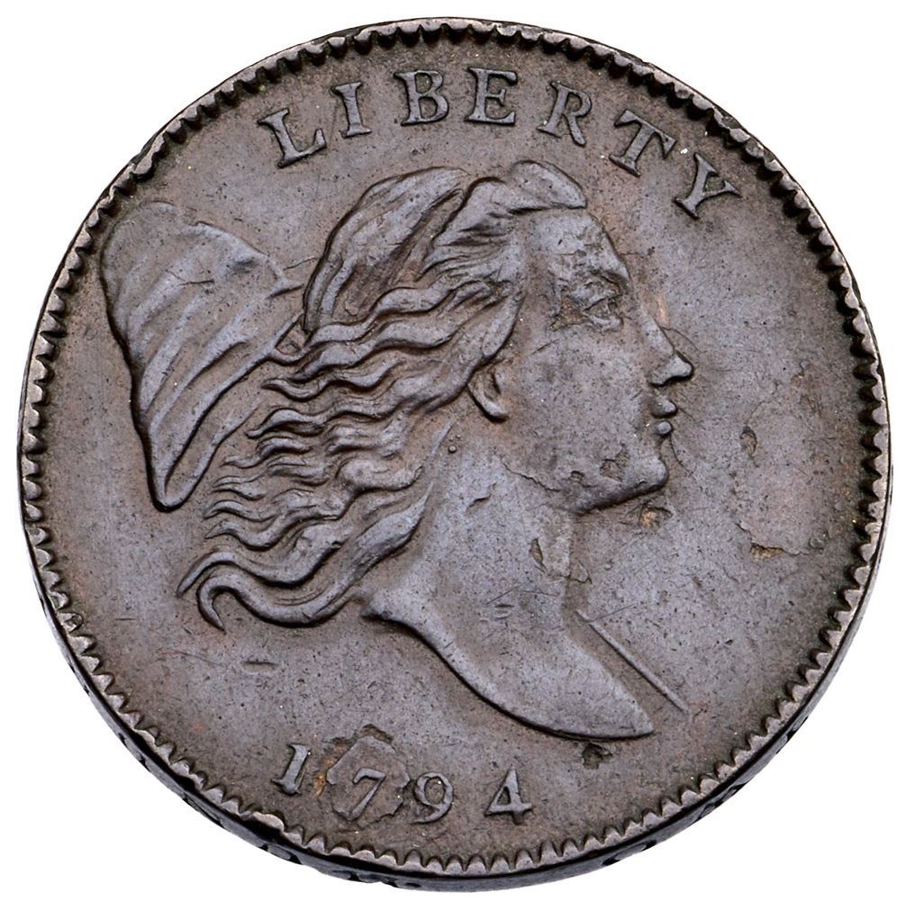 1794 C-1a R-3 Large Edge Letters VF30XF45 sharpness or slightly better but there are several small, shallow planchet laminations scattered about the obverse, as struck. The most notable are at the eye, chin, and 79. There is also a thin lamination along the bottom of the denominator. A small rim nick under the I, another over the cap, and a few tiny ones on both sides are the only marks. Otherwise smooth and attractive on glossy dark chocolate and steel brown surfaces. M-LDS, Manley State 3.0 early. The reverse is rotated 30 degrees CCW. 106.1 grains.Certificate Number: Pedigree: Ex; Mike Follett 6/26/1986 - Bill Weber - Superior 6/3/2002:2243 - Bob Kebler Collection