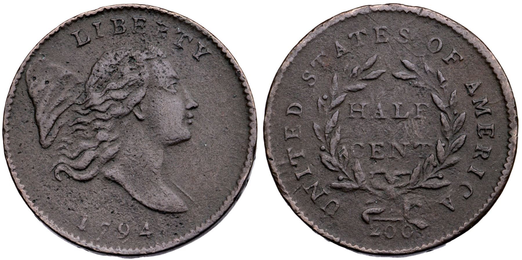 1794 C-1b R-6 Small Edge Letters VG10VF35 sharpness but covered with microgranularity, and there are a few tiny pits on the obverse, strongest in the ahir and atop the head. No verdigris. The only contact marks are a few tiny rim nick son both sides, one opposite the base of the neck the strongest, and a fine hairline scratch through E in STATES the other notable mark. Slightly glossy dark steel brown and olive. The 7 is a bit weak but otherwise clear date. EDS, Manley state 1.0, the small edge letters are clear. 89.7 grains.Certificate Number: Pedigree: Ex; Ricky Gross - Tony Terranova 8/1977 - Roger S. Cohen Jr, Superior 2/2/1992:9 - Dr. Wallace Lee Superior 5/2003:67 - Bob Kebler Collection