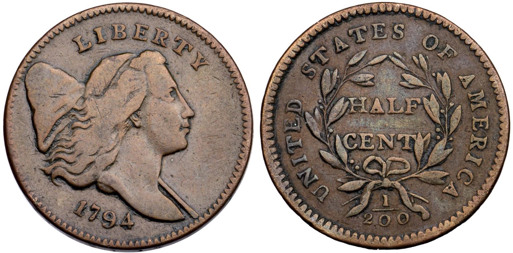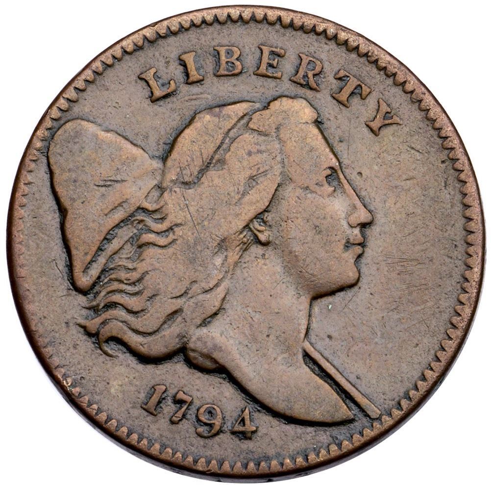 1794 C-4a R-3 F12Choice glossy light olive and chocolate brown. There is a tiny pinprick-like planchet chip in the field before the eye visible with a glass, trivial but the best identifying mark. Smooth and virtually flawless with excellent eye appeal. Rare EDS, Manley state 1.0. The reverse is rotated 15 degrees CCW. A premium example in every respect. 105.4 grains. Removed from a PCGS F15 holder (1003.15/26779361).Certificate Number: Pedigree: Ex; Richard Gross - Jeff Isaacs 9/1988 for $500 - Roger S. Cohen, Jr. Superior 2/2/92:21 - R. Tettenhorst 94.9.11 Goldberg’s Davy II 9/4/2011:104 - Chris Victor-McCawley - Shawn Yancey 1/12/2013 Bob Kebler Collection