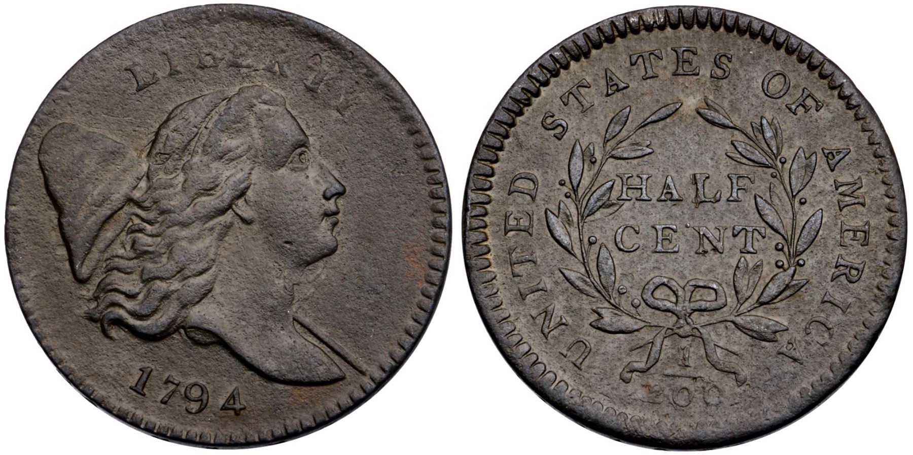 1794 C-6a R-5+ F15AU50 sharpness or better but covered with fine roughness. Has the look of a piece that was uncirculated when lost in an unfriendly environment for a time before being rescued. Uniform dark olive and steel. No verdigris, and the only marks are a tiny pinprick on the ajw and a nick on the left edge of the L in HALF. Manley state 1.0 with the clashmarks on the obverse and a minor bulge right of the date. Probably the sharpest known example of this rare die variety.Certificate Number: Pedigree: Ex; Goldbergs 6/2018:29 - CVM 8/2021 - Bob Kebler Collection