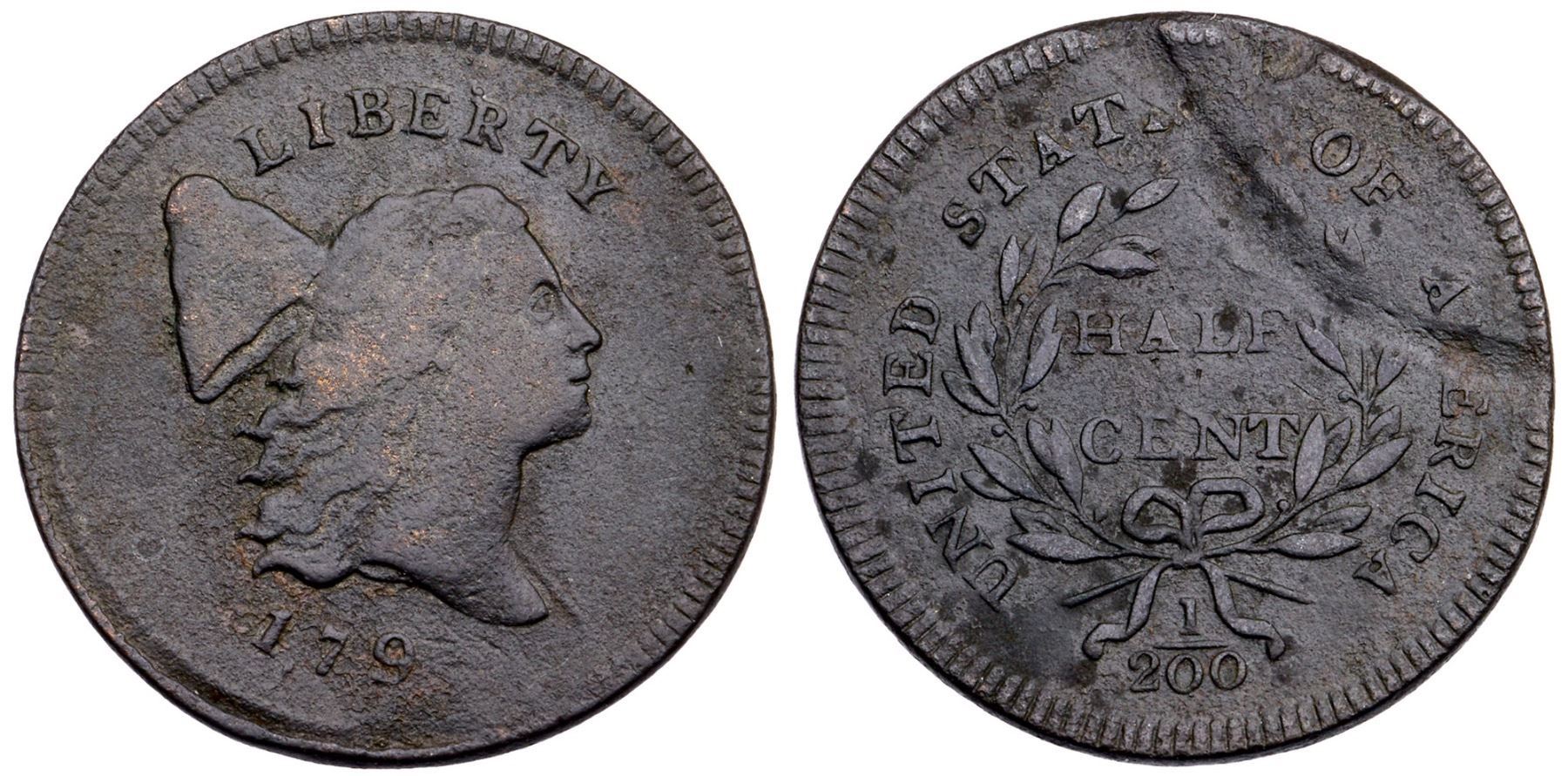 1795 C-3 R-5 Punctuated Date Plain Edge VG7A few points sharper but very fine, uniform granularity covers the surfaces. There is also an impressed arc on the reverse from 12 to 3 o'clock, and a chip or flake at 12:30, and the 5 of the date is gone opposite of where the arc lines up indicating it was likely a mint error. Otherwise sharp details with strong date and legends. EDS, Manley state 1.0. 77.4 grains.Certificate Number: Pedigree: Ex; Tony Carlotto 3/1988 - Mike Packard EAC 5/4/2012 - Bob Kebler Collection