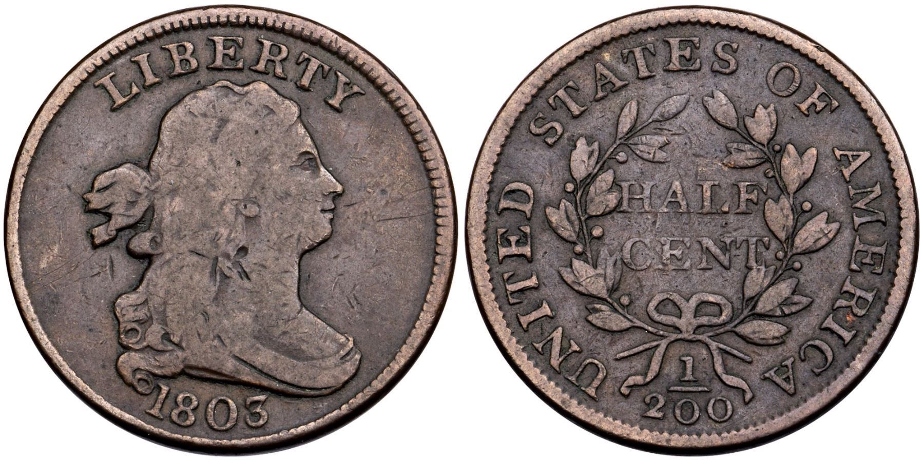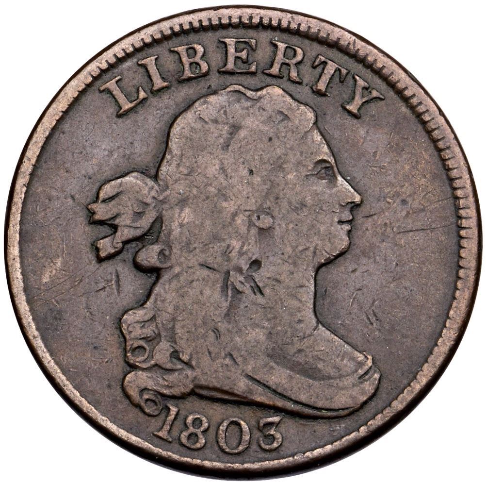 1803 C-2 R-4 VG10Nice glossy chocolate brown with steel brown toning on the devices. Smooth surfaces showing only a few small contact marks. The notable ones are a grouping of nicks at the hairline left of the throat and a thin vertical nick under the hair ribbon. Rare EDS, Manley state 1.0. The only die crack visible is a faint one connecting the tops of ES in STATES. Davy #03.2.1. Broken out of a PCGS F12 holder (35131.12/26666870)Certificate Number: Pedigree: Ex Ray D. Munde-Roger S. Cohen, Jr. FPL 10/17/72-R. Tettenhorst Davy II Goldberg’s 9/4/2011:200-Rick Irons - Stack's 11/6/2013:70