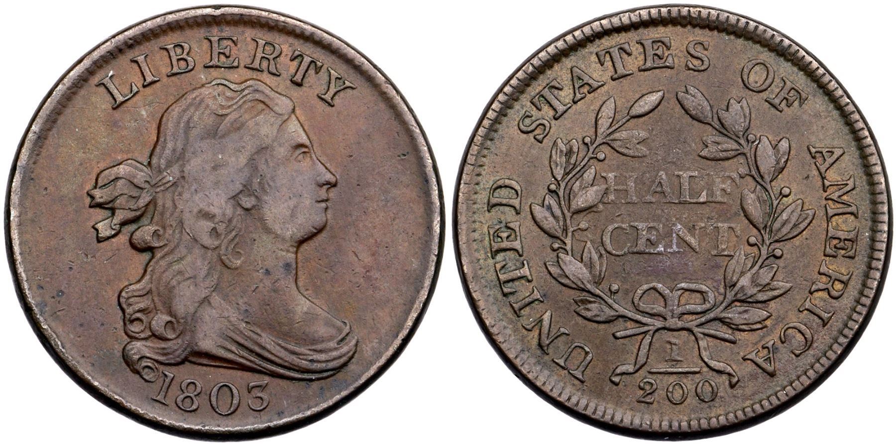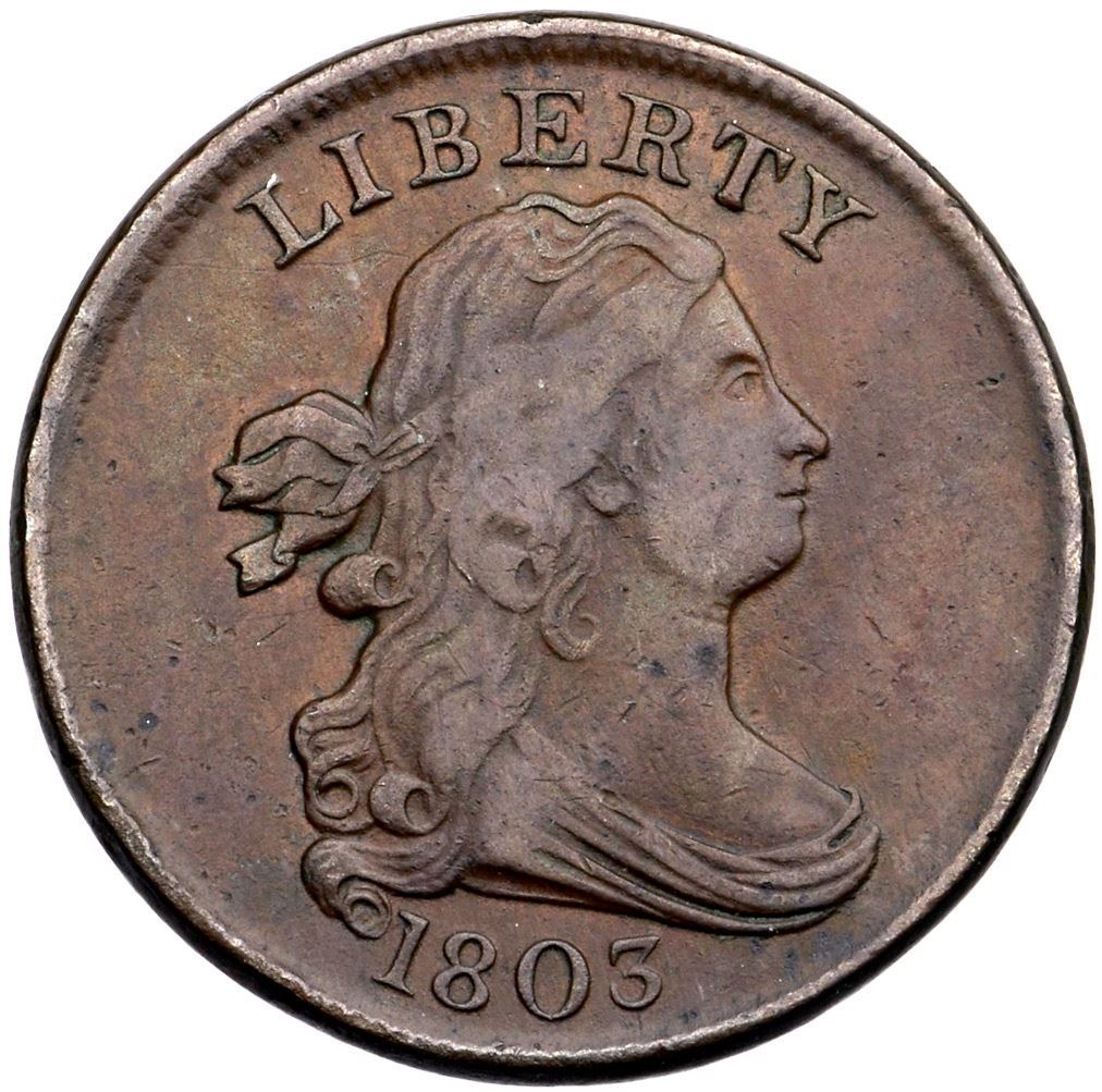 1803 C-4 R-4 VF30Glossy olive with hints of light brown underneath and mint frost in some of the protected areas, especially on the reverse. A tiny rim nick over E in LIBERTY is the best identifying mark. There is one spot of microscopic roughness off the bust tip, otherwise smooth surfaces. The reverse is rotated 15 degrees CCW. EDS, Manley state 1.0.Certificate Number: Pedigree: Ex; Doug Bird 10/2004 - Bob Kebler Collection