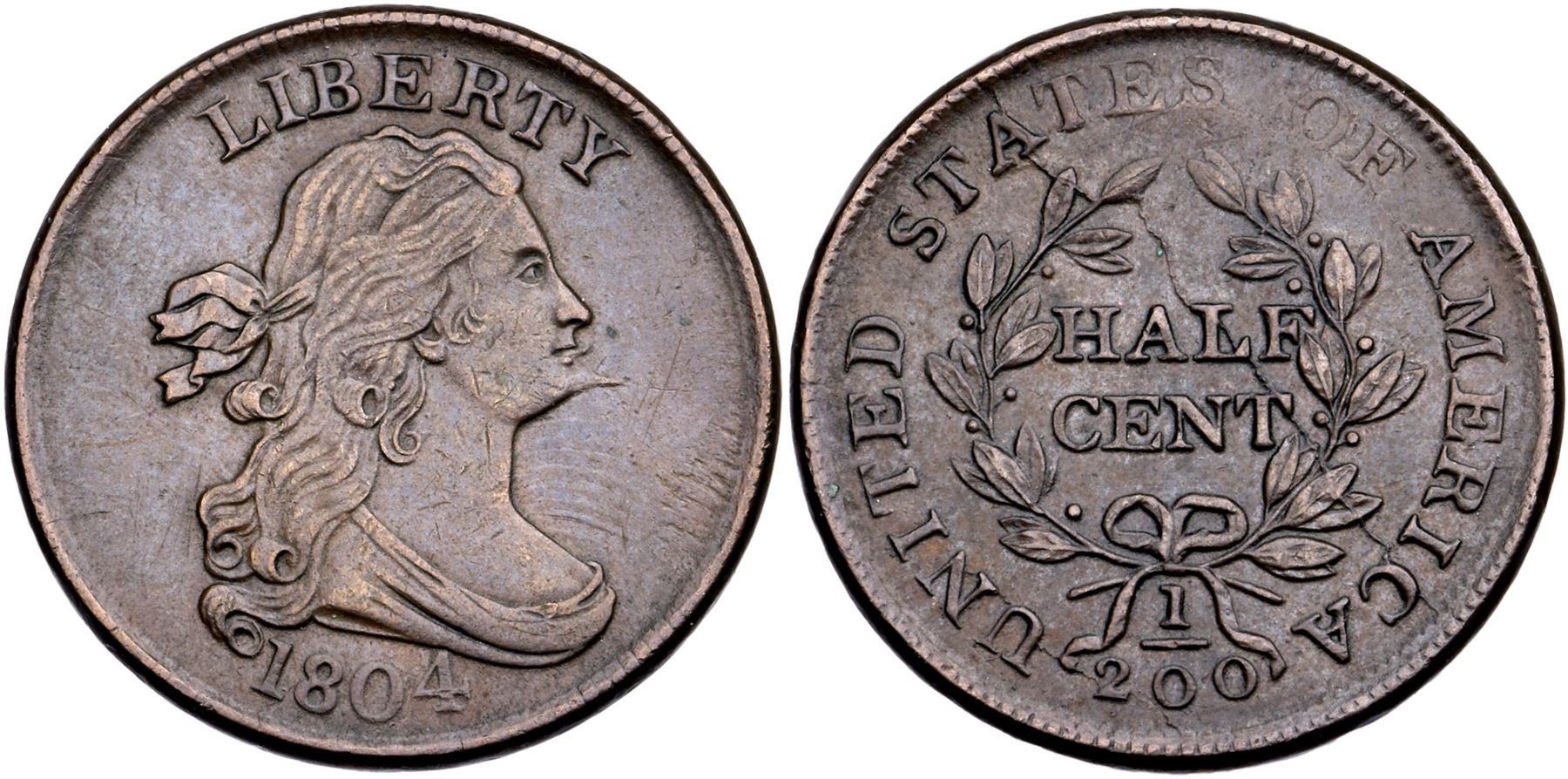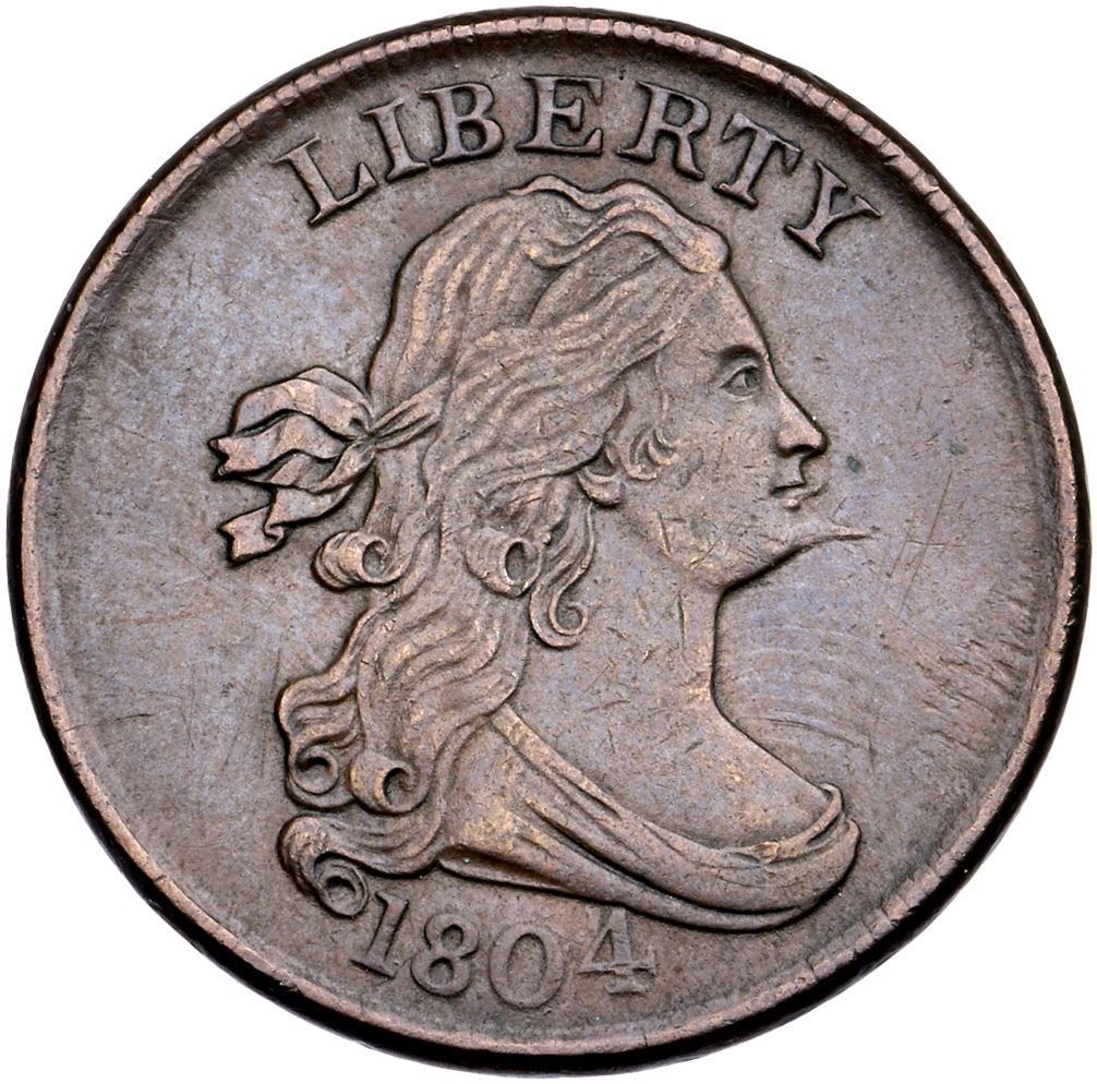 1804 C-5 R-4 Spiked Chin EF405 points sharper but there are a few light pinscratches in the field before the neck and several more behind the lowest curls. All the scratches are old and blend in well. Very attractive glossy chocolate brown with underlying frosty luster showing in the protected areas. Smooth surfaces. M-LDS, Manley state 5.0, the bisecting die crack on the reverse is strong and another crack reaches from the base of the O in OF down through the leaves to the bsiecting crack above LF. Tied for CC#8 in the Mike Spurlock census, CC#11 in the Jim McGuigan list, and #7 in the Breen census. Noyes photo #73667. 81.3 grains. Comes with a nice provenance. Broken out of a PCGS AU50 holder with the Green Tree provenance noted (35152.50/34063674).Certificate Number: Pedigree: Ex W. W. Neil, B. Max Mehl 6/17/1947:2226-Willard C. Blaisdell (via Del Bland) 9/15/1976-R. E. Naftzger, Jr. (via Del Bland) 10/8/1976-William K. Raymond-Roger S. Cohen, Jr. 12/4/1982-Bob Yuell (The Whister Collection), McCawley & Grellman Auctions/Goldbergs 9/4/2011:43-The Green Tree Collection Goldbergs 2/2018:67 - Bob Kebler Collection
