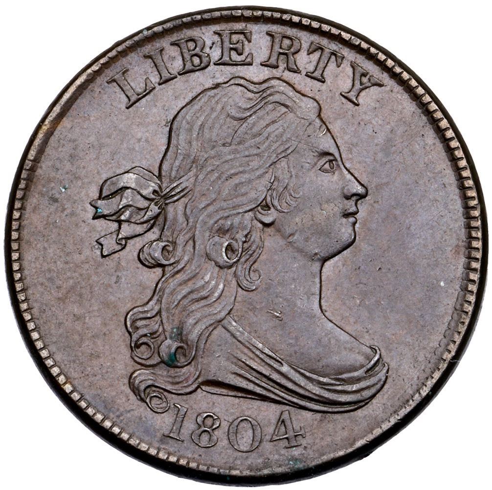 1804 C-9 R-2 Crosslet 4 Stems AU50Attractive chocolate and light steel brown surfaces. There are a few tiny, trivial pin scratches above the eye and in the hair visible under a glass that blend in well. Frosty, lustrous surfaces, excellent eye appeal. Manley state 2.0. 88.4 grains. Comes with a very nice provenance. Broken out of an NGC MS61BN holder with the Brobson and Partrick provenance noted (5747080-011).Certificate Number: Pedigree: Ex: Dr. D. W. Valentine (Thomas L. Elder) 12/1927:492 - Hillyer Ryder Collection - Ryder Estate - Wayte Raymond-(New Netherlands) 6/1954:287 - Joseph Brobston (Stack’s FPL #9, 1/1963 - Jon Hanson (6/23/1973) -Donald G. Partrick HA 4/23/2021:3650 - Bob Kebler Collection