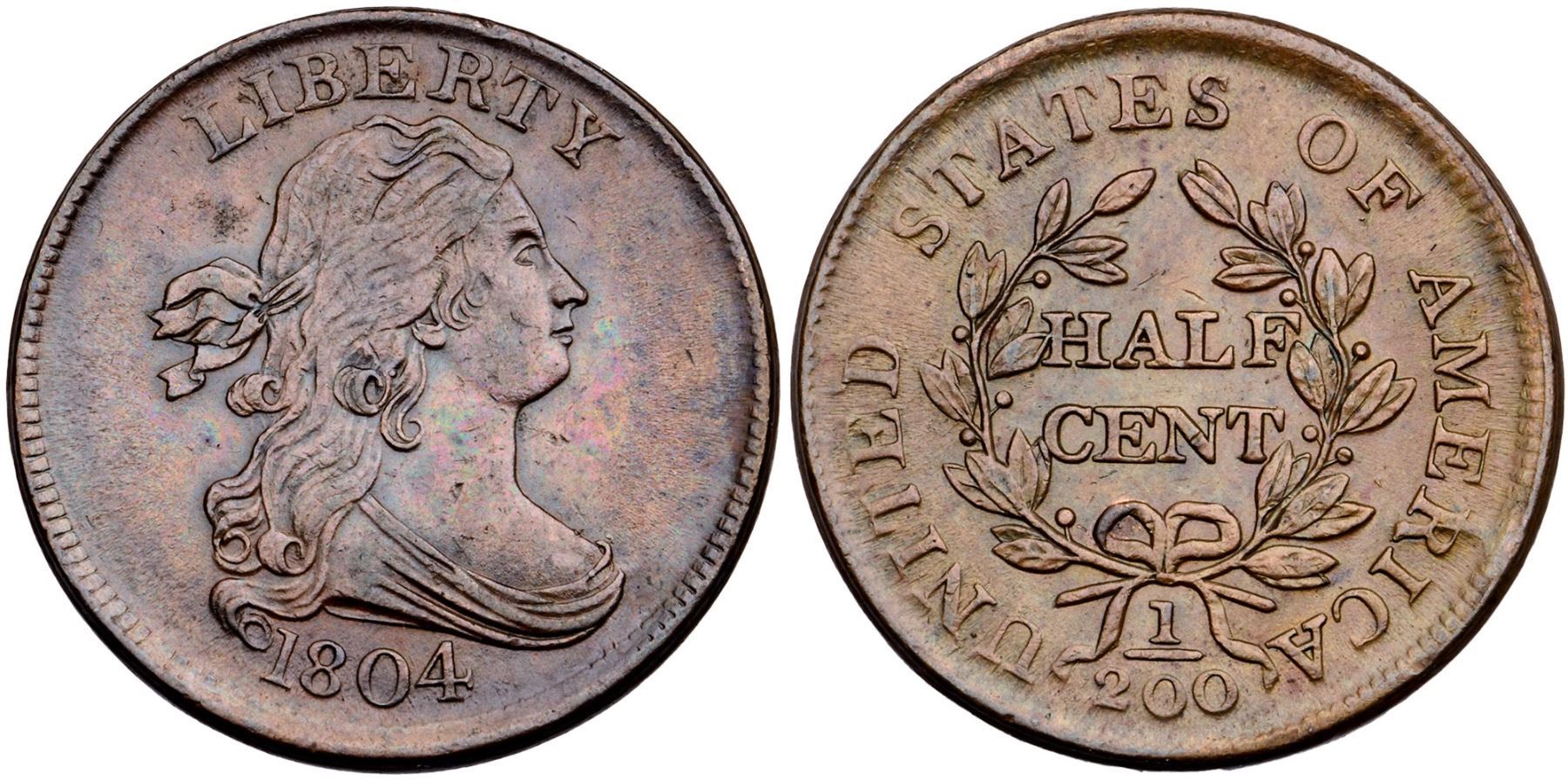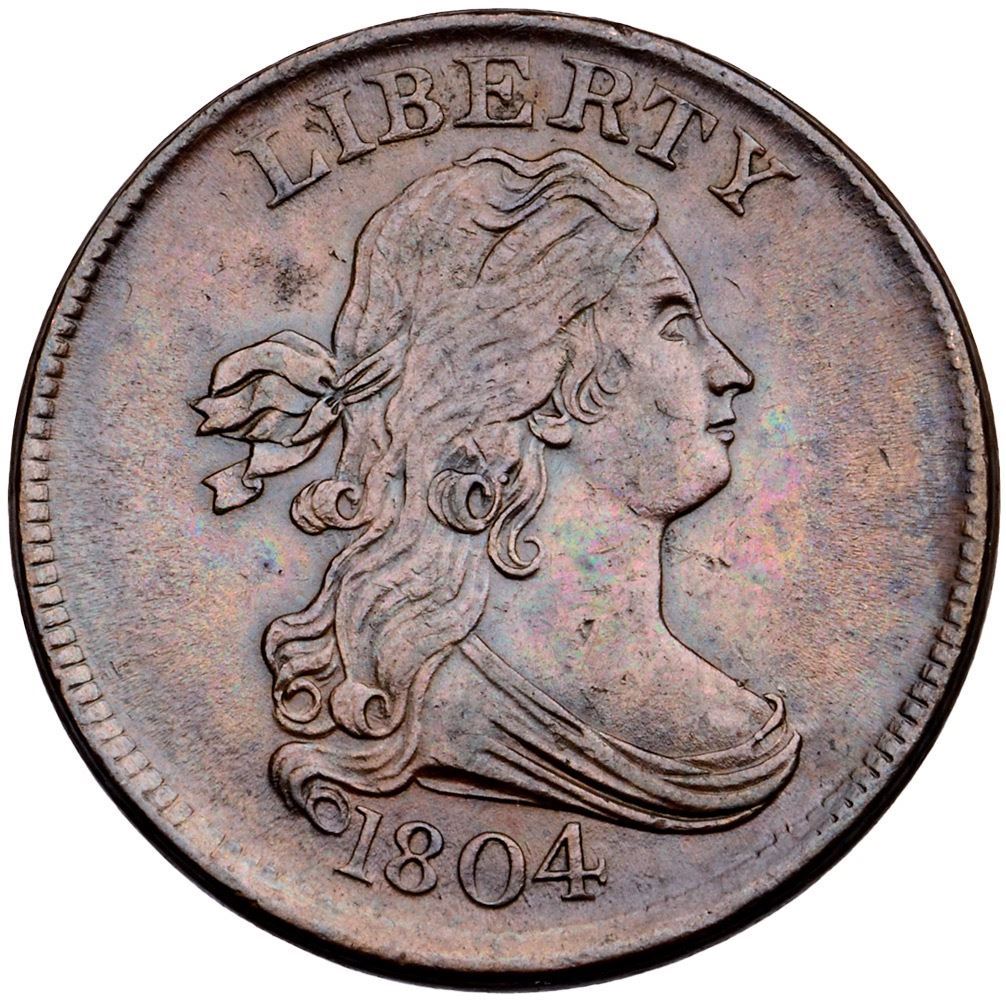1804 C-10 R-1 AU50+5 points sharper but there are a couple tiny nicks on the obverse and a small spot on the left ribbon loop. The notable nicks include on on the lower neck, one before the throat, and one on the bust tip. Choice light brown with subtle iridescent sea green and red tones. Lustrous surfaces. MDS, Manley state 2.0. Removed from an NGC MS61BN holder (683353-001).Certificate Number: Pedigree: Ex; Ira Stein 4/2001 - Bob Kebler Collection