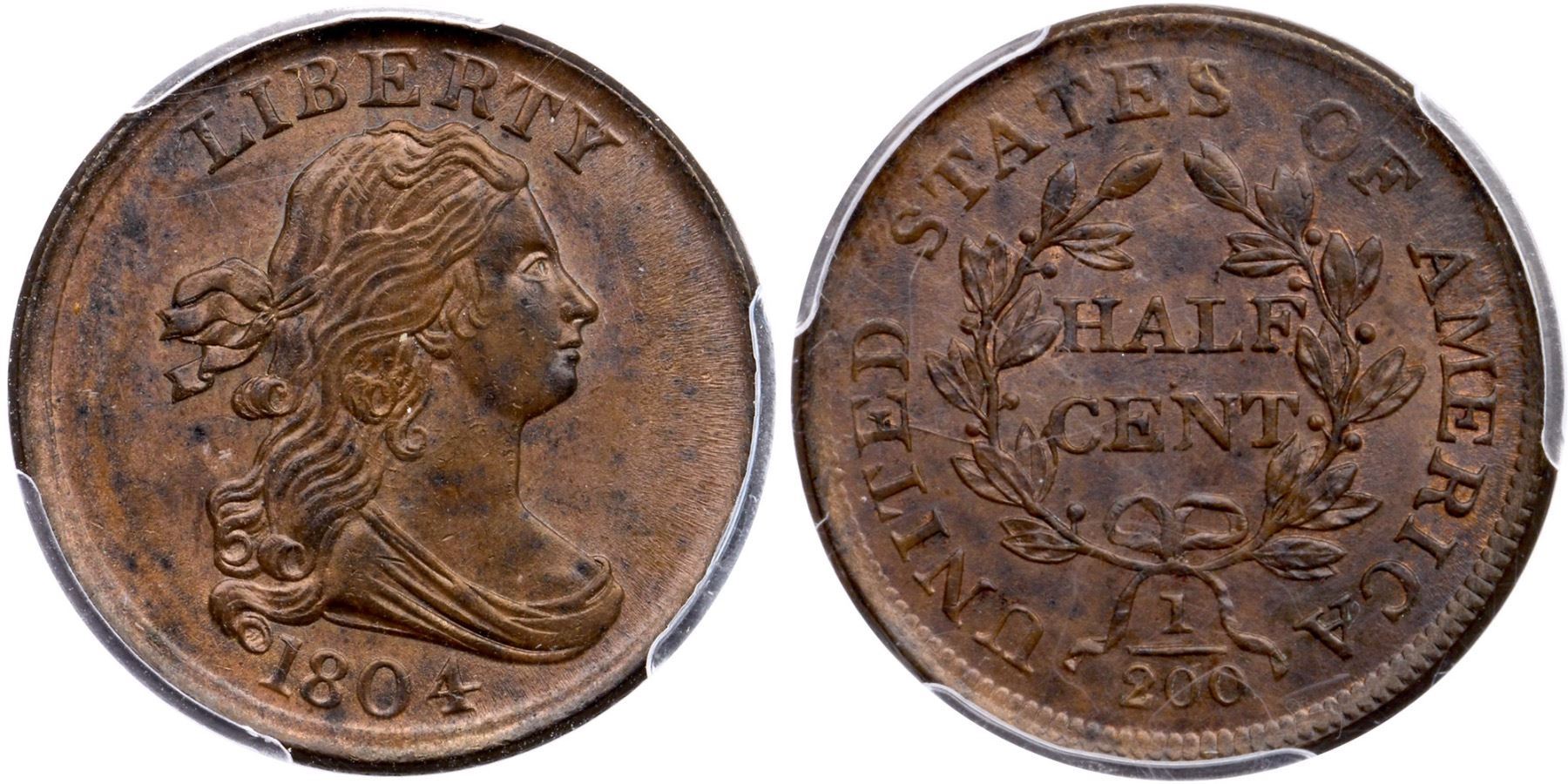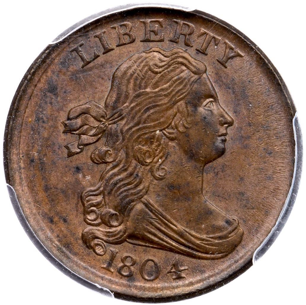 1804 C-13 R-1 Plain 4 Stemless PCGS MS64BNAttractive medium brown with splashes of steel toning and traces of underlying mint red on the reverse.There are a couple trivial marks in the upper hair that blend in well. MDS, Manley state 2.0 with light obverse clash marks. Superb eye appeal, and comes with a nice provenance. Our grade is MS62BN.Certificate Number: Pedigree: Ex Phillip Showers (Stack’s. privately 1969) - Willis H. DuPont - Fred S. Werner 2/1976-Superior 2/76 - Joe Flynn & Son 4/201976 - R. Tettenhorst 3/1981 - Jim McGuigan HA 8/22/2022:3067 - Bob Kebler Collection