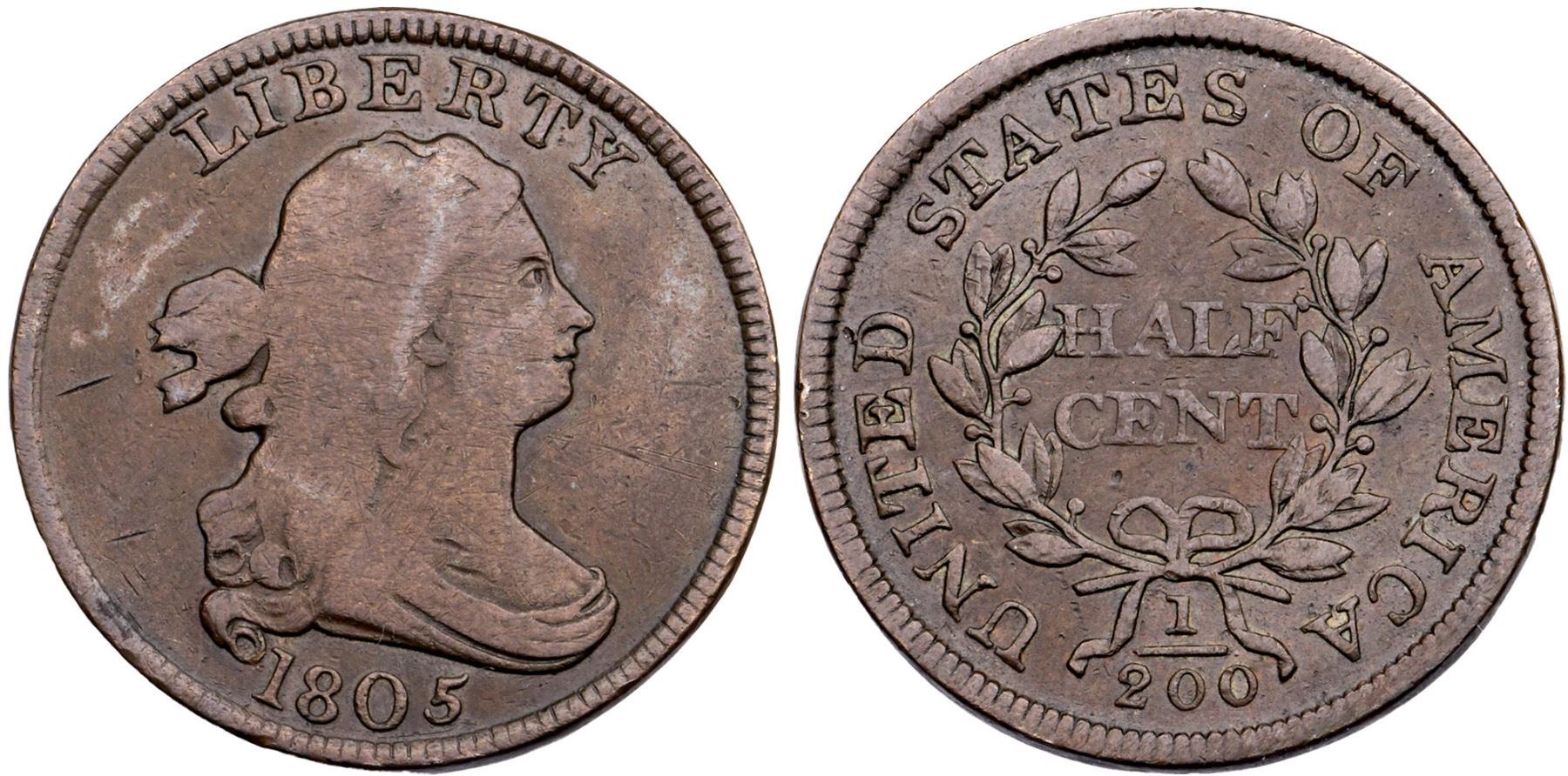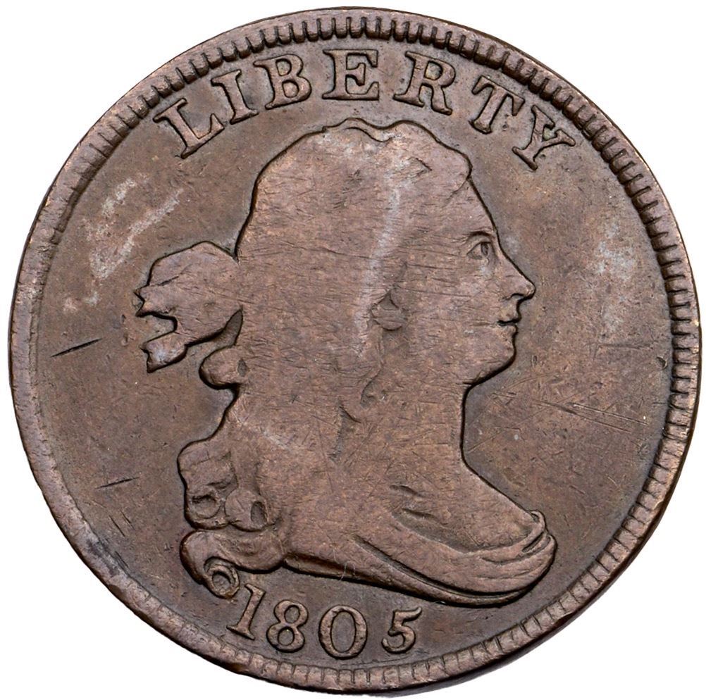 1805 C-2 R-5 Small 5 Stems VG8A couple points sharper but cleaned long ago and now toned a pleasing medium brown. There are old hairlines on the portrait and fields that blend in well. Smooth surfaces. Manley state 1.0.Certificate Number: Pedigree: Ex; Stacks 1/7/2008:23 - Bob Kebler Collection