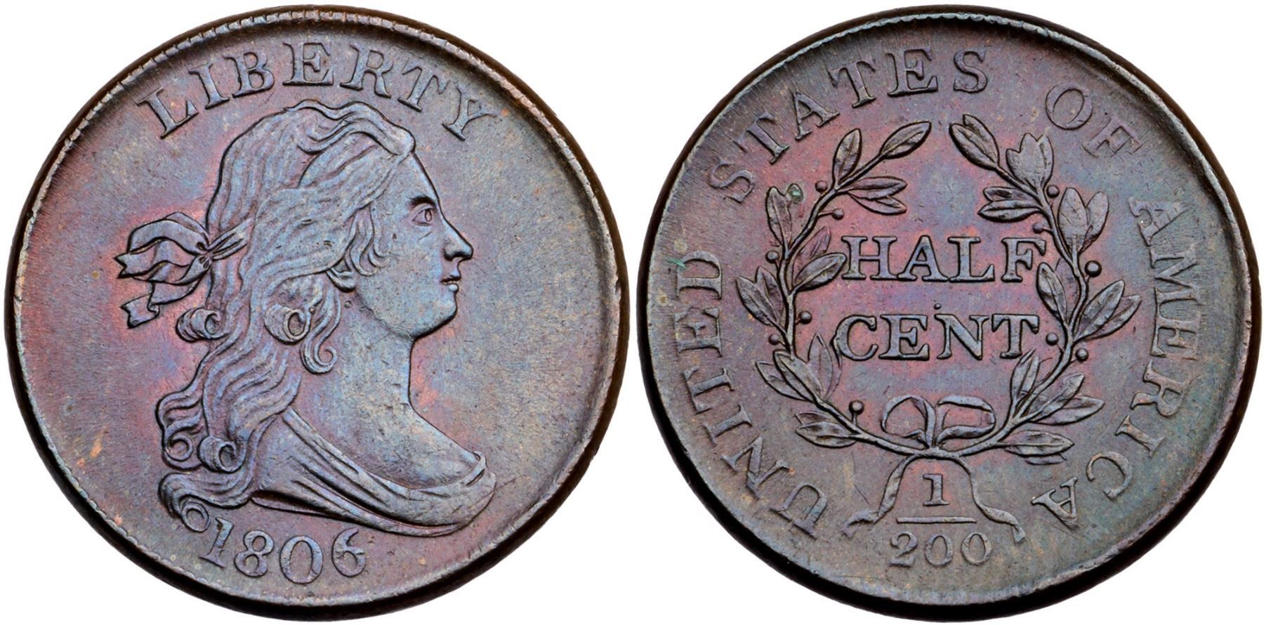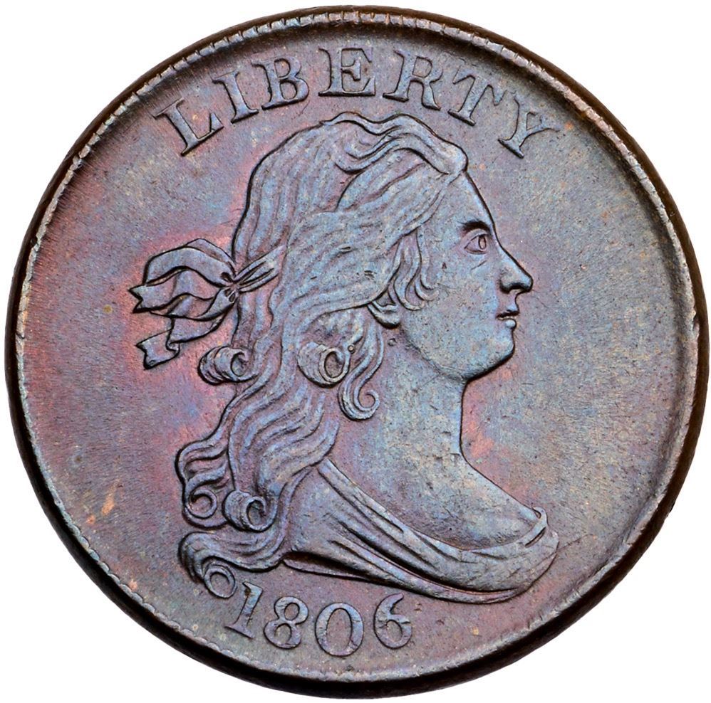 1806 C-1 R-1 Small 6 Stemless MS60A couple points sharper but nicely long ago and now olive and bluish steel brown tones with underlying rose. Only the most trivial of marks visible under a glass, nothing noteworthy or distracting. Smooth, lustrous surfaces. EDS, Manley state 1.0.Certificate Number: Pedigree: Ex; HA FUN 1/5/1996:6476 - Mike Demling Stacks 8/14/2013:1446 - Bob Kebler Collection