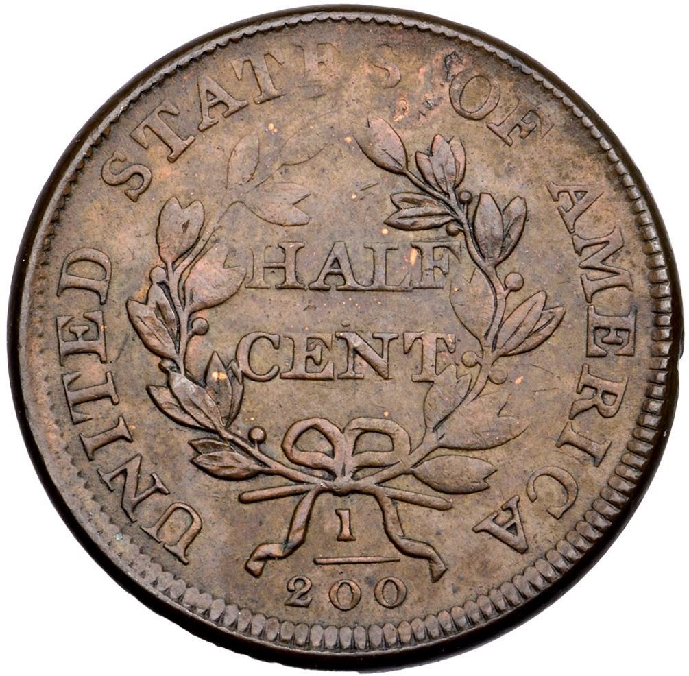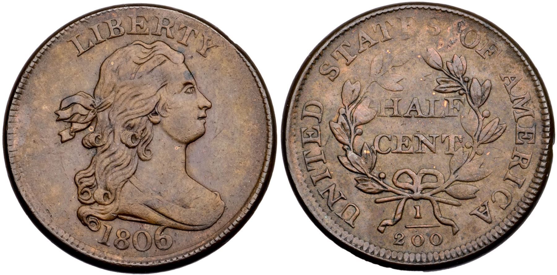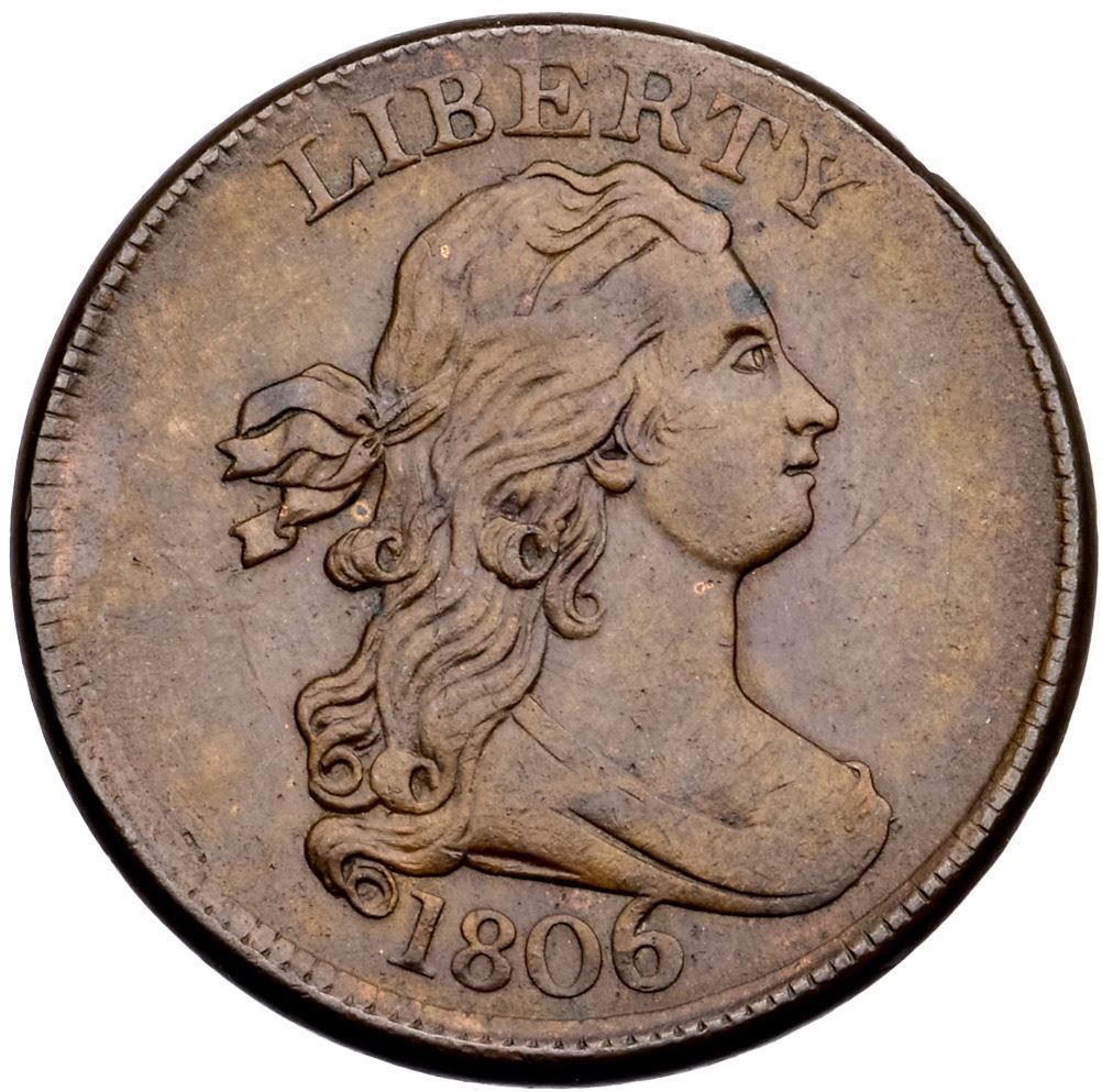 1806 C-4 R-1 Large 6 AU50Glossy olive and reddish chocolate brown mottled with some lighter shades of brown. The only detraction is a tiny planchet lamination left of O in OF, otherwise smooth and attractive surfaces. MDS, Manley state 1.0 late. The repunching on the 6 is clear and the reverse is rotated 45 degrees CW. Softly struck at the bust tip and some leaves, as usual.Certificate Number: Pedigree: Ex; Dick Feingold - Superior 6/1/2004:97 - Bob Kebler Collection