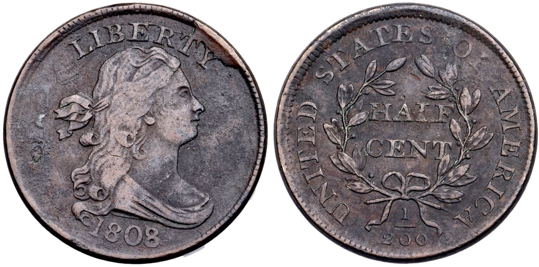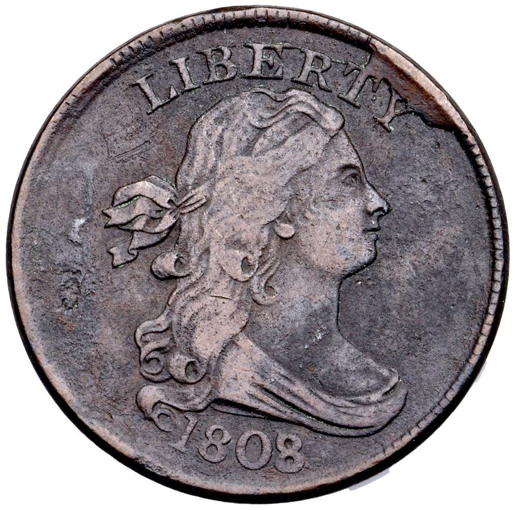 1808/7 C-2 R-3 VG10Sharpness VF30 but dark and covered with fine granularity. There is some shallow scale in the field left of the lower end of the hair ribbon and a bit more right of the second S in STATES, no verdigris or contact marks. Dark steel and olive with slightly lighter chocolate toning on the highpoints. Mostly matte in appearance except the high points. Rare MDS, Manley state 4.0 early. A fine but relatively clear die crack extends up to the dentils from the top of the B and a faint one reaches up from between the E & R to the dentils. A strong cud break connects TY to the rim. The date, overdate, and legends are clear.Certificate Number: Pedigree: Ex Chris McCawley, McCawley & Grellman Auctions/Superior 6/1/1998:47 - R. Tettenhorst Davy Collection #08.2.17 Goldberg 9/4/11:350 - Bob Kebler Collection