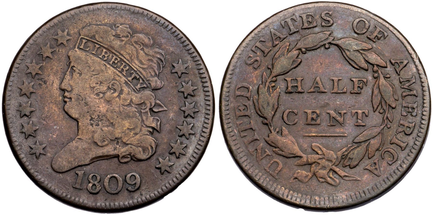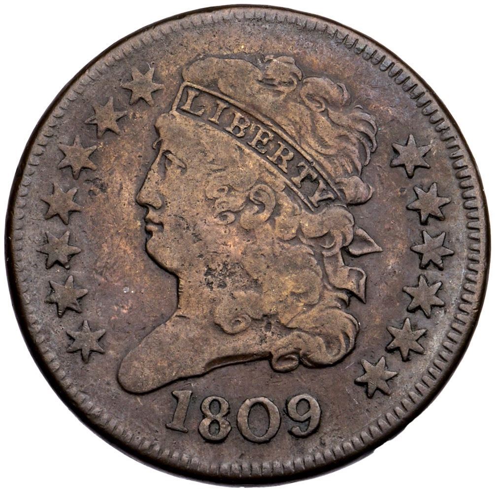 1809 C-1 R-4 VG10F15 sharpness but cleaned long ago and now toned olive and steel brown's with subtle bluish steel tones. There are also some tiny pits on Liberty's neck and right of star 4 visible under a glass. Smooth surfaces otherwise. Manley state 2.0, the reverse has a crack through the tops of MERICA.Certificate Number: Pedigree: Ex Jim McGuigan 1/1980-Gene Braig - HA 7/9/2009:53 - Bob Kebler Collection