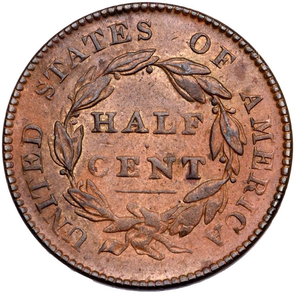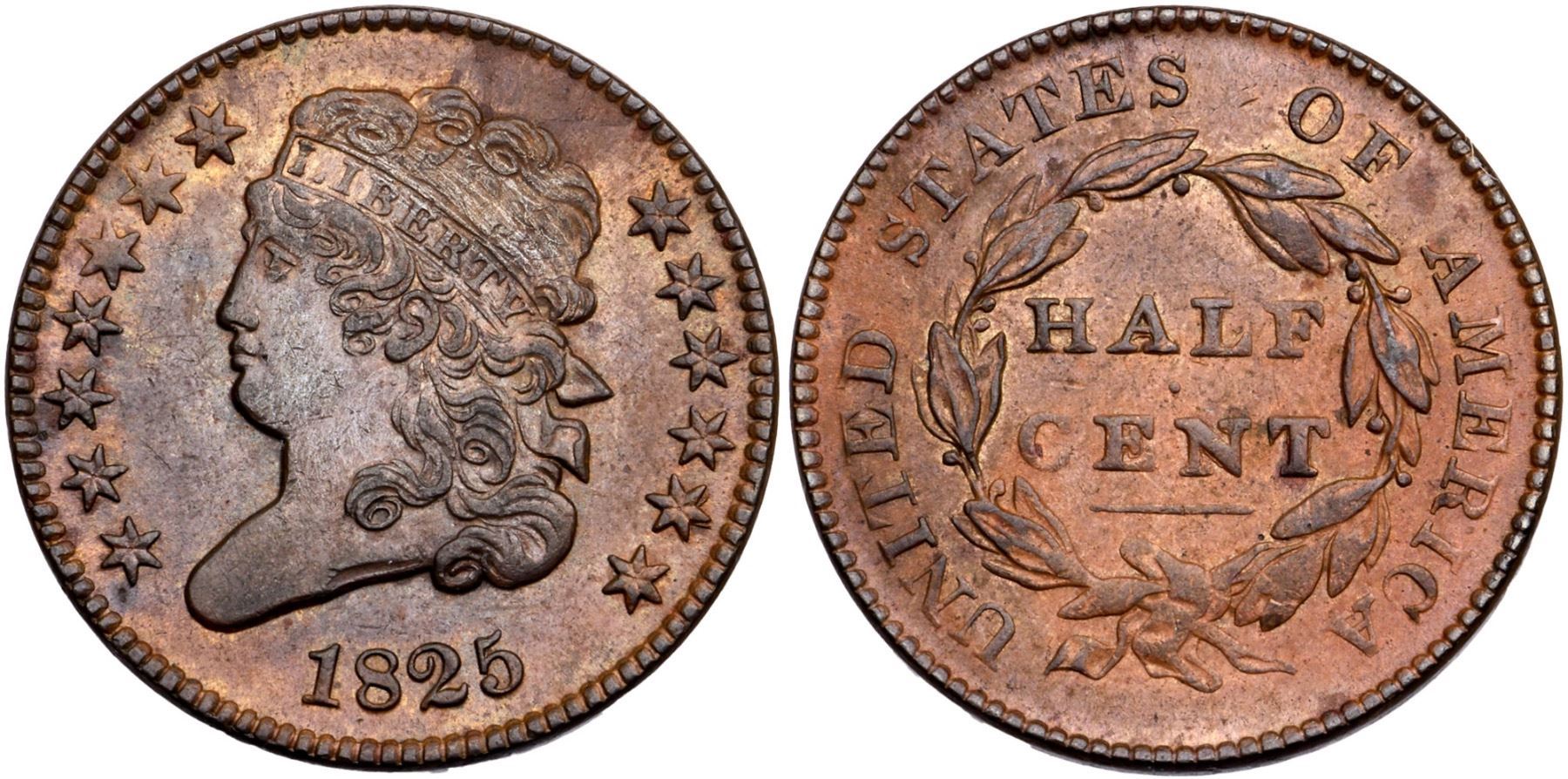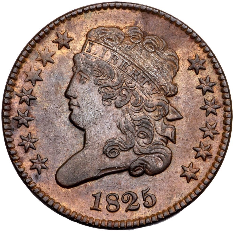 1825 C-2 R-1 MS60Frosty chocolate and steel brown with lighter brown toning around the stars on the obverse. The reverse is frosty steel brown with lighter medium brown toning in the fields. The only marks are a microscopic void at the dentils under star 3 and a tiny horizontal nick under the H in HALF. E-MDS, Manley State 1.0. Removed from a PCGS slab graded MS62BN (1141.62/21500894 label included)Certificate Number: Pedigree: Ex; Bowers & Merena 12/2/2004:107 - Bob Kebler Collection