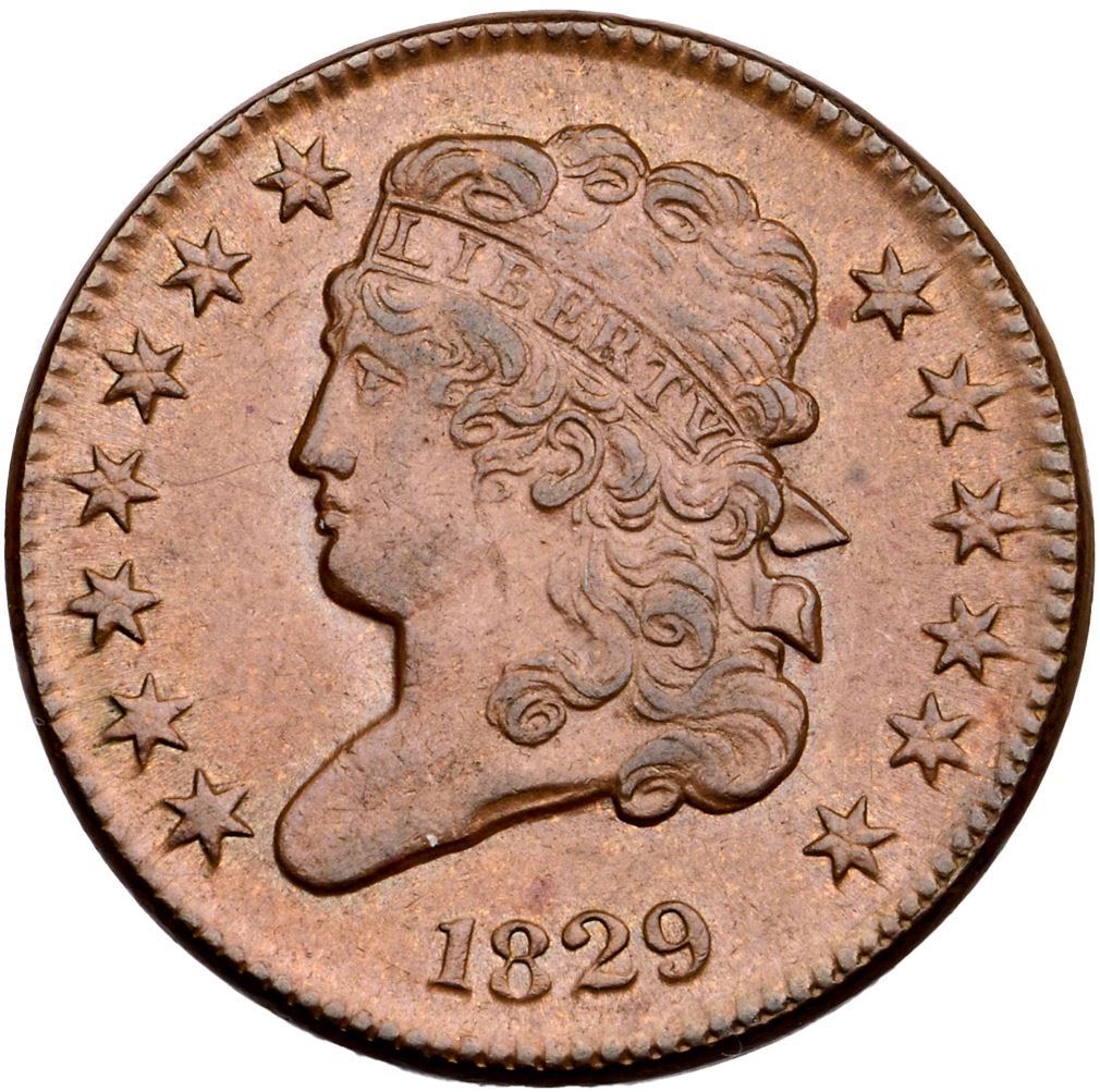 1829 C-1 R-1 AU55Frosty light to medium brown with traces of light bluish steel toning in protected areas of the reverse. No spots, stains, or notable marks. Just a touch of very light friction on the highest points from mint state. Excellent eye appeal. MDS, Manley State 2.0. Removed from an old PCGS MS63BN holder (1153.63/8435402 label included).Certificate Number: Pedigree: Ex; Superior 9/19/2005:211 - Bob Kebler Collection