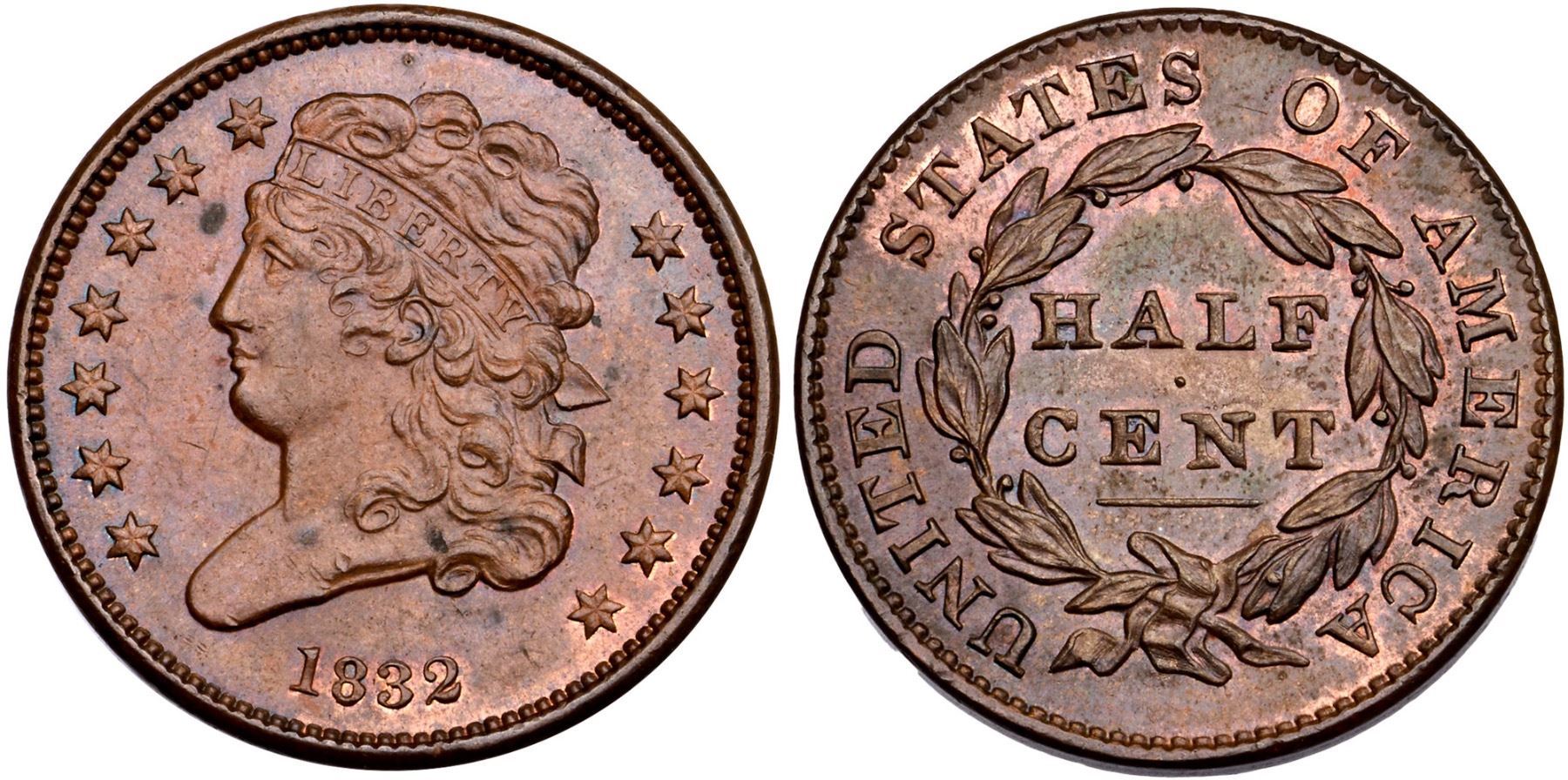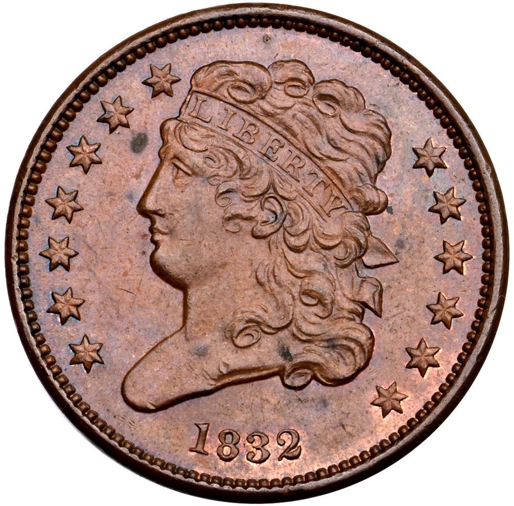 1832 C-1 R-2 MS62Frosty light bluish steel brown with traces of the mint red remaining. There are a few tiny nicks along the bottom edge of the bust and a small spot of carbon in the field near the forehead. Otherwise choice. Frosty mint luster covers the entire surface of the coin. Scarce EDS, before any trace of the reverse die crack to A in STATES. Manley State 1.0. Removed from a PCGS MS64BN holder (1159.64/5837732 label included).Certificate Number: Pedigree: Ex; Superior 6/3/2002:2380 - Bob Kebler Collection
