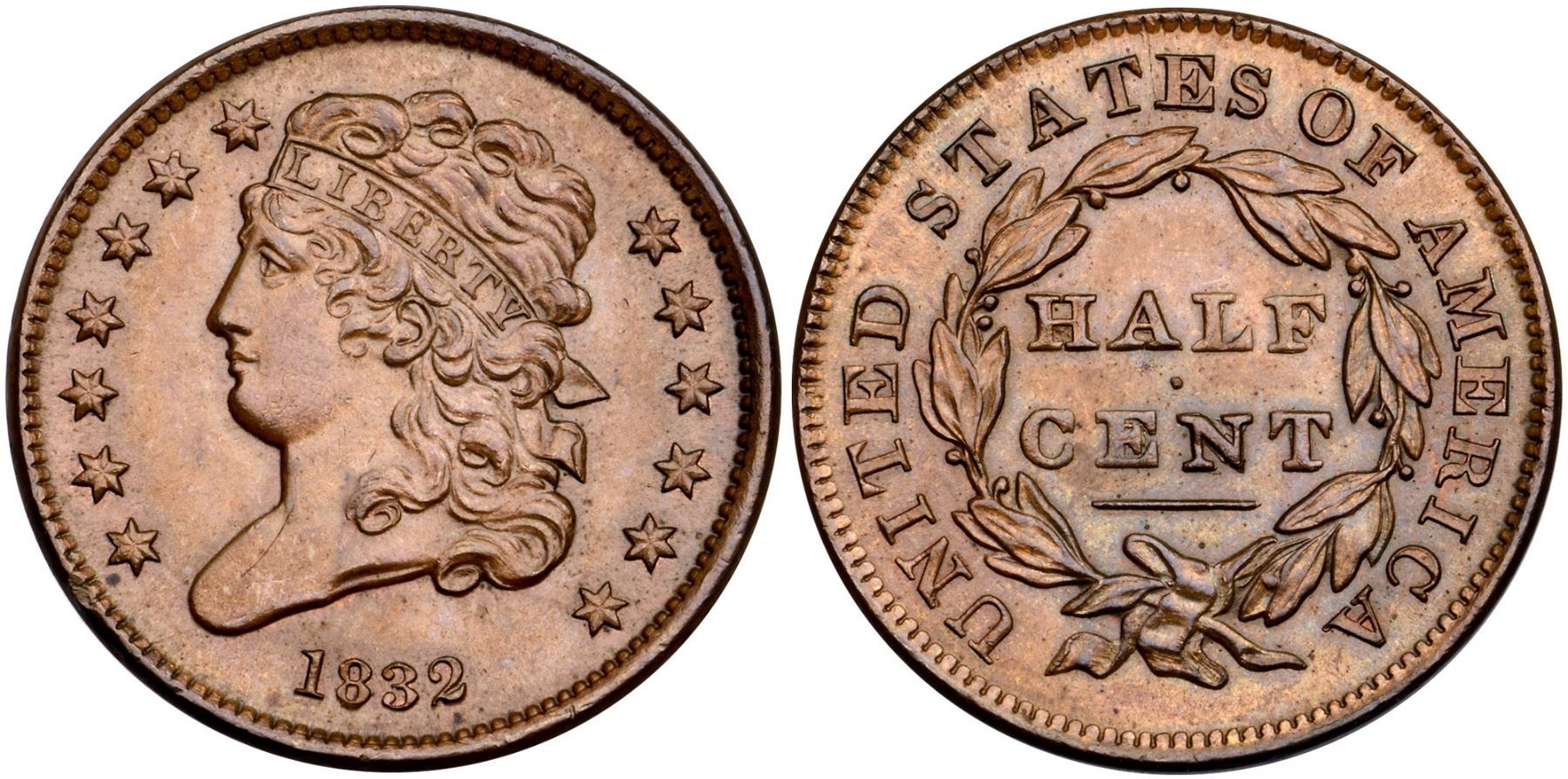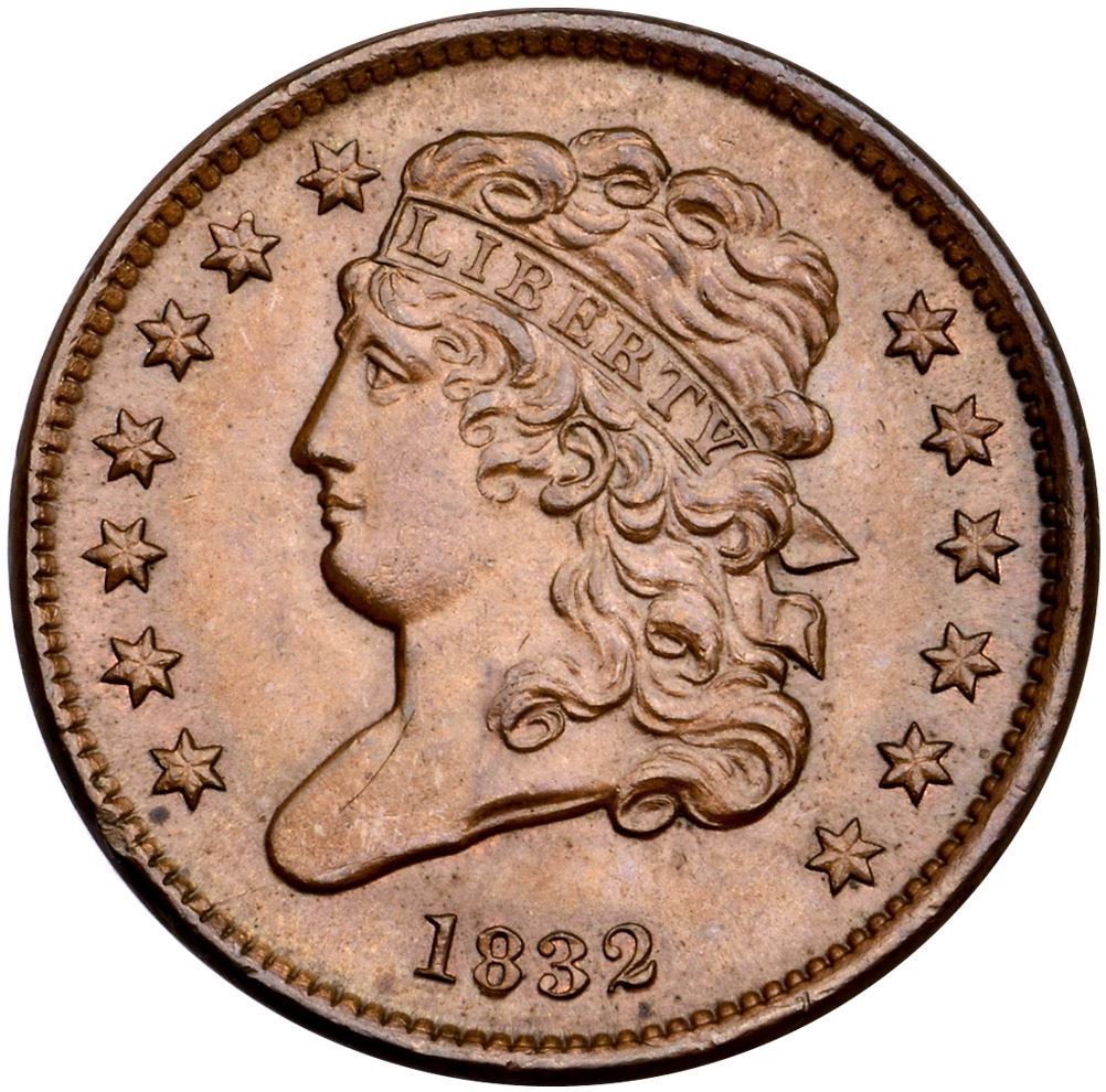 1832 C-2 R-2 MS63Attractive tan brown and bluish steel with peeps of very faded mint red in some protected areas. The only marks are a small hairline scratch on the bust tip and a rim nick at star 1. Frosty, lustrous surfaces. Choice. LDS, Manley state 3.0. Broken out of an old PCGS MS64BN holder (1159.64/4105269 label included).Certificate Number: Pedigree: Ex; Tom Reynolds 6/2003 - Bob Kebler Collection