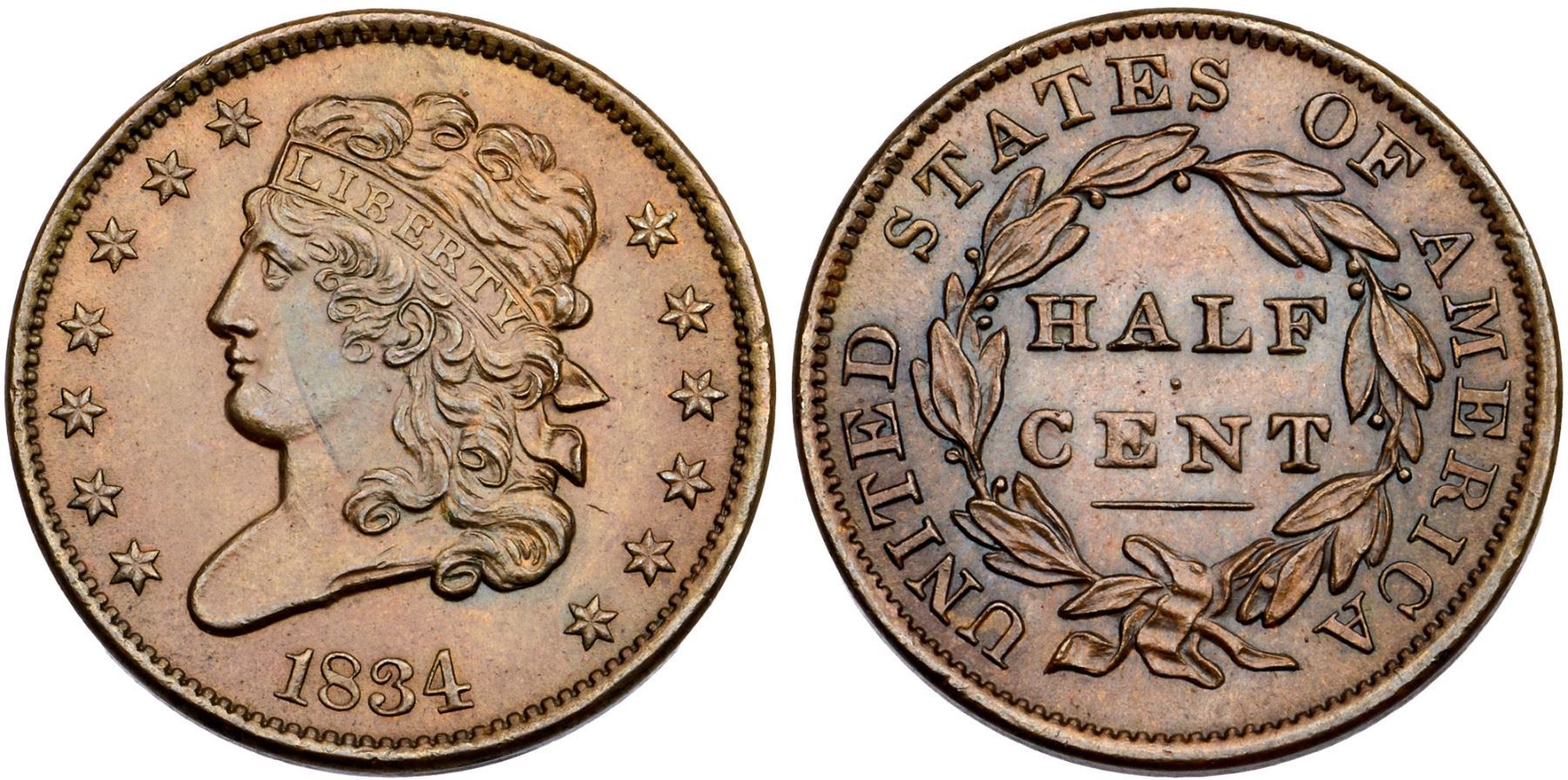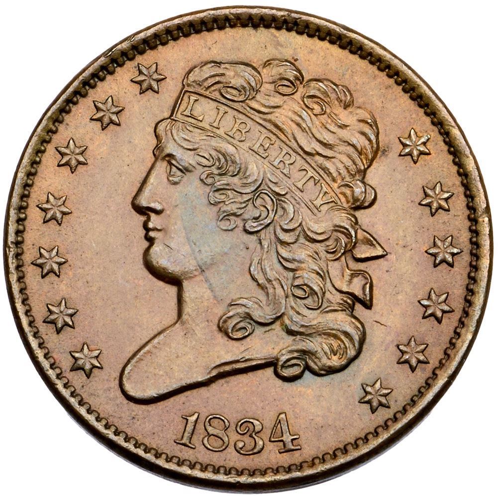 1834 C-1 R-1 MS63Attractive light brown mellowed down from very faded mint color with an oval area of deeper olive on the portrait and subtle steel toning highlighting some of the devices. Fully lustrous with semi-reflective surfaces. EDS, Manley state 1.0. Removed from an NGC MS64BN holder with the Jules Reiver provenance noted (656377-005 label included).Certificate Number: Pedigree: Ex; Col. J. A. Porter - B. Max Mehl 6/23/1942:121 - Harold Bareford - William Bareford 5/25/1984-Jules Reiver HA 1/24/2006:19123 - Bob Kebler Collection