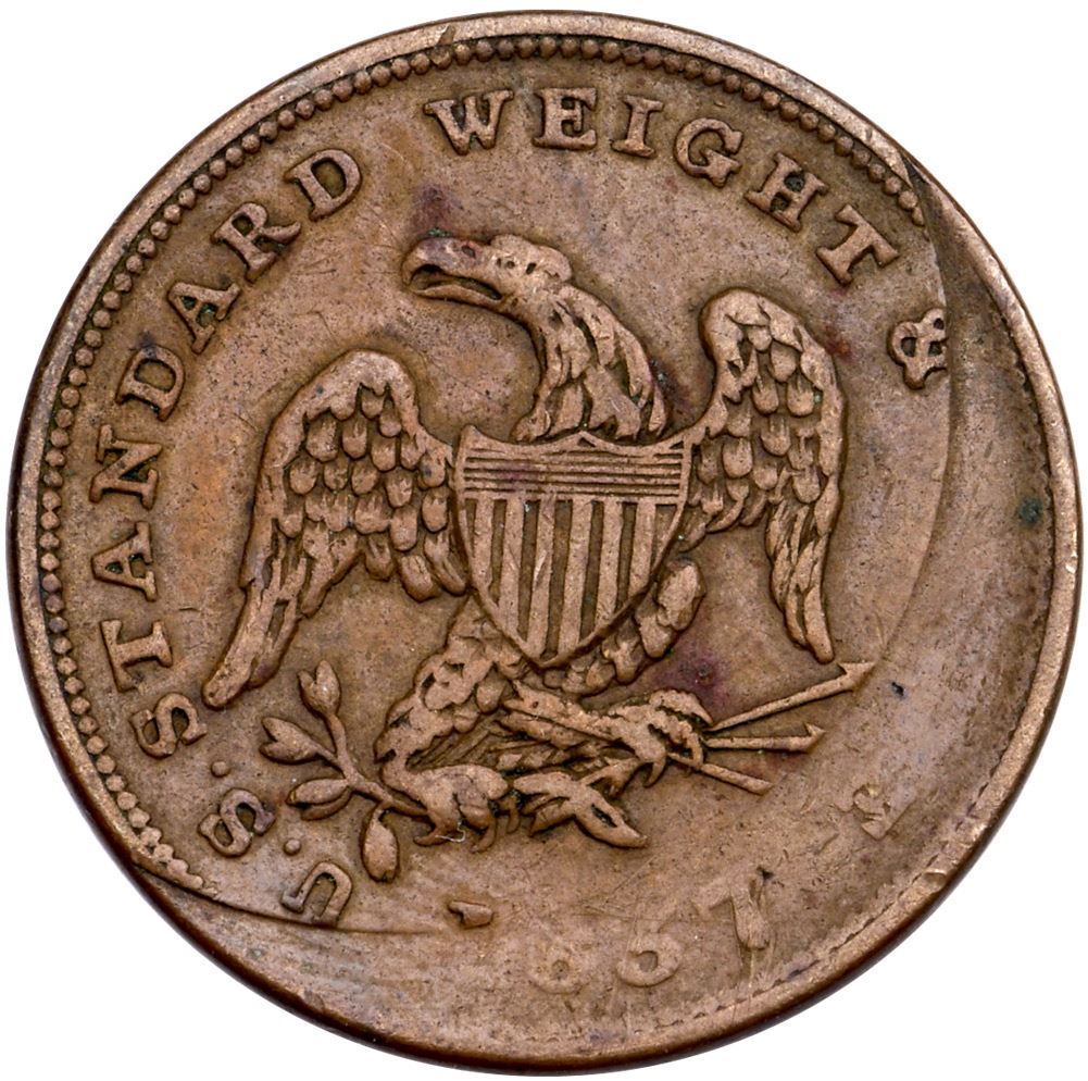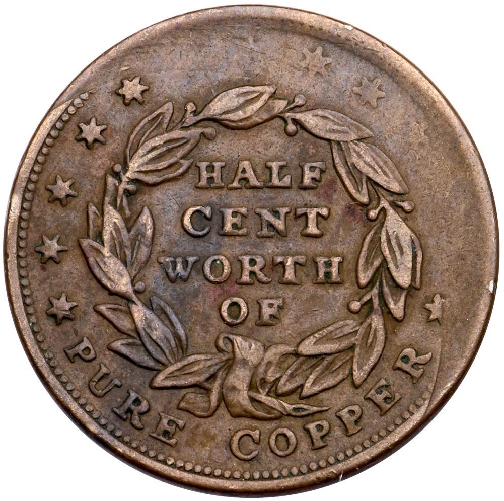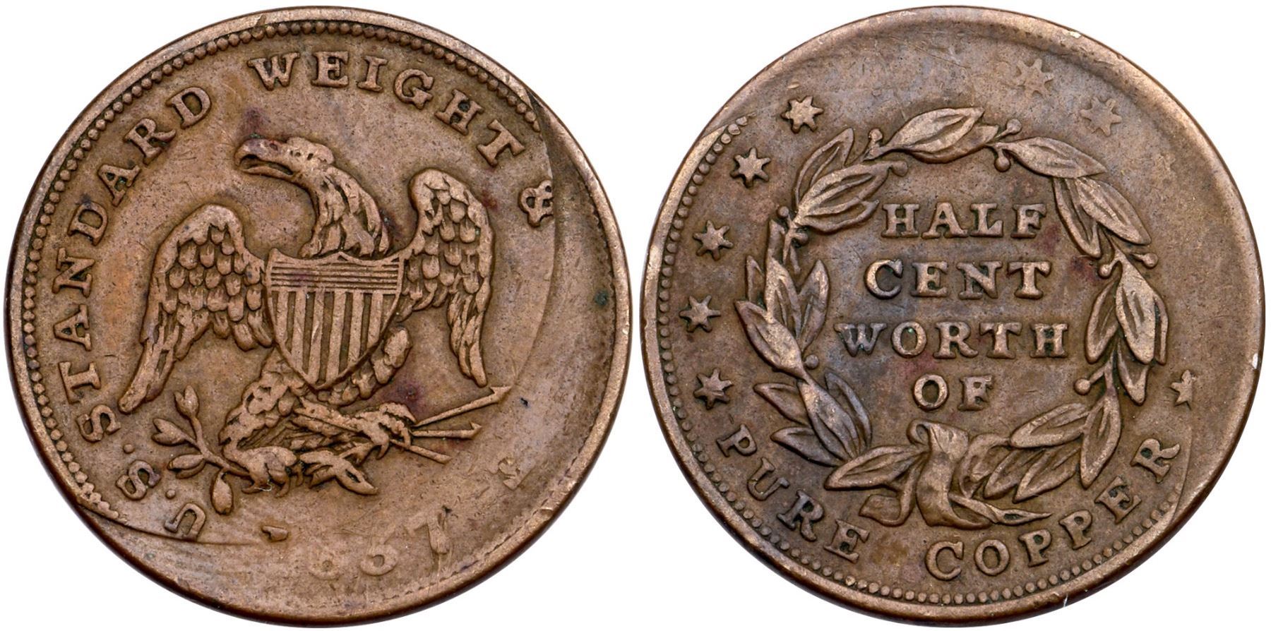 1837 HT-73 Half Cent Worth of Pure Copper VF25Pleasing light brown obverse, olive brown with swipes of deeper steel on the reverse. There are a couple maroon spots of shallow scale over the talon holding the arrows and above the eagle's head, and a few more inside the wreath, as well as old hairline scratches on the date. Mint Error, struck out of register with an arc impressed on both sides flattening out the strike along the peripheries and leaving behind weaker details. Certificate Number: Pedigree: Ex; Don Valenziano Jr - R. Tettenhorst 2015 - Bob Kebler Collection