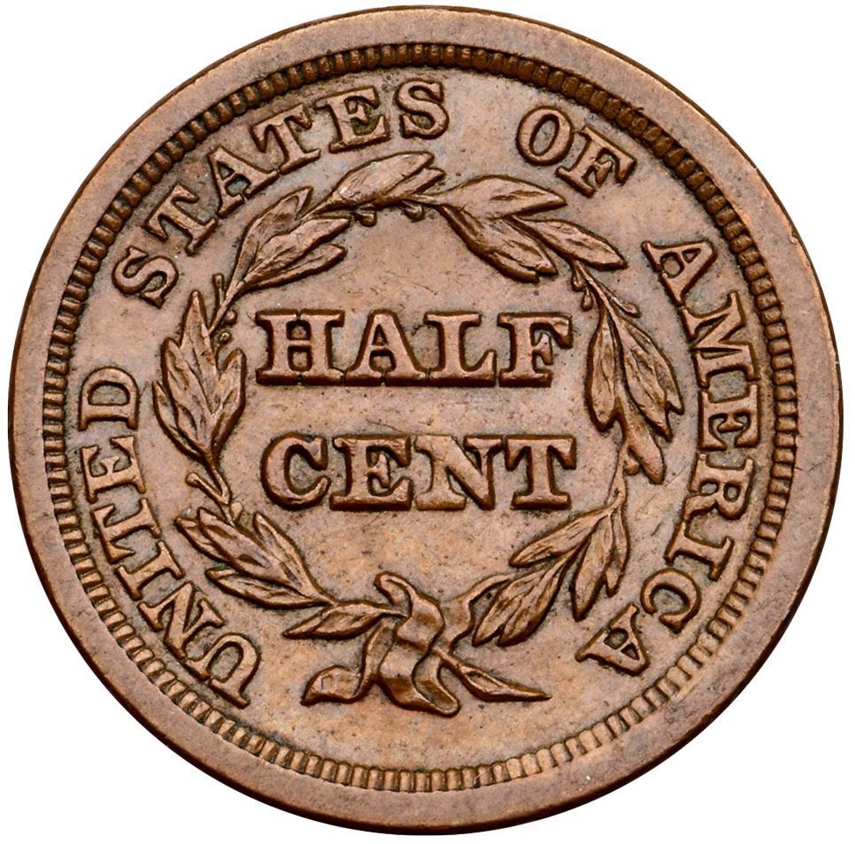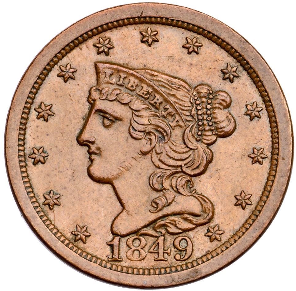 1849 C-1 R-2 AU55Rather glossy light brown brown surfaces. There are trivial marks and abrasions, nothing noteworthy or distracting, and dark crud buildup in some protected areas. Smooth surfaces with mint frost. Manley state 1.0.Certificate Number: Pedigree: Ex; Laurence H. Gardner Collection from the Buffalo and Erie County Historical Society - Stack's 3/15/2005:982 - Bob Kebler Collection