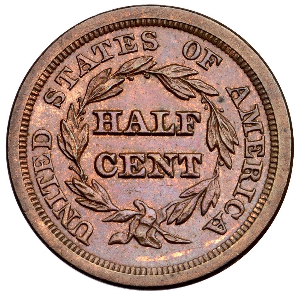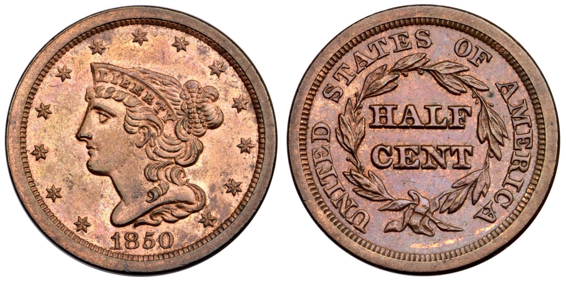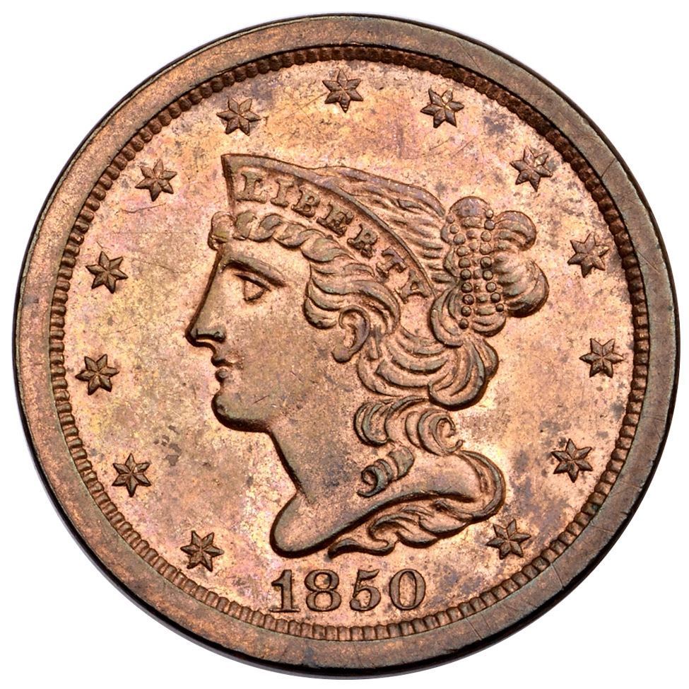 1850 C-1 R-2 MS60Attractive brilliant mint red with iridescent red and steel toning on the obverse, deeper chocolate and bluish steel on the reverse with underlying faded mint red. There are wispy hairline scratches along the right obverse rim, and a few in the fields visible under a glass. Lustrous, somewhat reflective surfaces. Manley state 1.0. Removed from an old NGC MS63RB holder (181132-011, label included).Certificate Number: Pedigree: Ex; Tom Reynolds - Greg and Lisa Heim American Numismatic Rarities 6/27/2006:512 - Bob Kebler Collection