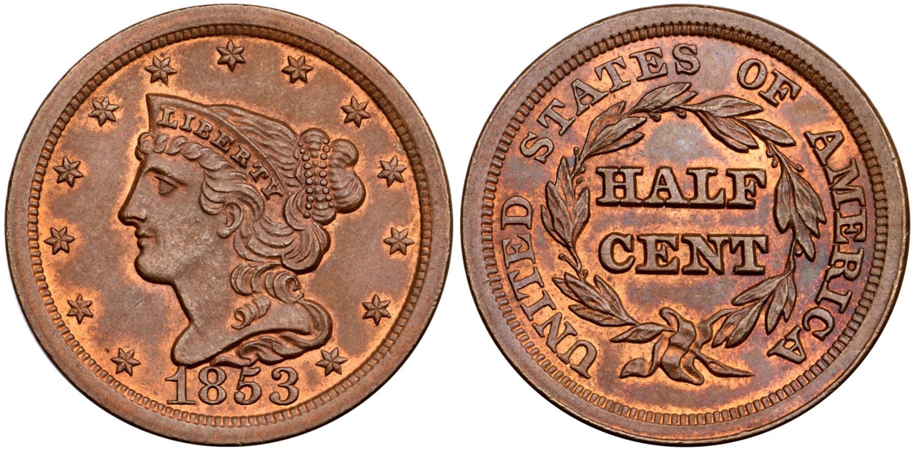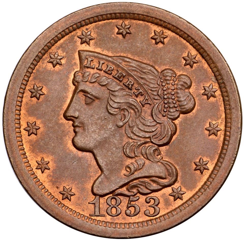 1853 C-1 R-1 MS60Mostly deep steel with underlying lustrous original mint red remains underneath in some fields and protected areas, especially on the reverse. Somewhat matte appearance on the obverse. Free of notable marks otherwise. Manley state 1.0. Removed from an ANACS MS63RB holder (2566952 label included).Certificate Number: Pedigree: Ex; Tom Reynolds 2/14/2004 - Bob Kebler Collection