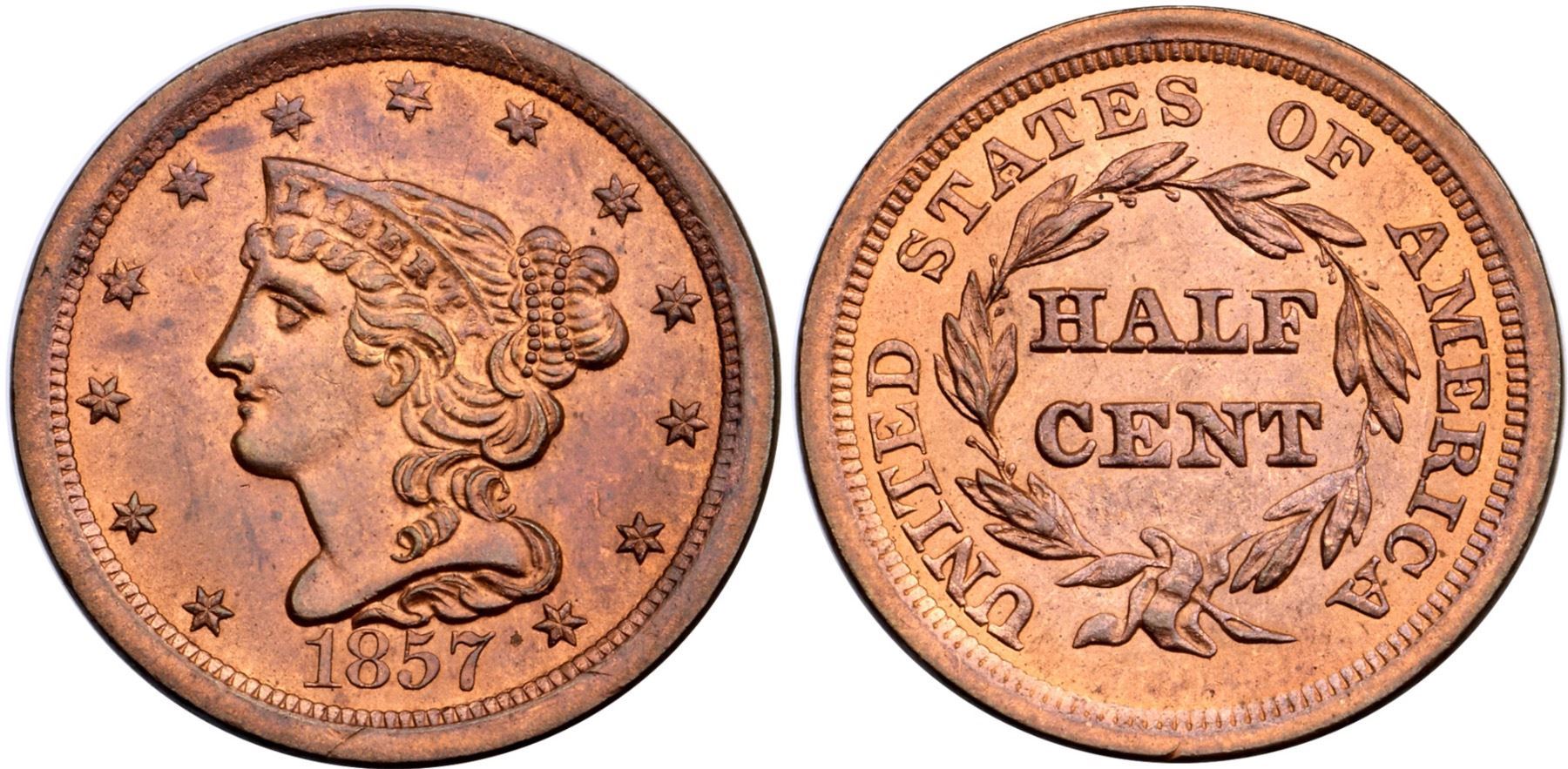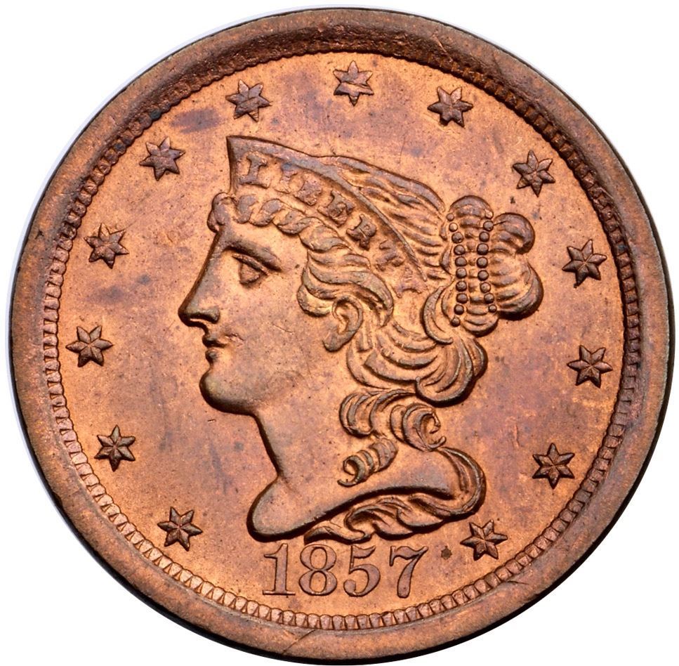 1857 C-1 R-2 MS63Frosty faded mint red with subtle bluish steel toning. There are a few trivial marks on the fields and devices, nothing major or distracting. Satiny, lustrous surfaces. Manley state 1.0.Certificate Number: Pedigree: Ex; Tom Reynolds - 6/11/2003 - Bob Kebler Collection