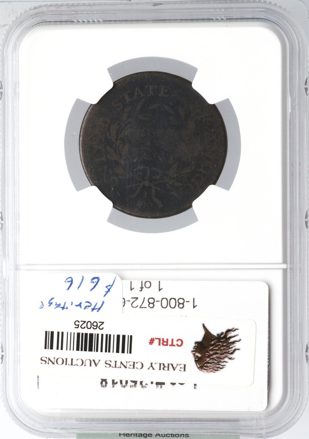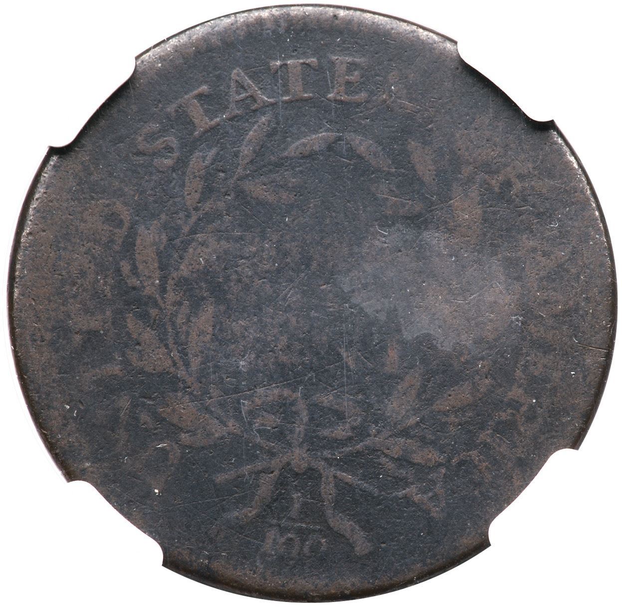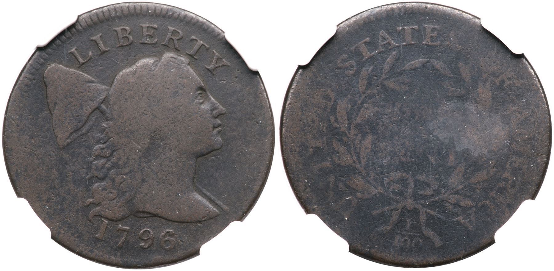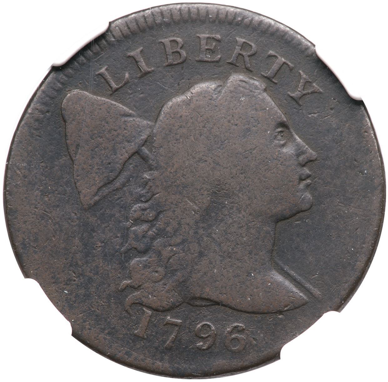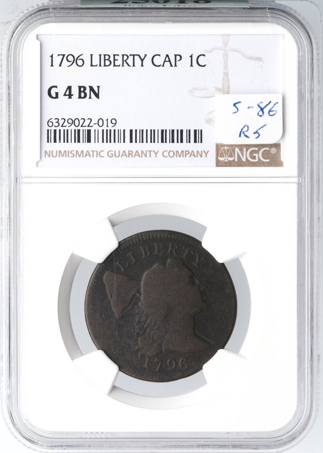 1796 S-86 R-5 NGC G4Semi-glossy medium have and dark steel brown surfaces. There are a couple faint hairline scratches including one below the cap and another below CENT, both that blend in well to the toning. The obverse is a couple points sharper than the reverse, with bold date and LIBERTY, while ONE is nearly gone and CENT and OF are weak. Our grade is G4.Certificate Number: 6329022-019Pedigree: Ex; HA 12/2022 - Dennis Fuoss