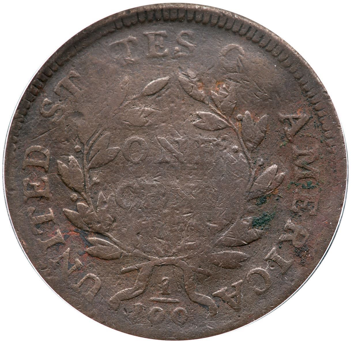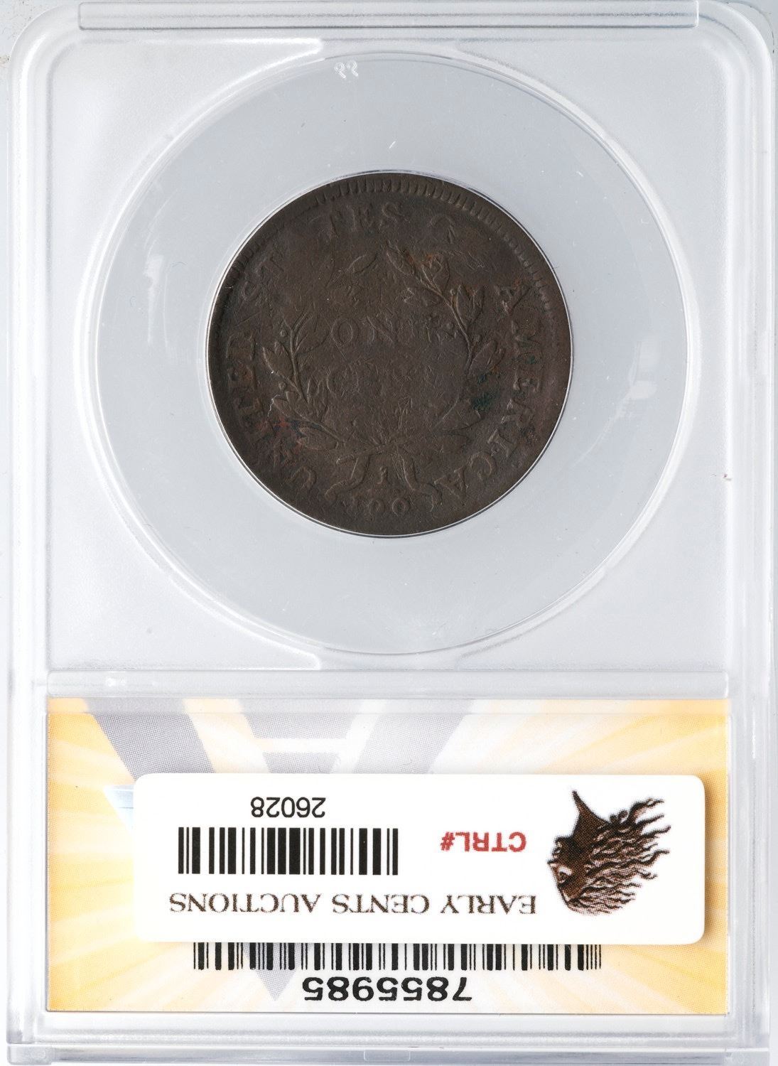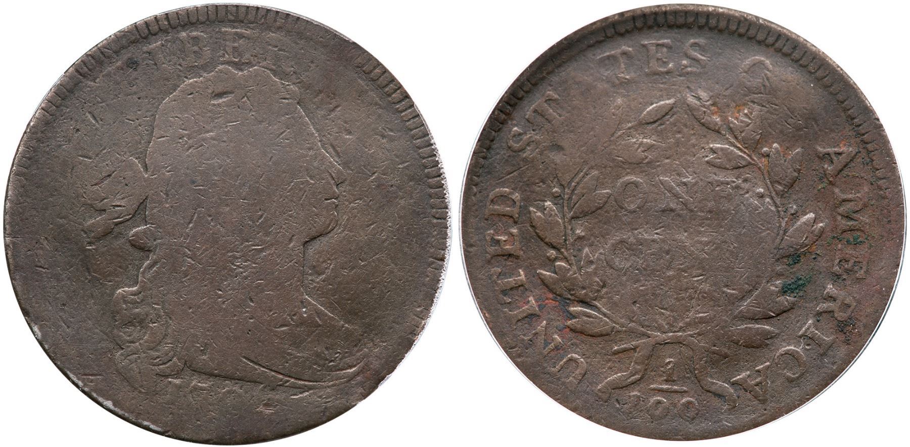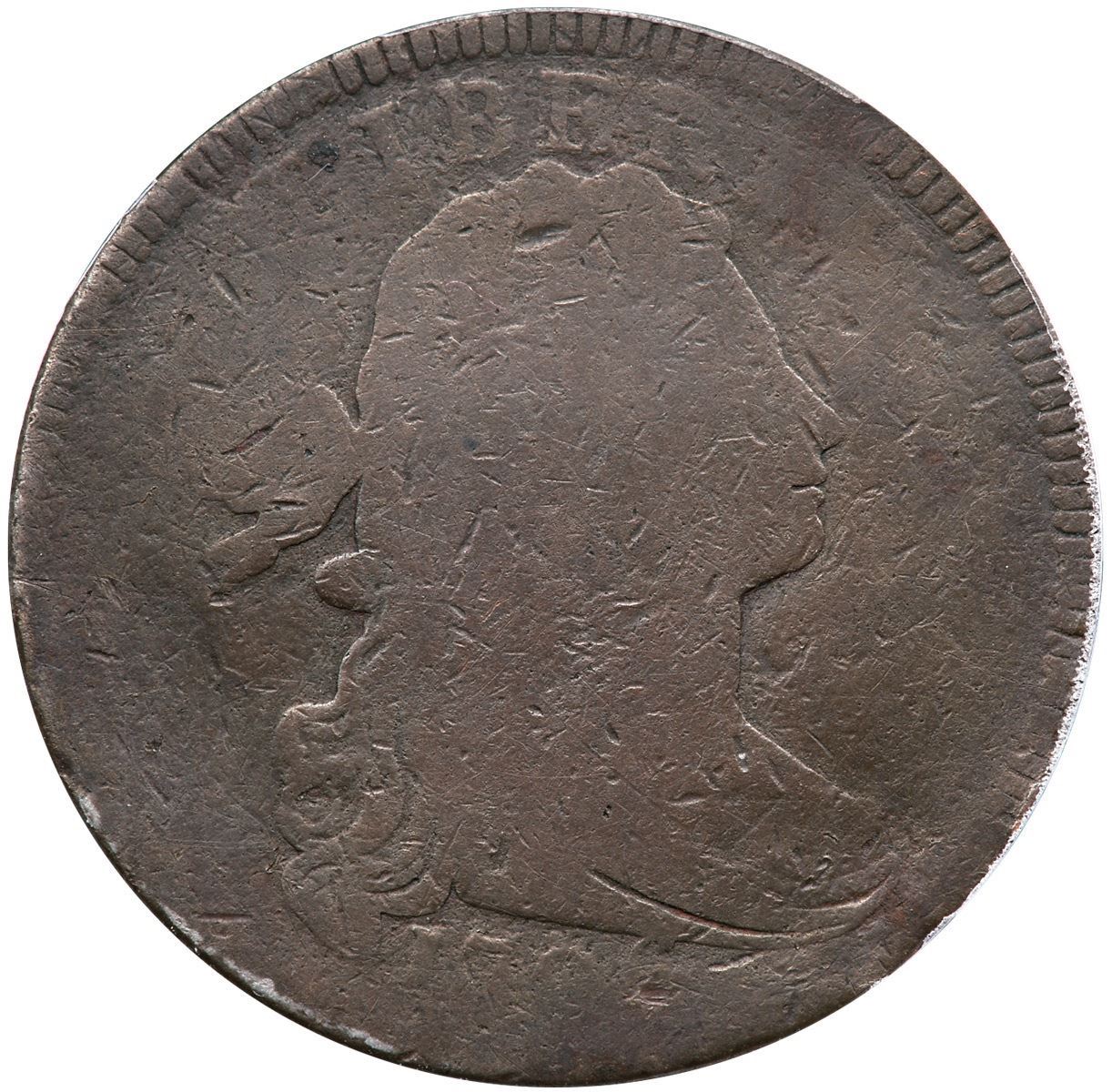 1796 S-114 R-5- ANACS G4 Details (Corroded, Scratched)A point or two sharper but corroded with traces of old verdigris and shallow scale around UNITED and AMERICA. There are also various nicks and minor pin scratches scattered on both sides. Pleasing chocolate and olive browns. The bottom half of the date weak but can just be made out, and partial legends on this scarce variety. Our grade is FR2.Certificate Number: 7855985Pedigree: Ex; Dennis Fuoss
