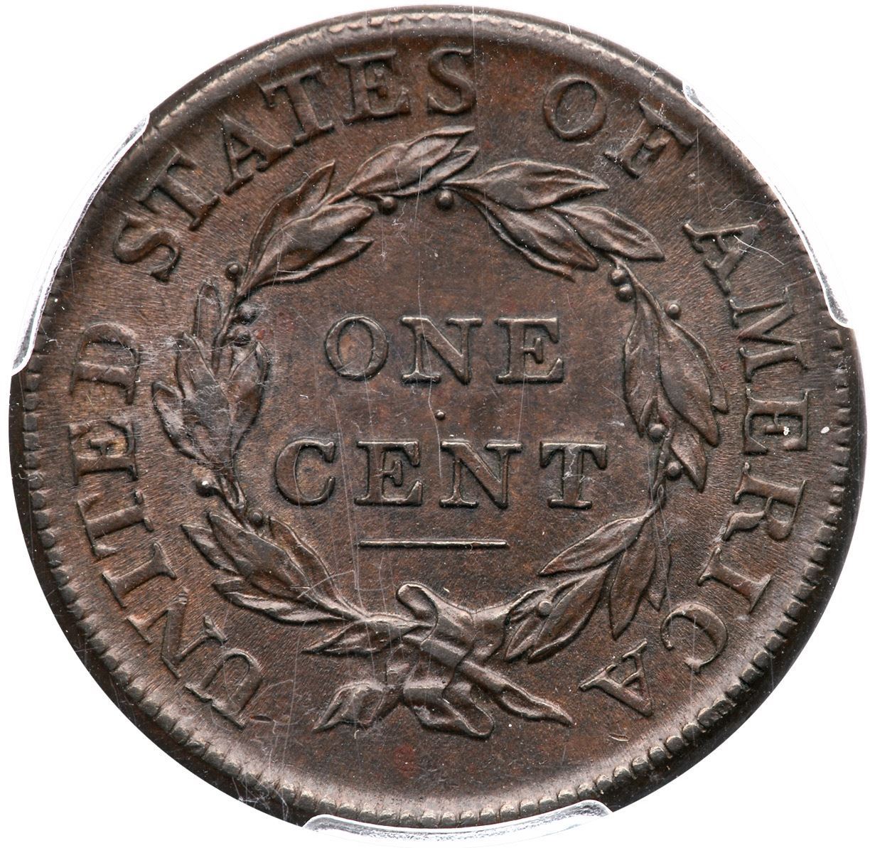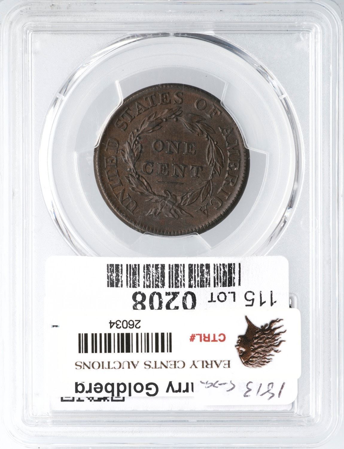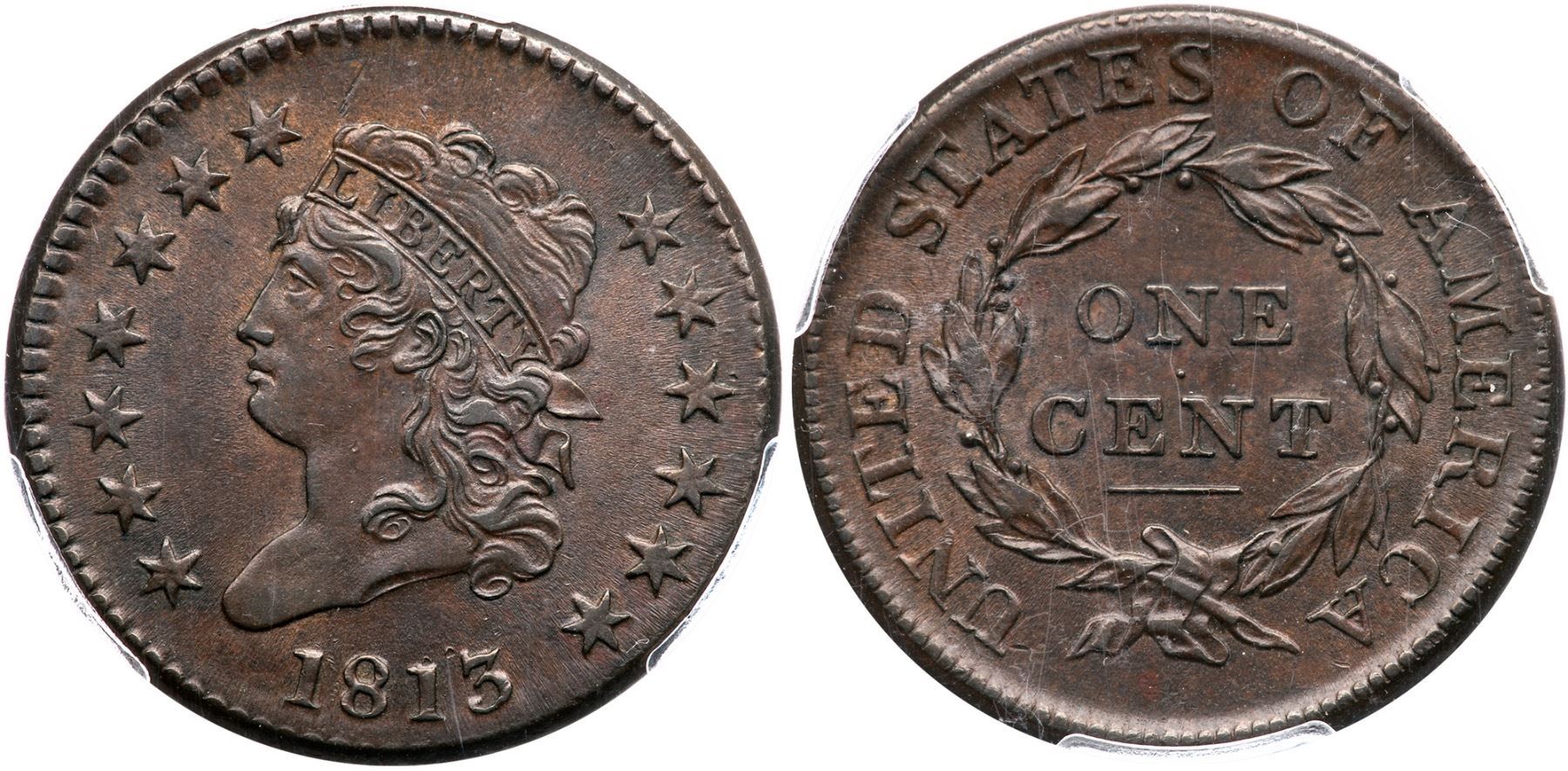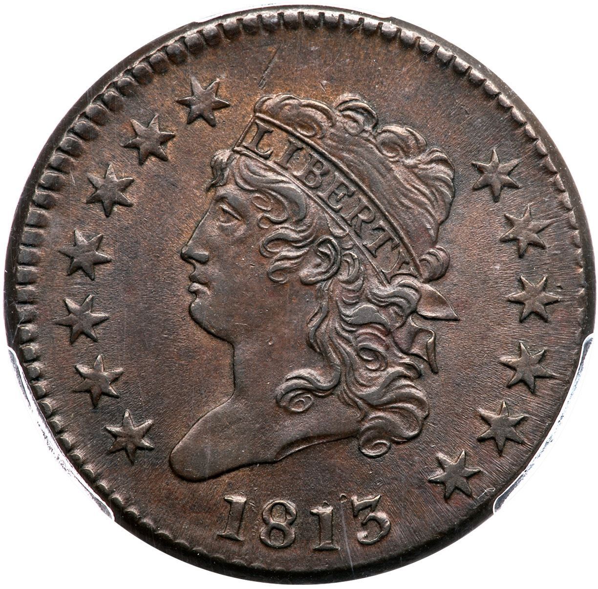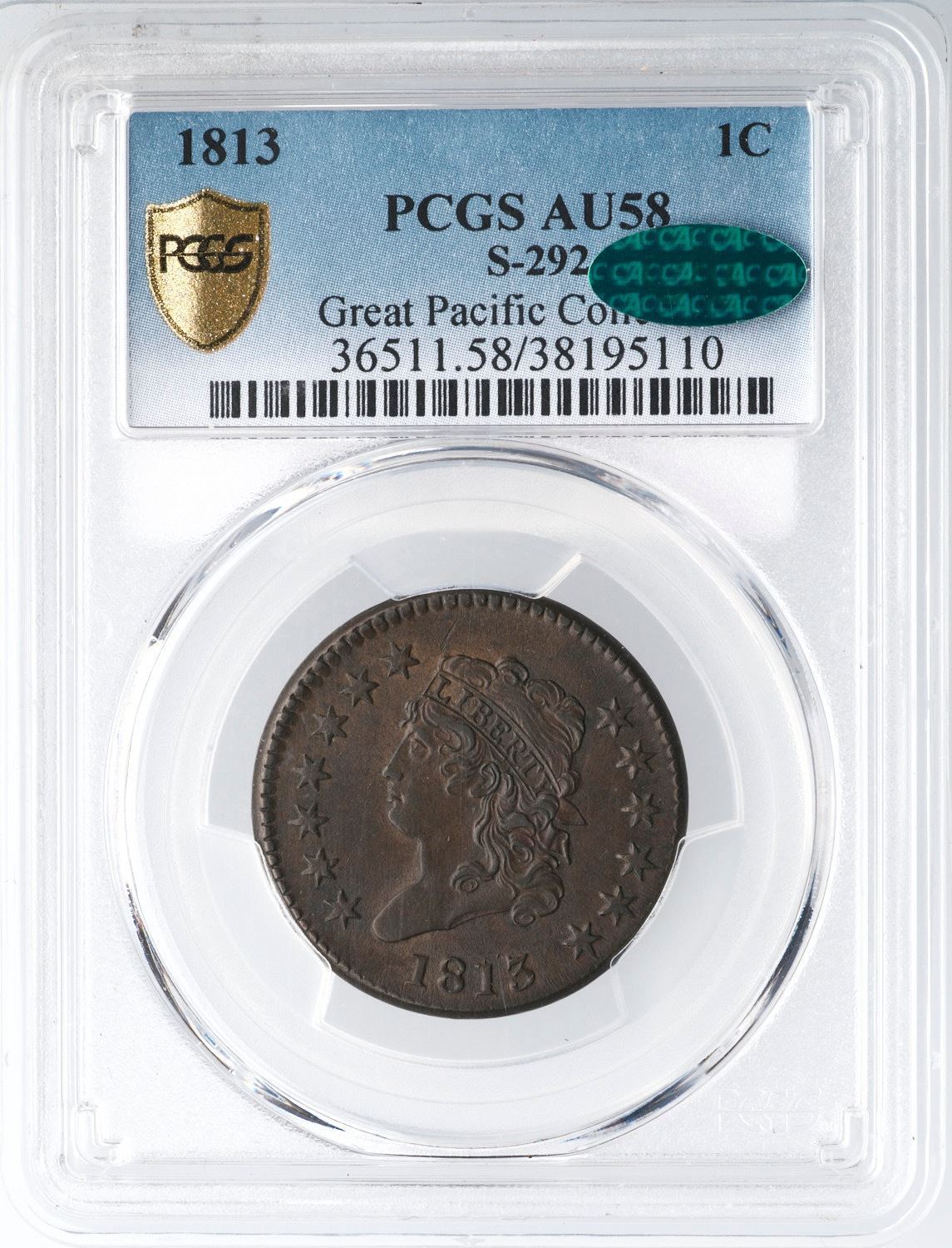 1813 S-292 R-2 PCGS AU58 CACChoice frosty medium steel brown and chocolate. Looks mint state but there is a touch of friction on the highest points. The only marks are a pair of tiny pin pricks over the 13 in the date, a tiny tick on the end of the nose, and a thin nick in the field over the front edge of the head. MDS, Breen state III, with delicately flowlined fields and dull die clashmarks on both sides. Extensive doubling shows on ONE CENT, and some letters display triple outlines from die bounce. Struck slightly off center to K-4.5. Our grade is AU50+, very close to AU55. Noyes photo #20487. CAC certified.Certificate Number: 36511.58/38195110Pedigree: Ex; T. Werner-George Ramont-William C. Noyes, 1989 EAC Sale, lot 169 (as AU50) - Robert W. Everett -Allan Kollar, McCawley & Grellman Auctions/Superior 5/29/2005:1041 - Great Pacific Collection - Dennis Fuoss