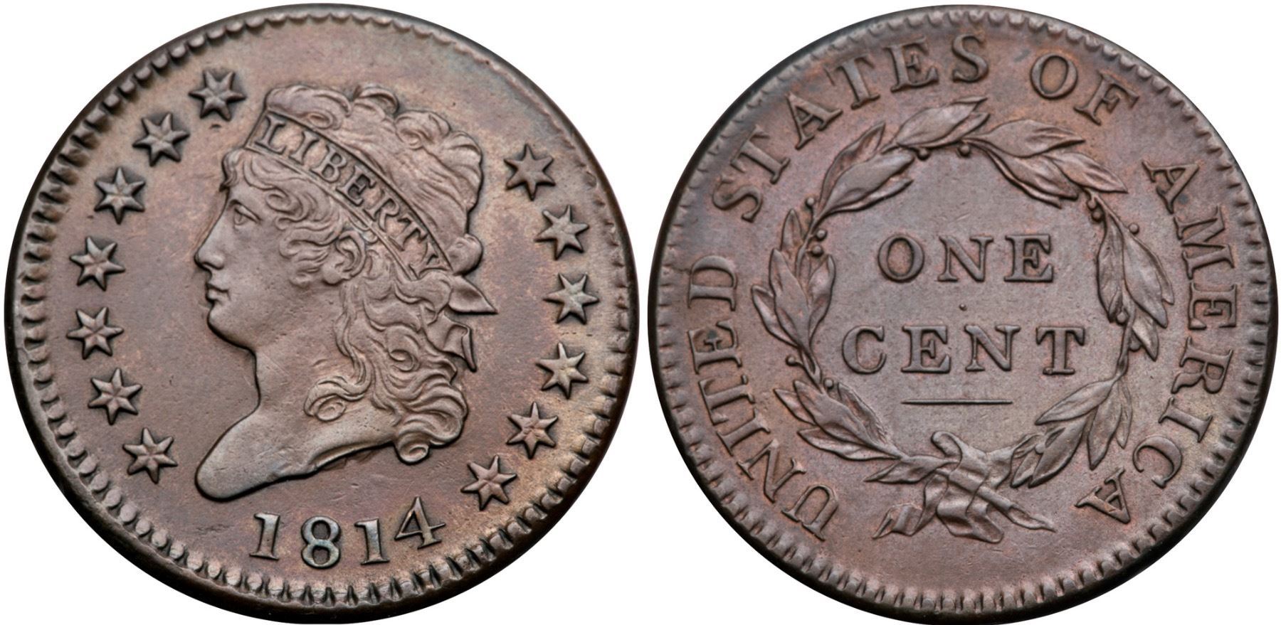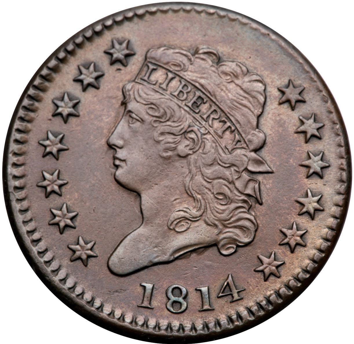 1814 S-295 R-1 VF355 points sharper but lightly cleaned and nicely retoned glossy chocolate brown with some frosty lighter steel brown in the protected areas. The reverse also has subtle overtones of reddish steel and dark olive toning at the rim over D-STATES. The only mark is a tiny pinprick under star 7. No verdigris, smooth surfaces. E-MDS, Breen state II.Certificate Number: Pedigree: Ex; Jonathen Kern 3/1985 - March Wells Goldbergs 2/2009:643 - Dennis Fuoss