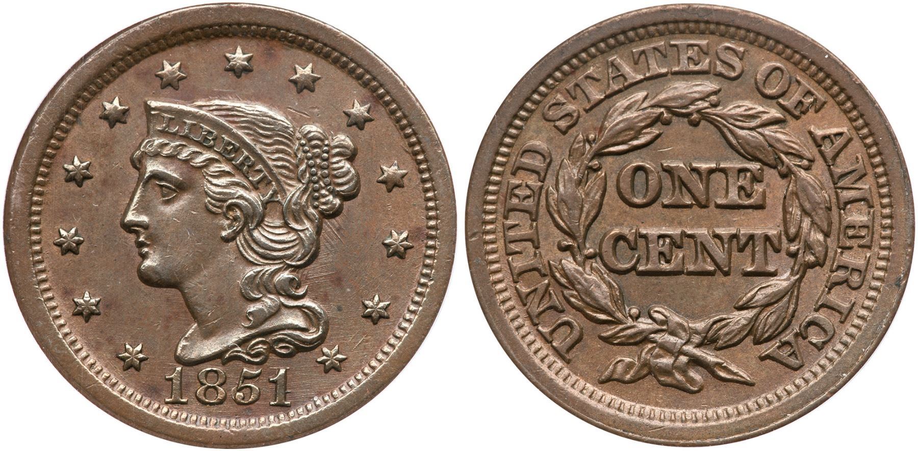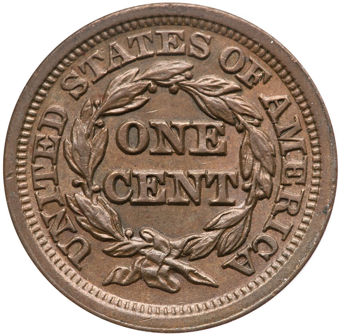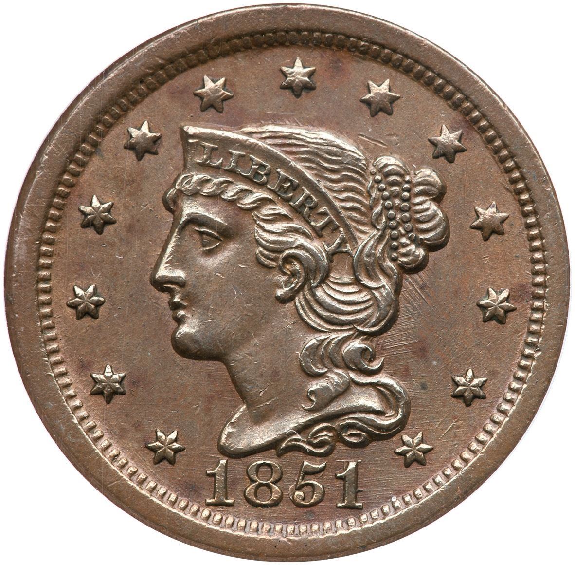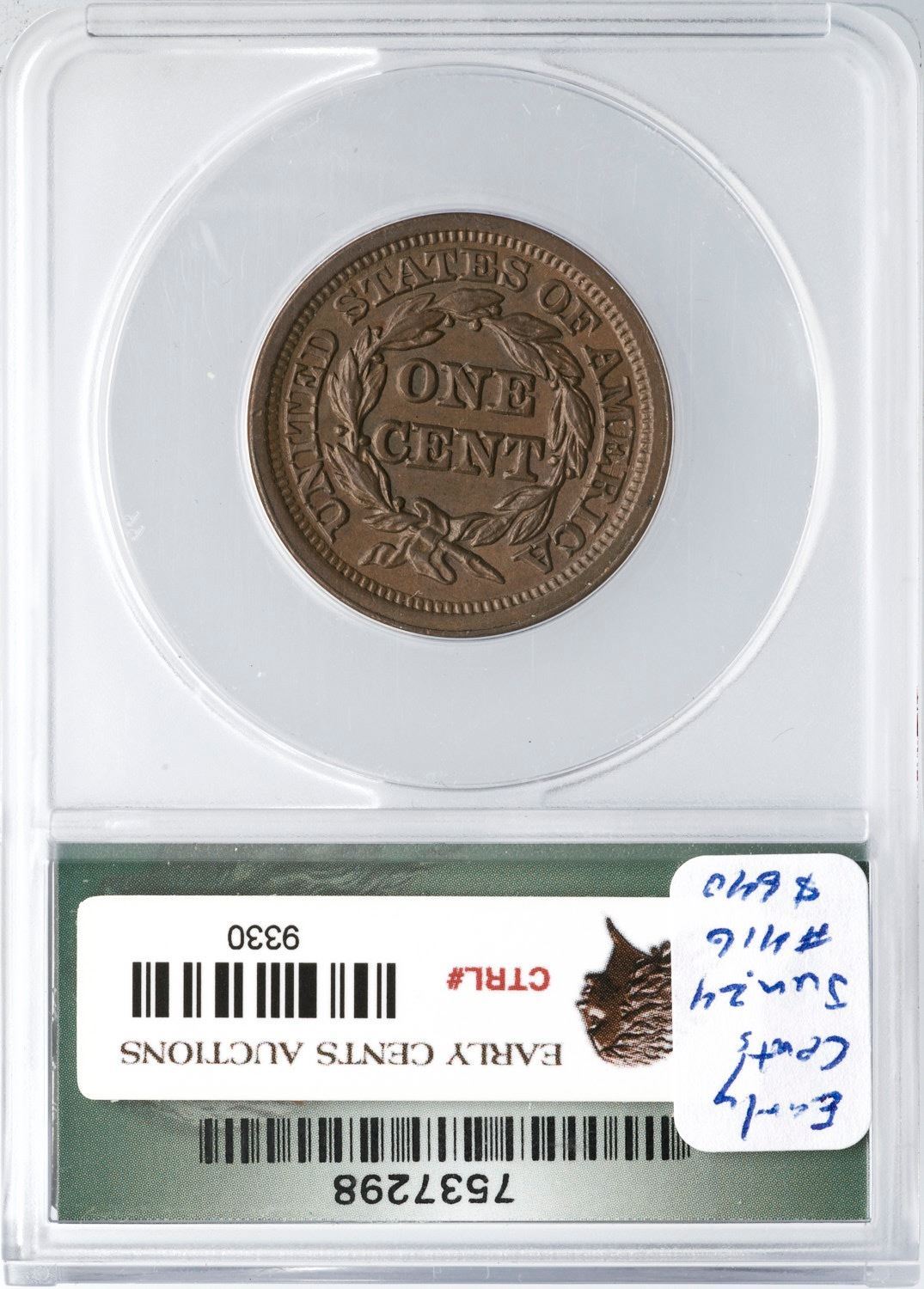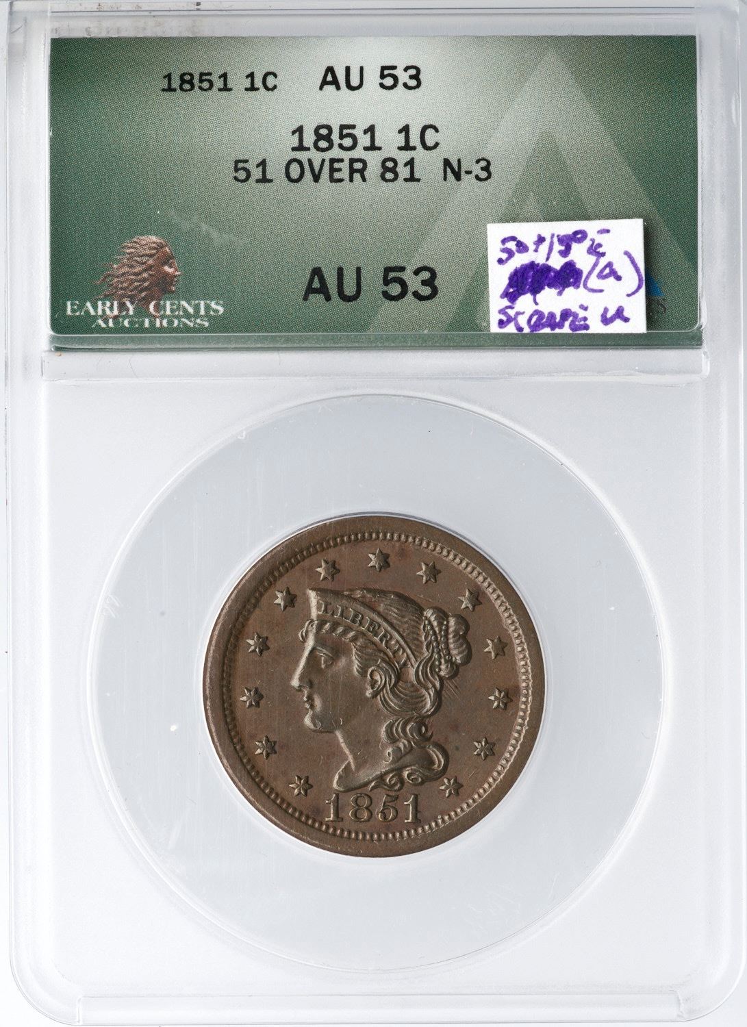 1851/81 N-3 R-1 ANACS AU53Frosty light to medium brown. Sharply struck and very attractive. The only mark is a light scuff on the leaf under the U in UNITED. EDS, die state a, with die lines in the obverse fields. The 51/81 feature is strong. A nice example of this "Redbook" variety. Our grade is AU50.Certificate Number: 7537298Pedigree: Ex; Early Cents Auctions 6/2024:416 - Dennis Fuoss