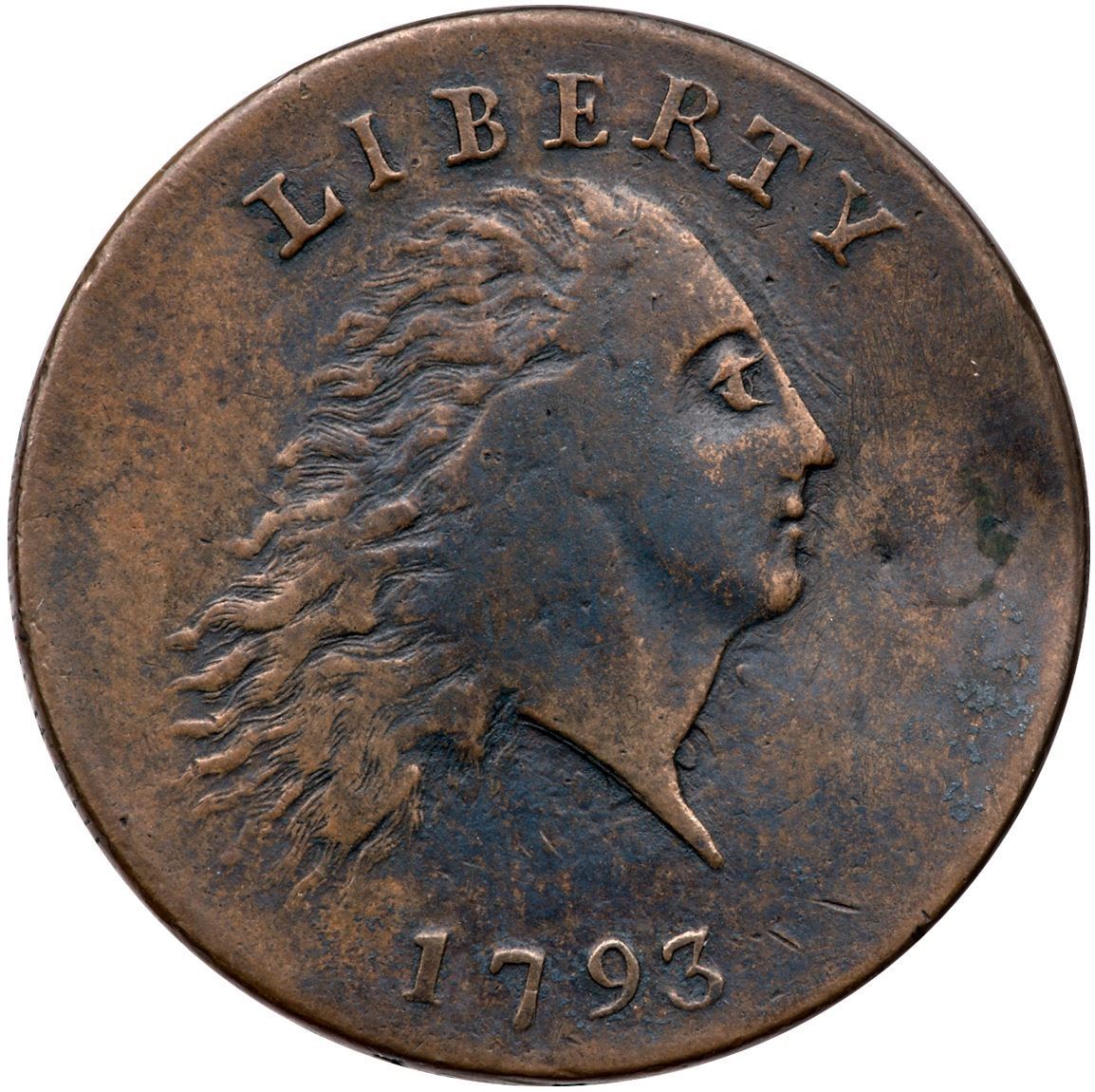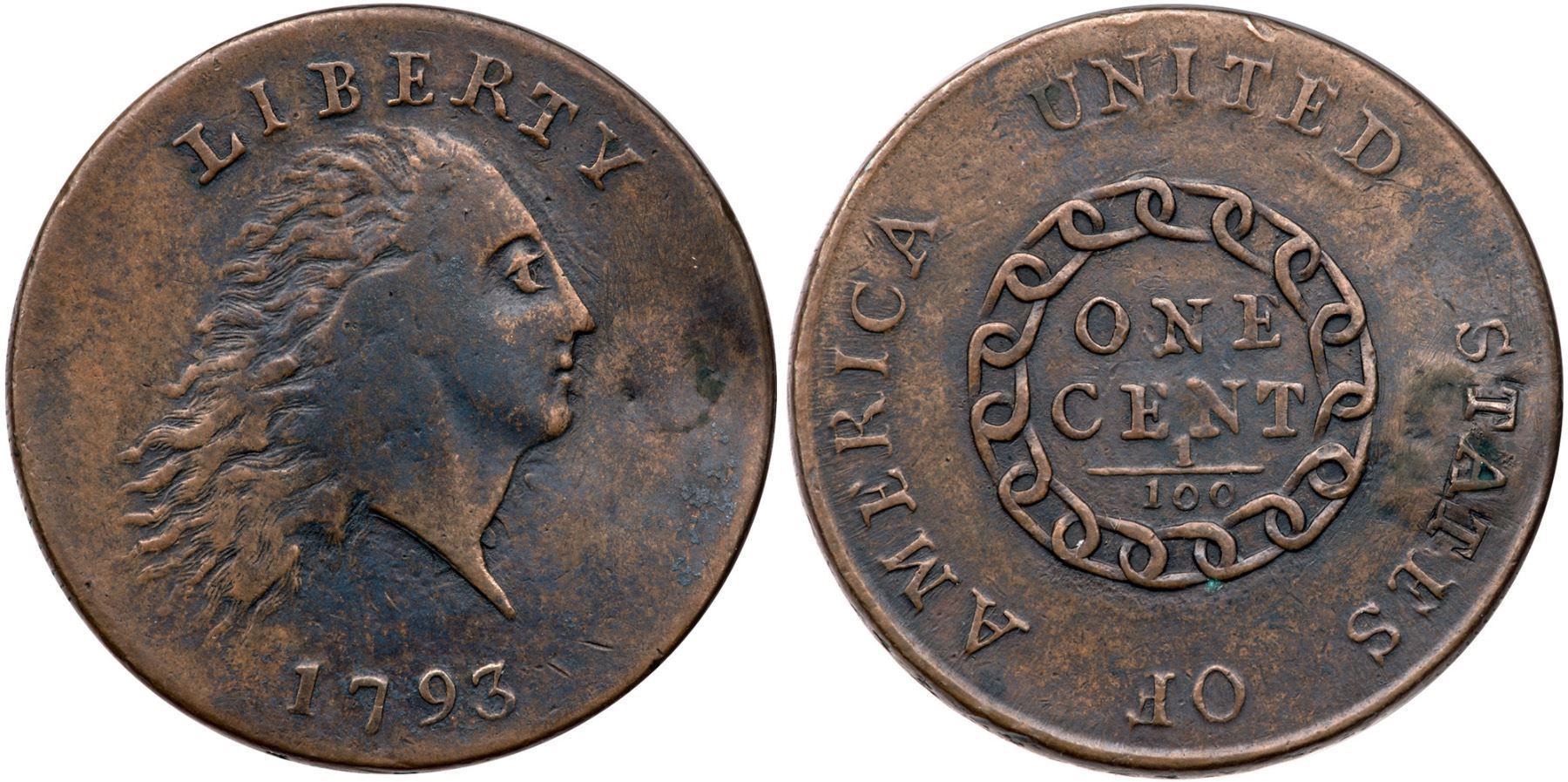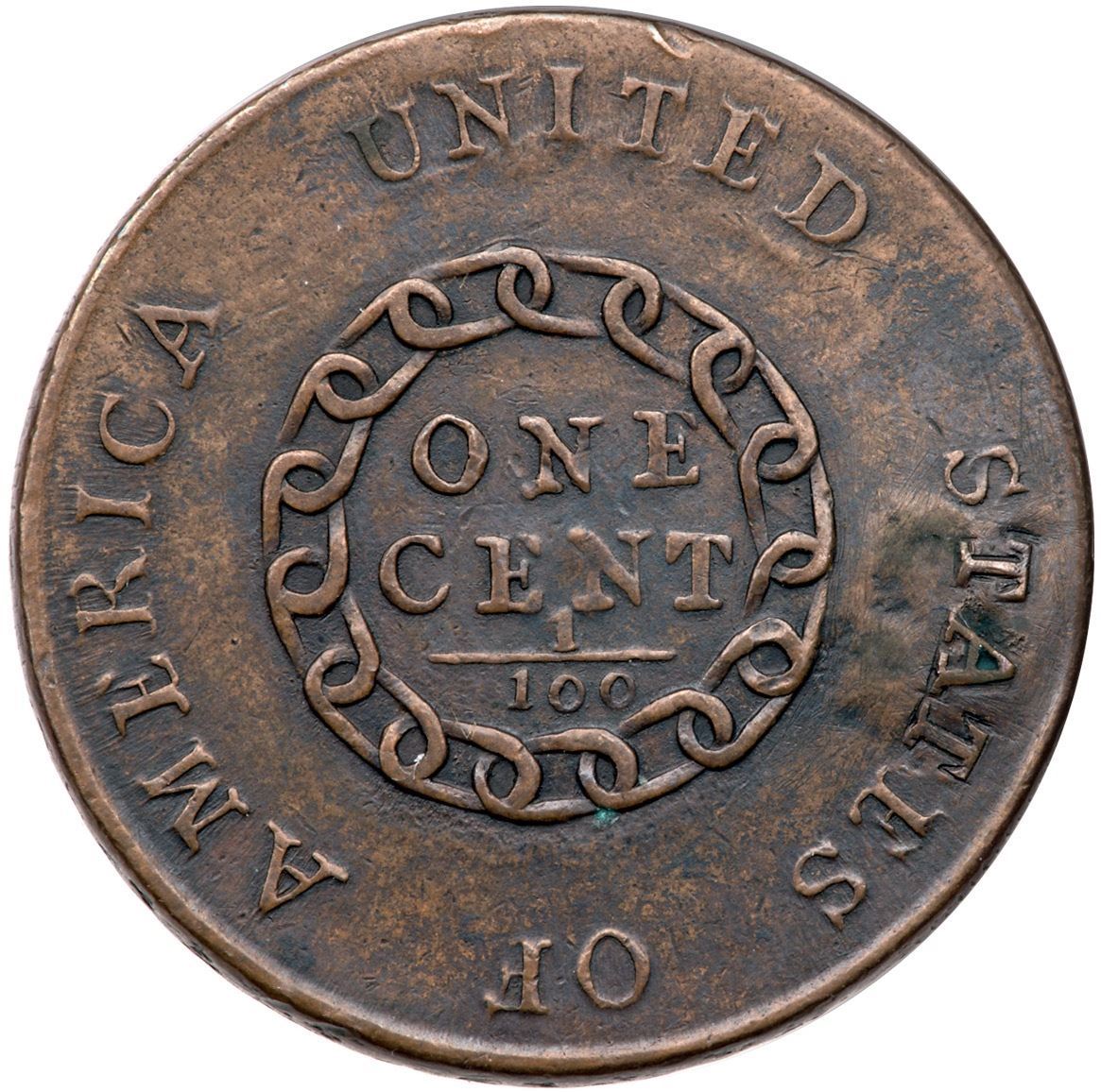 1793 S-3 R-3- Chain Cent RepairedVF sharpness but holed, plugged, and repaired with a clear plug before Liberty's mouth. Slightly indented on the plug, and the legends at TAT in STATES have been engraved. Otherwise tan brown and steel browns on smooth surfaces. The remaining legend and date are strong.Certificate Number: Pedigree: Ex; Bennet Hollenberg