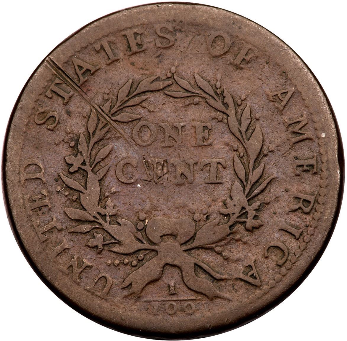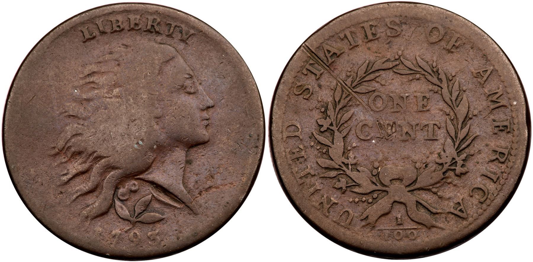 1793 S-6 R-3 Wreath Cent VG7A point or so sharper but there is a notable dig below the truncation of the bust as well as a scratch on the reverse between T A in STATES down through the wreath near O in ONE. The other notable marks include nicks on E in CENT and a couple minor, thin laminations off the bust tip and through the lower hair. Otherwise smooth, glossy surfaces. Chocolate and ruddy browns. Full date and legends/Certificate Number: Pedigree: Ex; Shawn Yancey EAC 2006 - Buck Burgess Collection