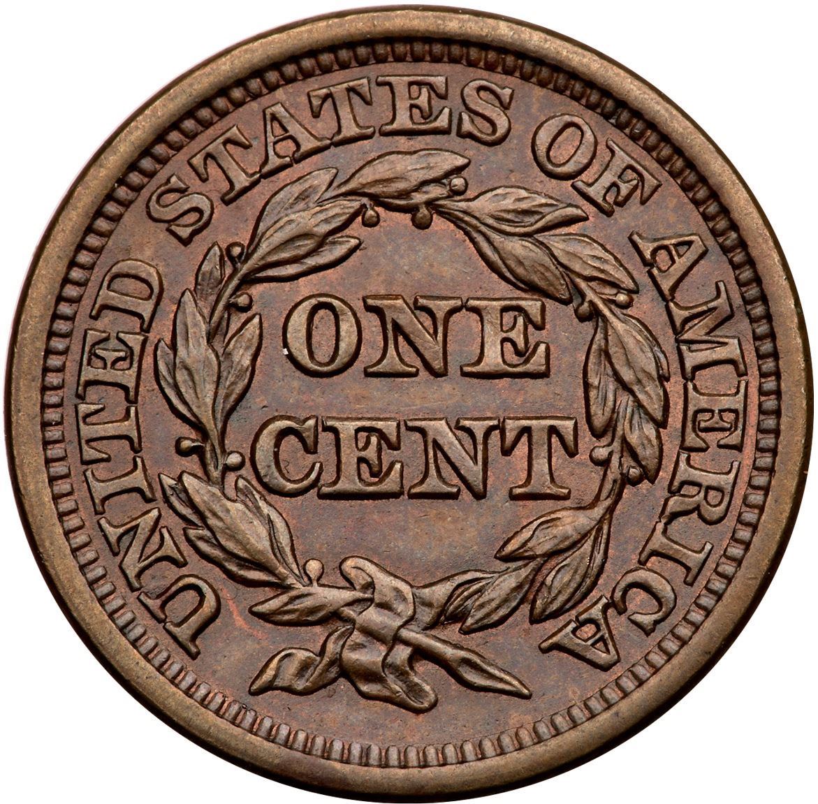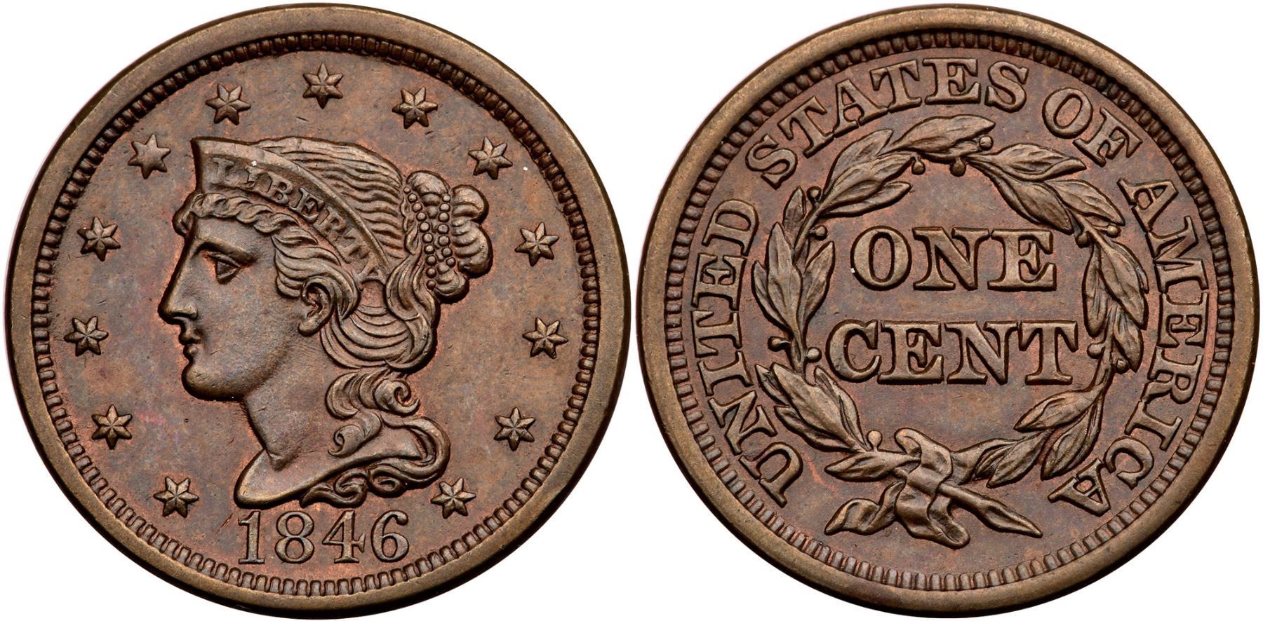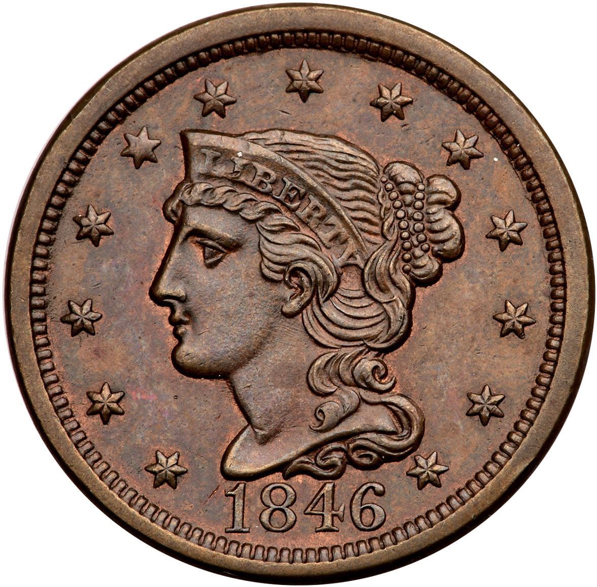 1846 N-12 R-1 Tall Date MS62Glossy bluish steel brown with traces of mint red in the protected areas. The notable marks are a small, thin flaw in the planchet left of the one, as struck, a tiny tick over I in LIBERTY, and a trivial rim bruise right of star 13. Rare EDS, die state a. Great eye appeal for the grade. Tied for CC#7 in the Grellman census.Certificate Number: Pedigree: Ex; M&G Auctions 10/1993:219 - R.S. Brown Jr M&G Auctions/Superior 6/2/2002:289 - Dan Holmes Collection Goldbergs 1/2011:145 - Buck Burgess